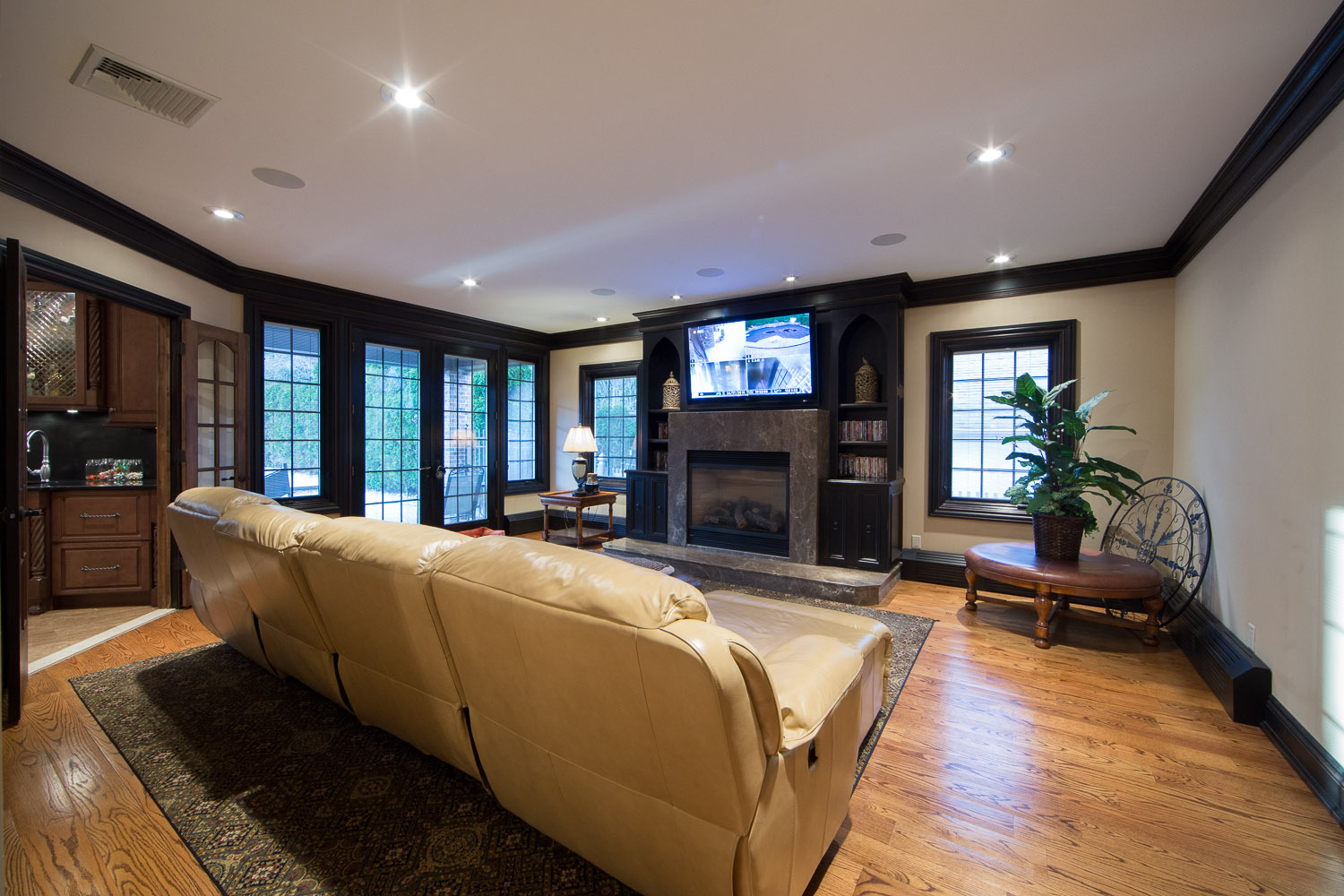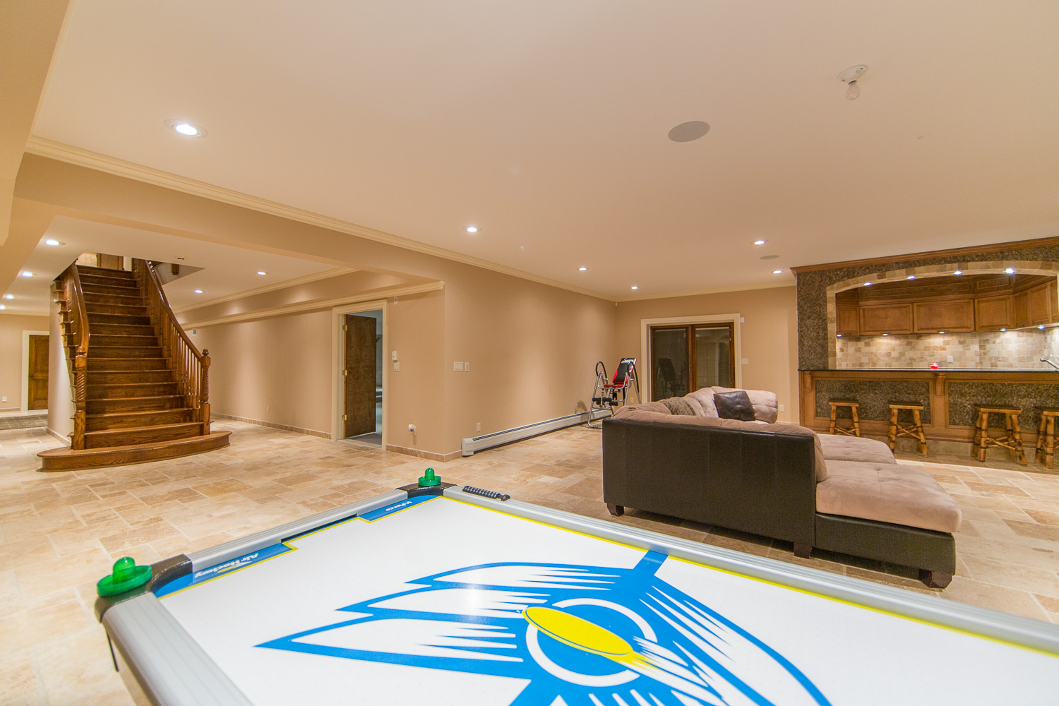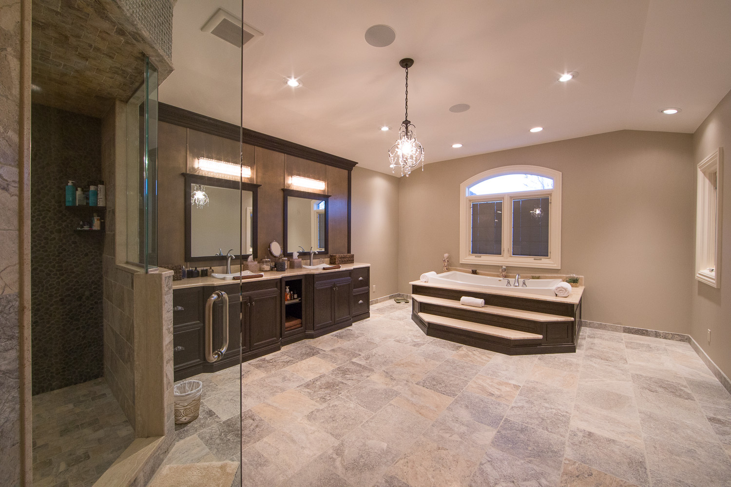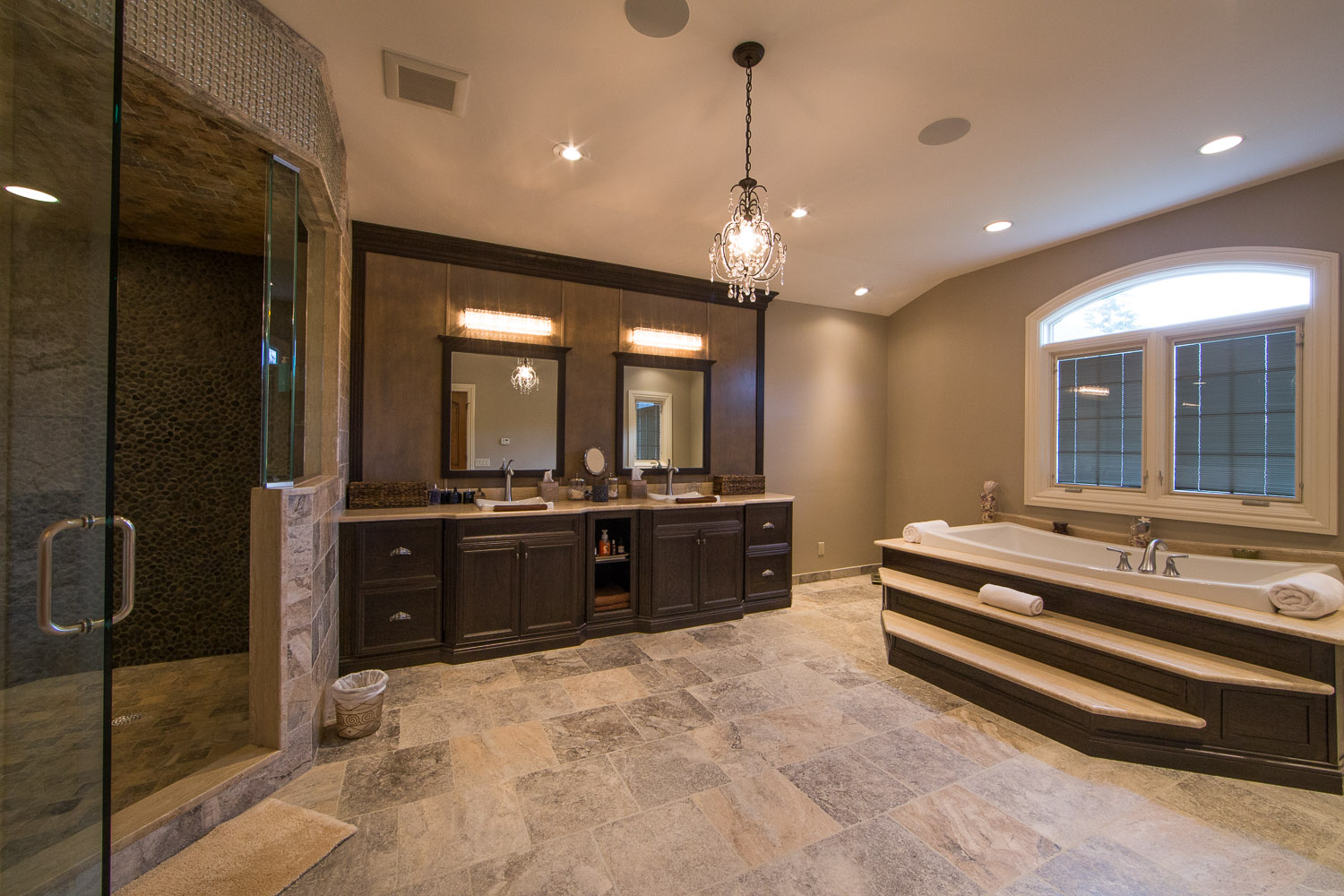 inside. Oversized gourmet kitchen, living room, great room & library. Everything is custom. Built in speakers all throughout, including the master suite and even the stone master shower! The walkout basement has a legitimate full size gym & spa w/ steam rm & sauna. Giant media rm, entertainment area, & another full bar. 21 zones of heat including nearly all stone surfaces, and much, much more!