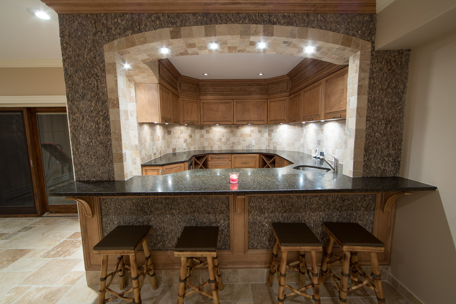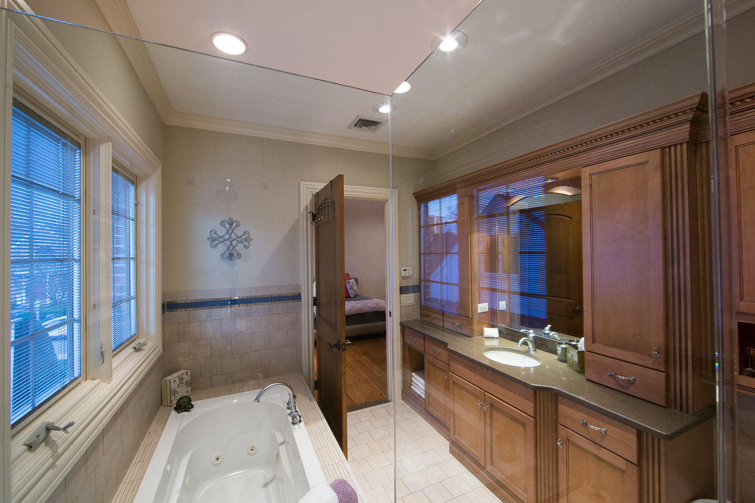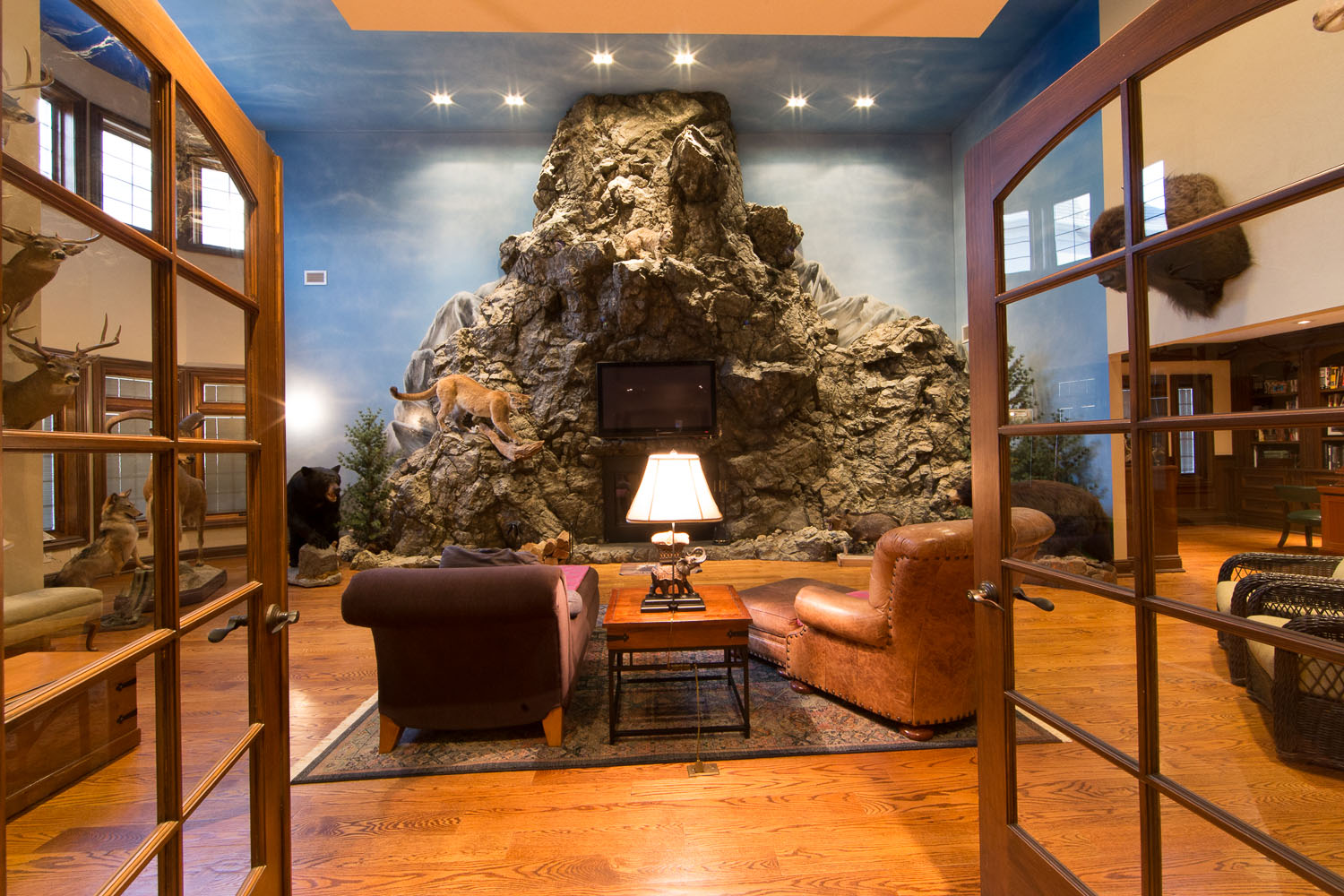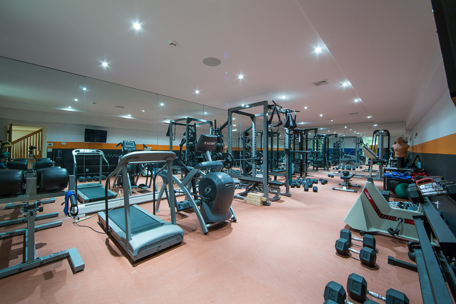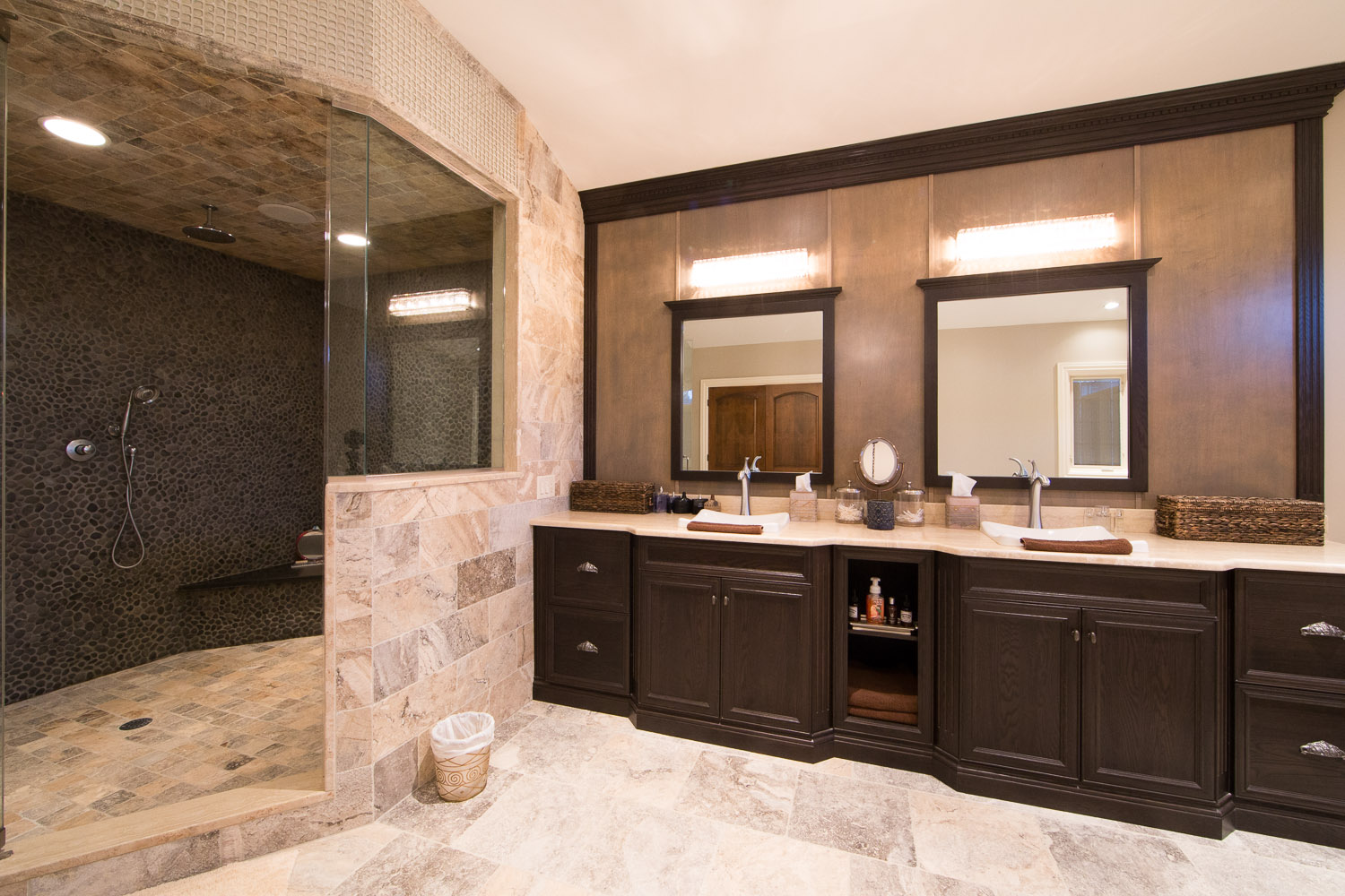inside. Oversized gourmet kitchen, living room, great room & library. Everything is custom. Built in speakers all throughout, including the master suite and even the stone master shower! The walkout basement has a legitimate full size gym & spa w/ steam rm & sauna. Giant media rm, entertainment area, & another full bar. 21 zones of heat including nearly all stone surfaces, and much, much more!