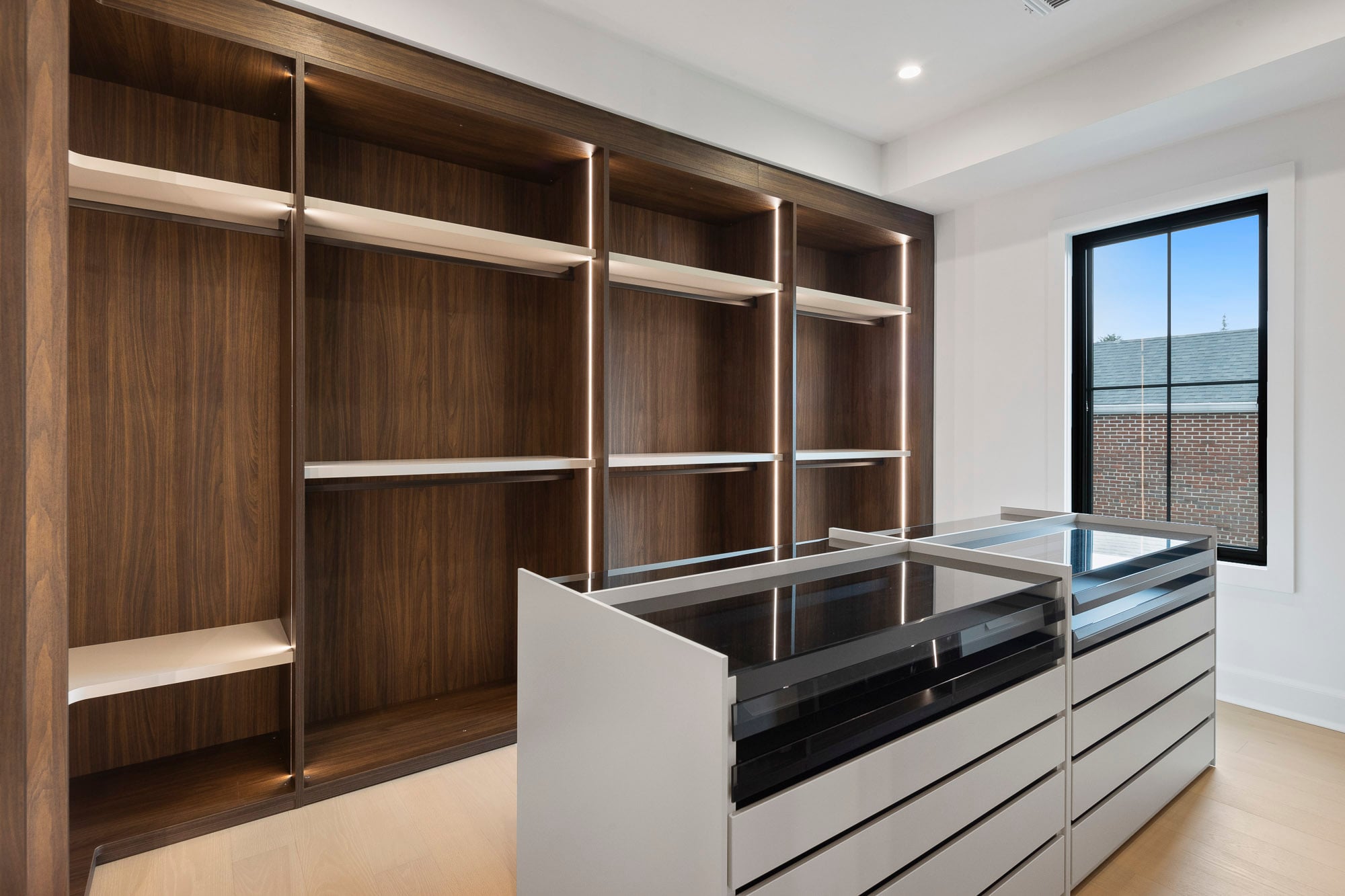 The second level centers around a primary suite with custom-built, furniture-grade walk-in closets and a spa-style bath with a freestanding tub and oversized glass-enclosed shower. Four additional en-suite bedrooms and a laundry room complete this floor.