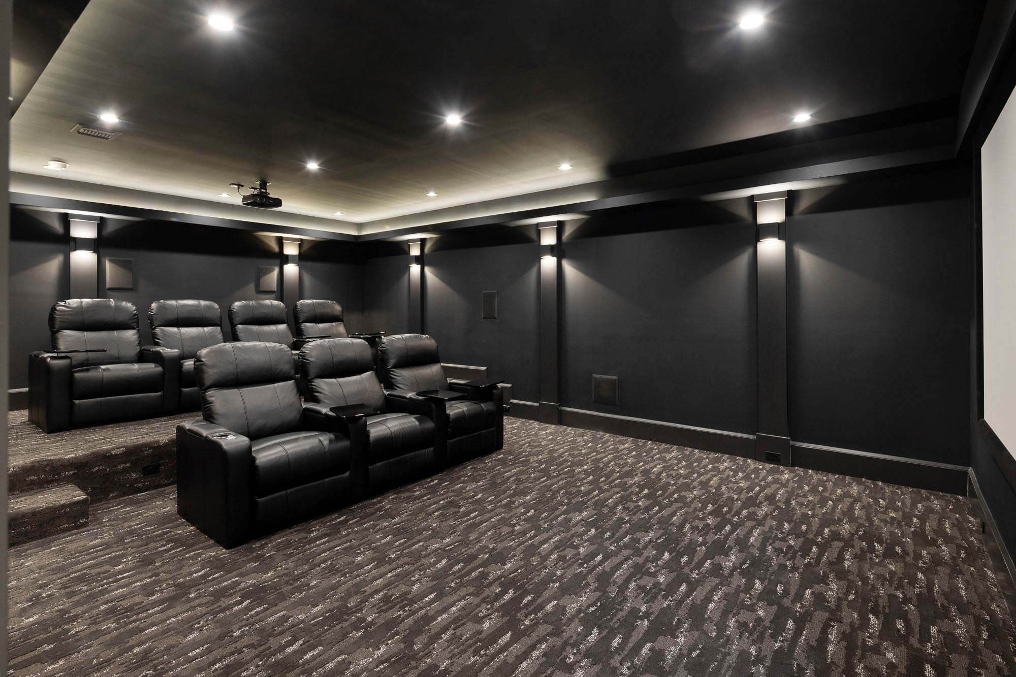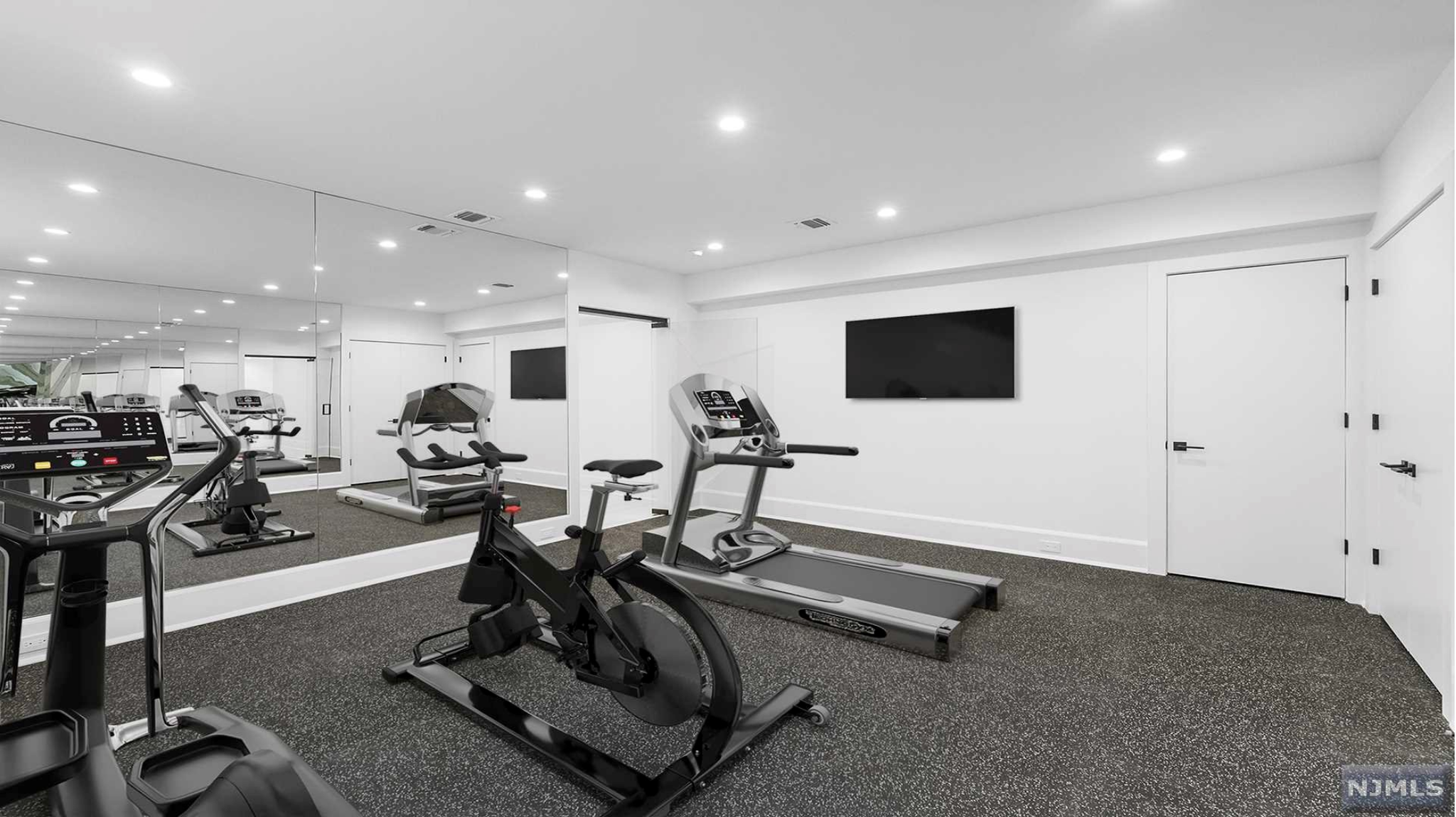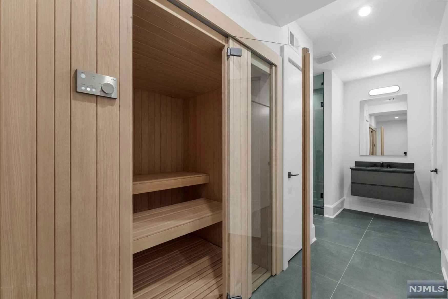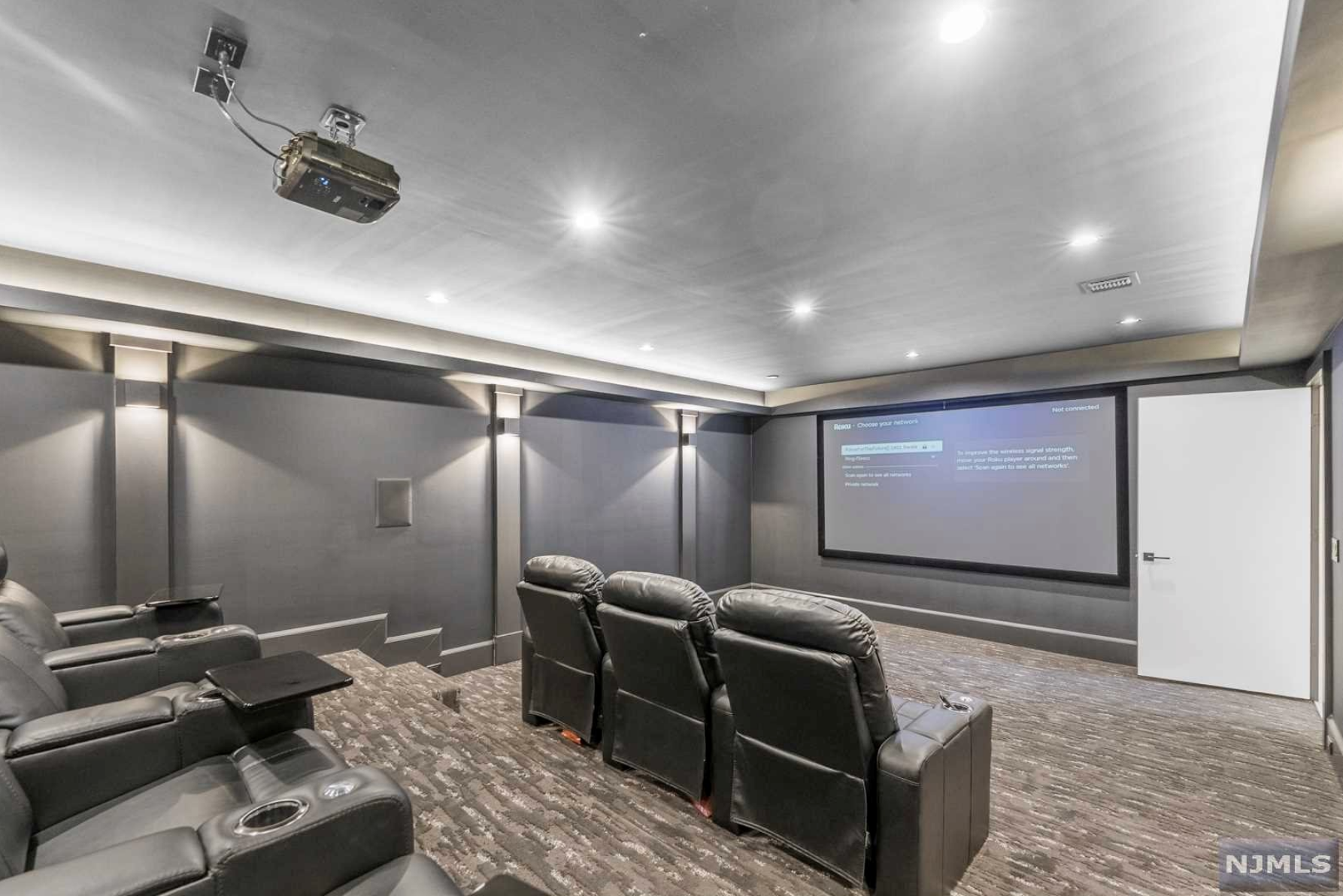 The lower level is designed for recreation and wellness, offering a home theater, fitness room, sauna with steam shower, massage room, wet bar, additional bedroom, and full bath, providing a comprehensive extension of the home’s living space.
