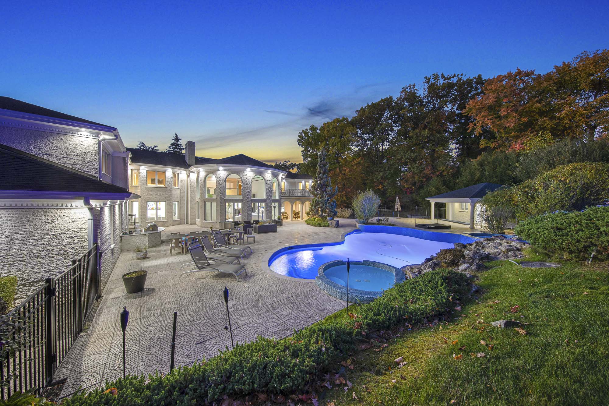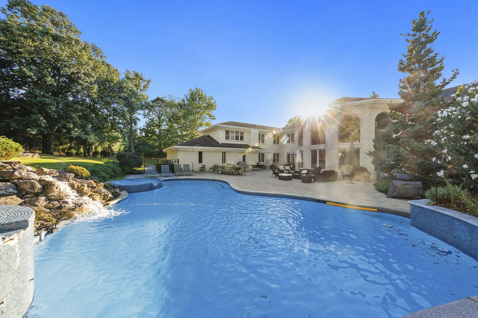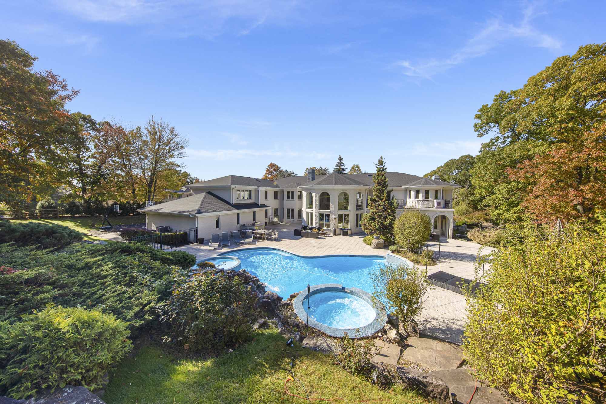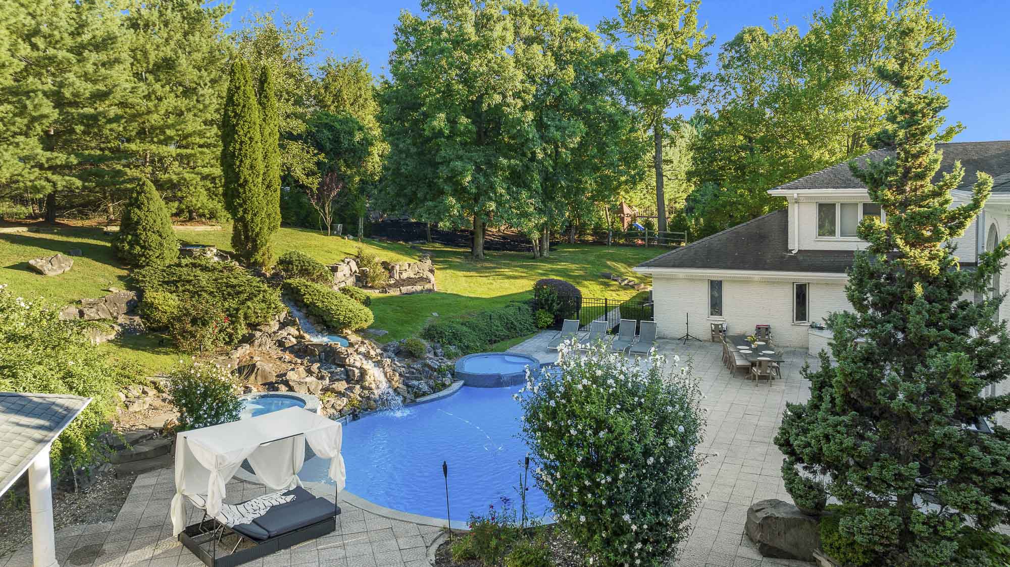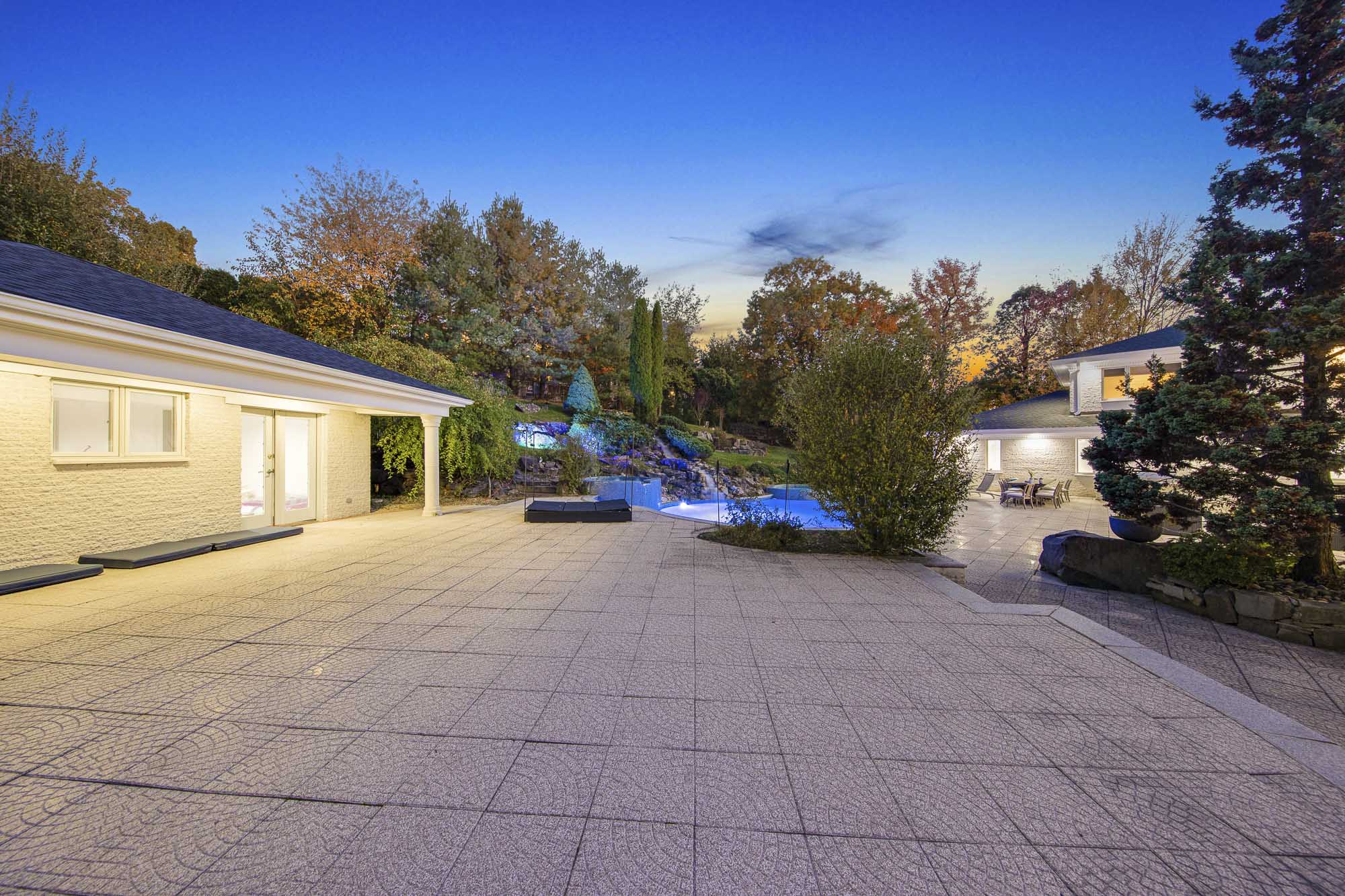 Spanning over 15,000 square feet, the impressive floor plan is elevator-ready and designed for both grand-scale entertaining and everyday comfort. The property showcases a stunning outdoor oasis complete with a swimming pool, waterfall feature, hot tub, dedicated children’s pool, sauna, and a large stone fire pit—creating a true private retreat.