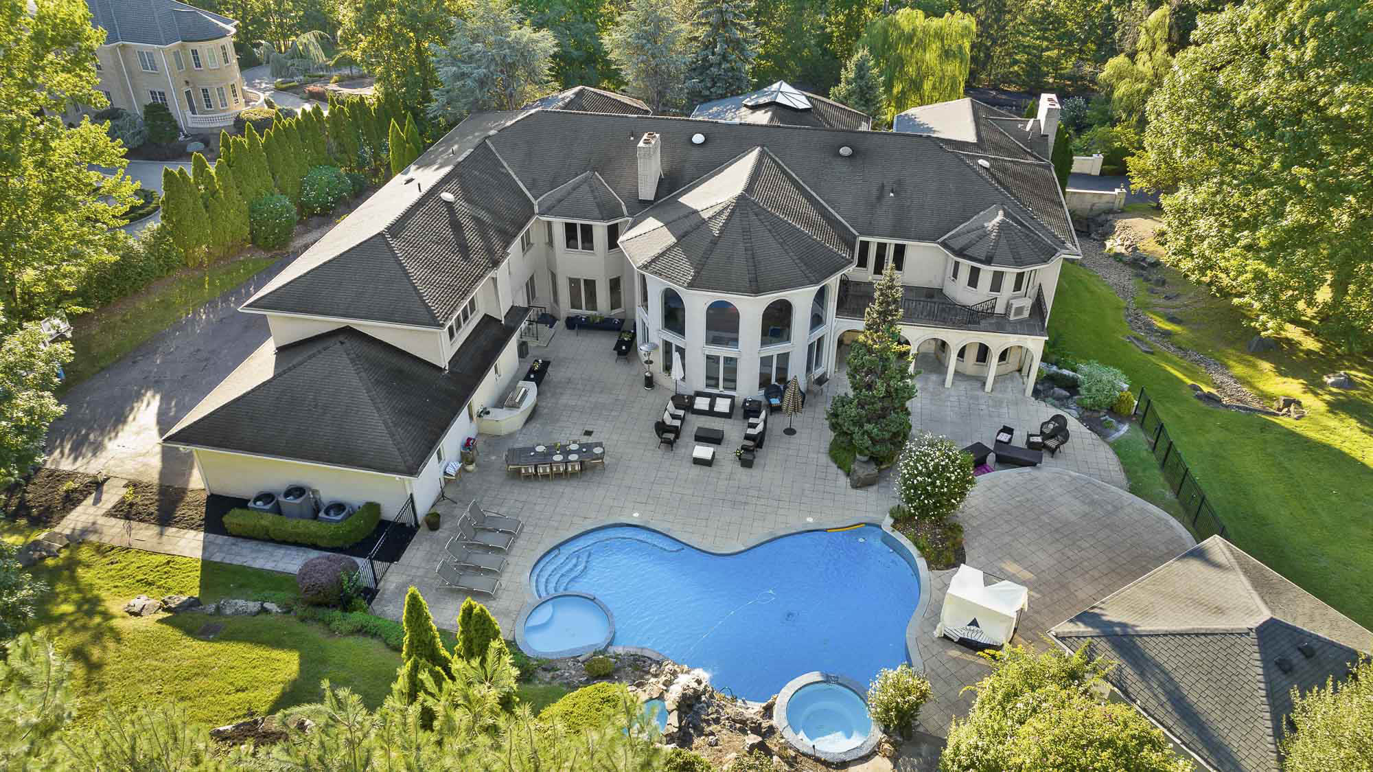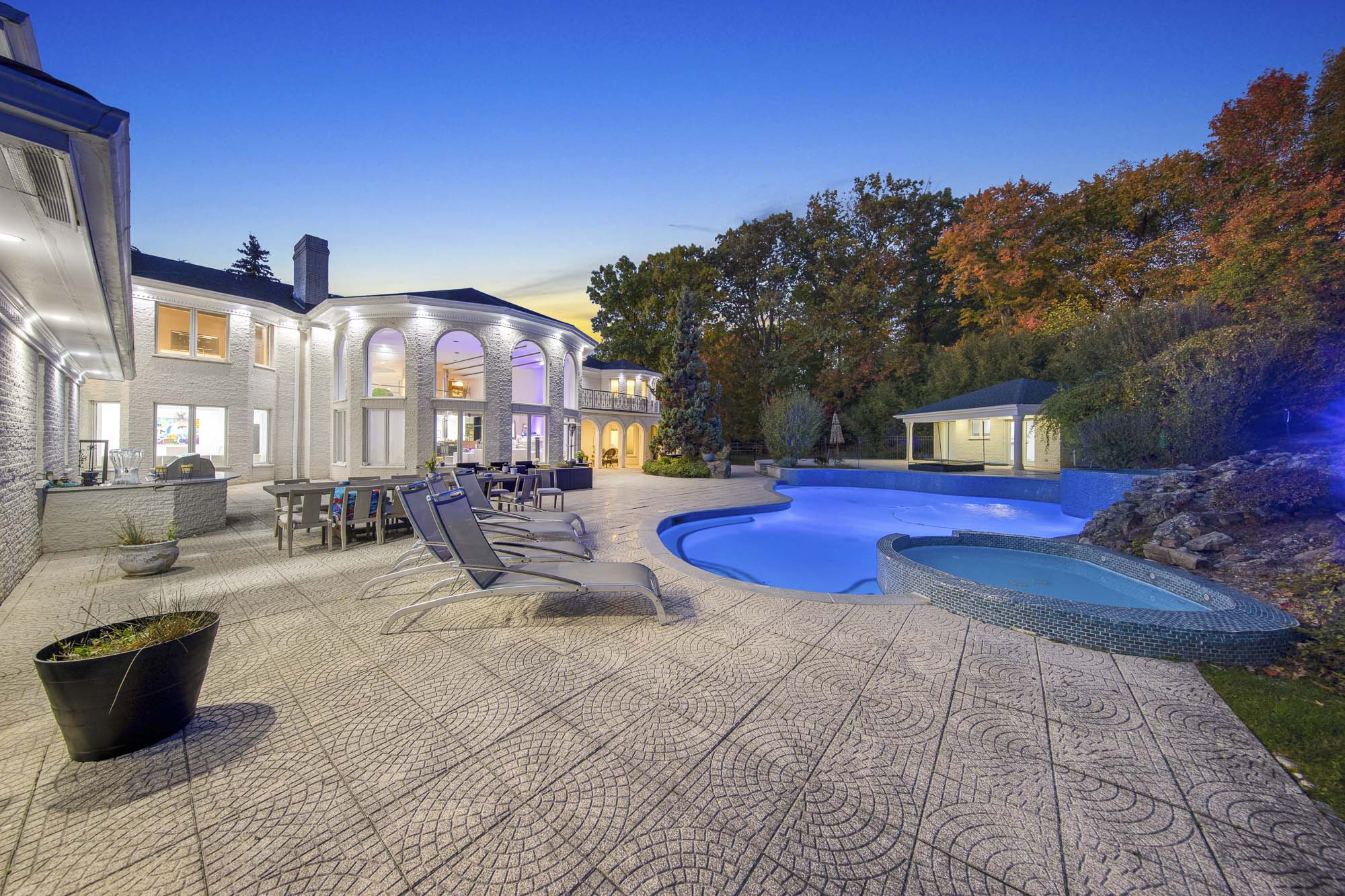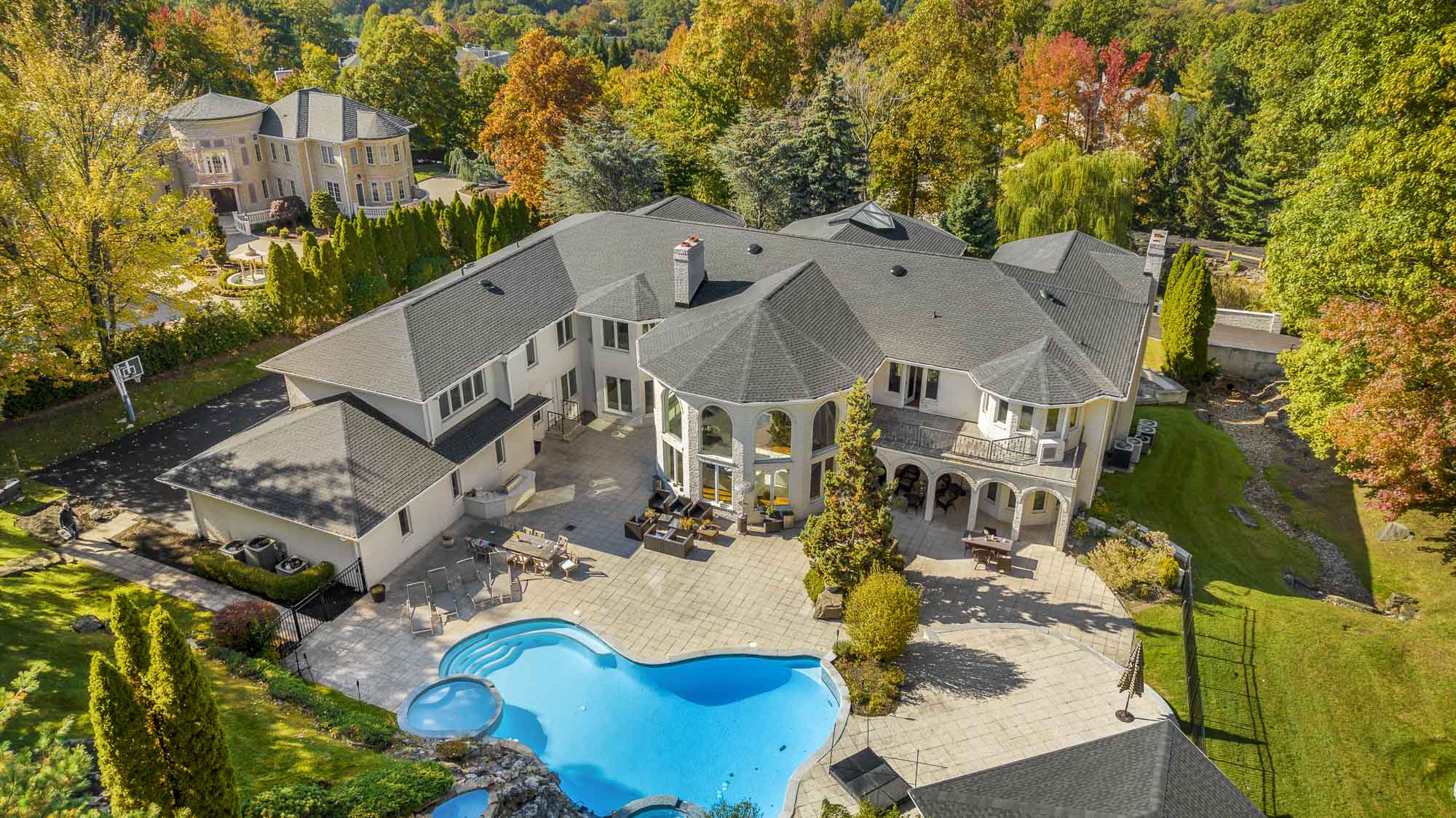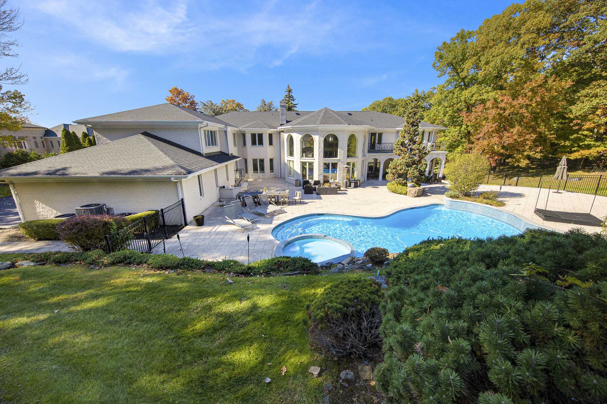 Spanning over 15,000 square feet, the impressive floor plan is elevator-ready and designed for both grand-scale entertaining and everyday comfort. The property showcases a stunning outdoor oasis complete with a swimming pool, waterfall feature, hot tub, dedicated children’s pool, sauna, and a large stone fire pit—creating a true private retreat.