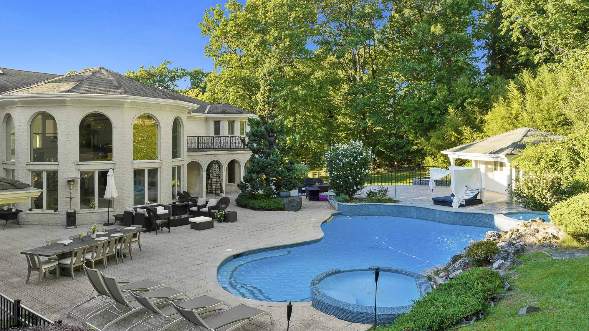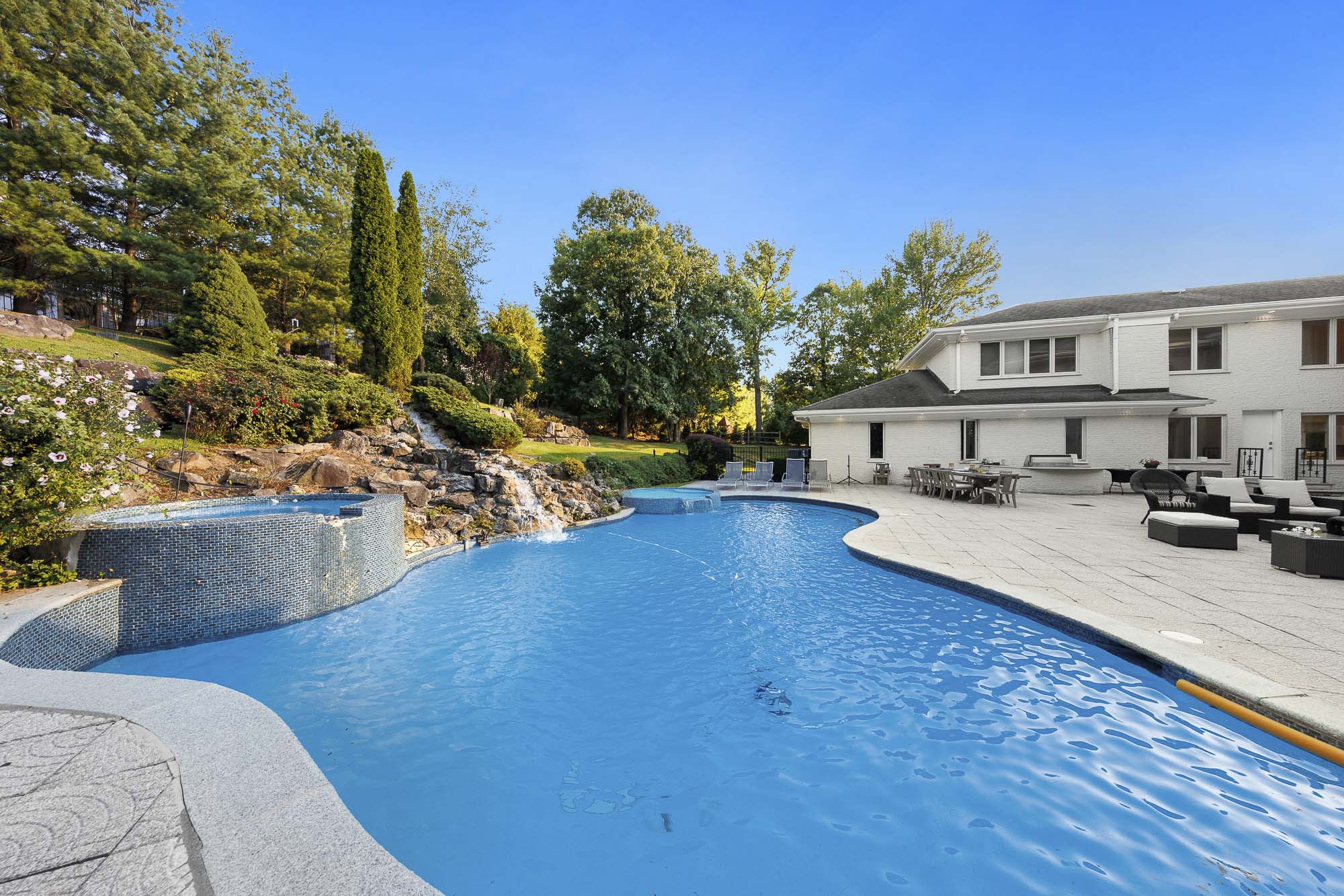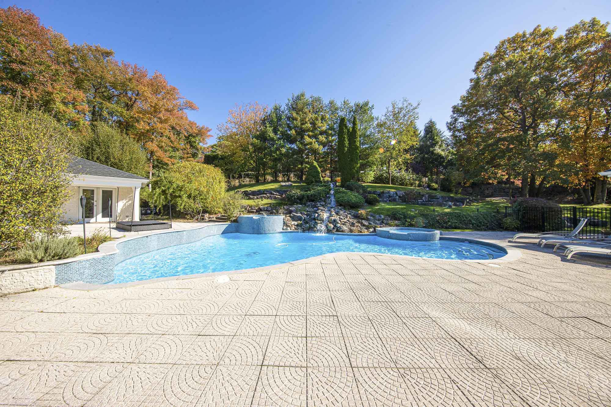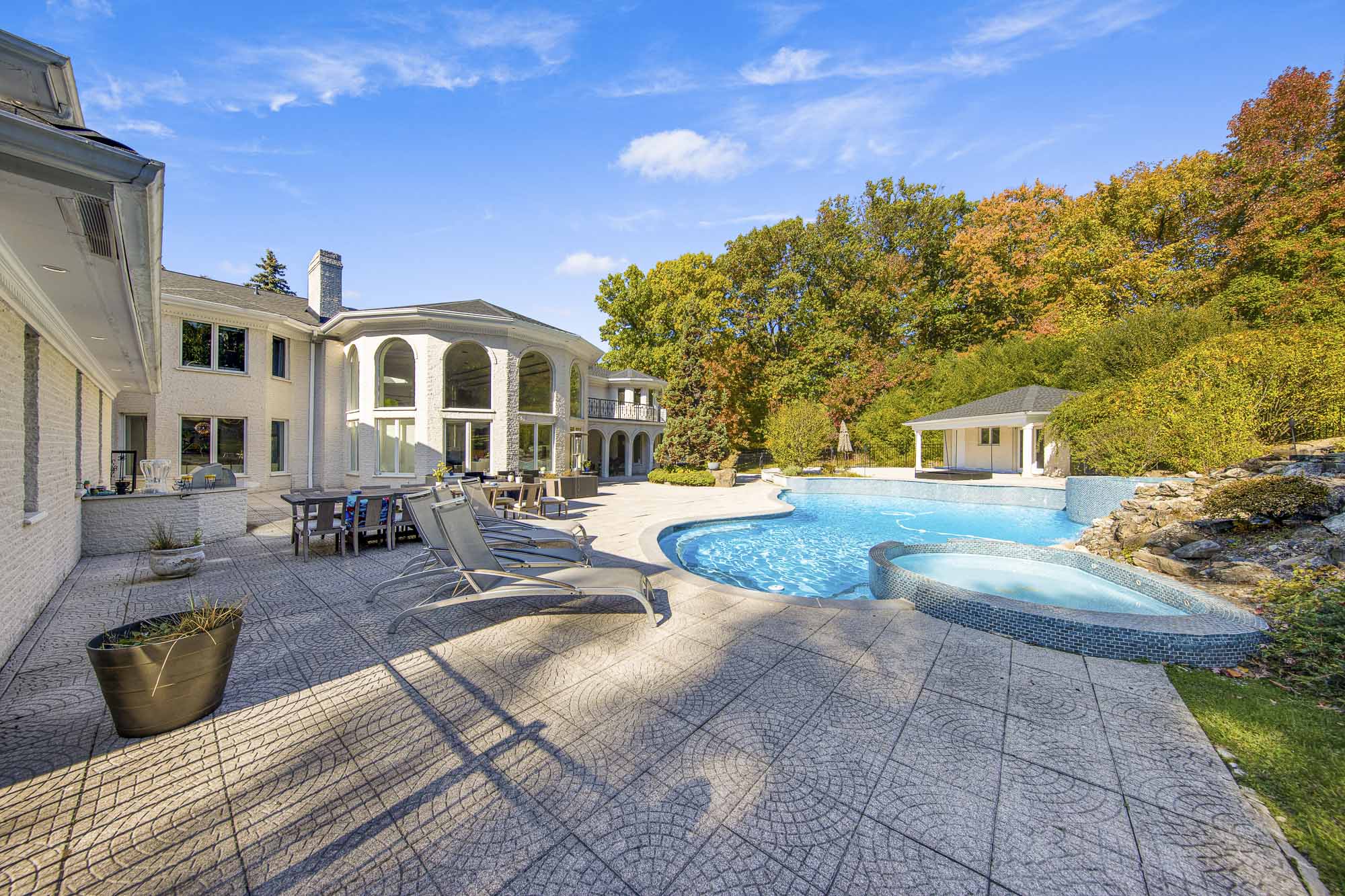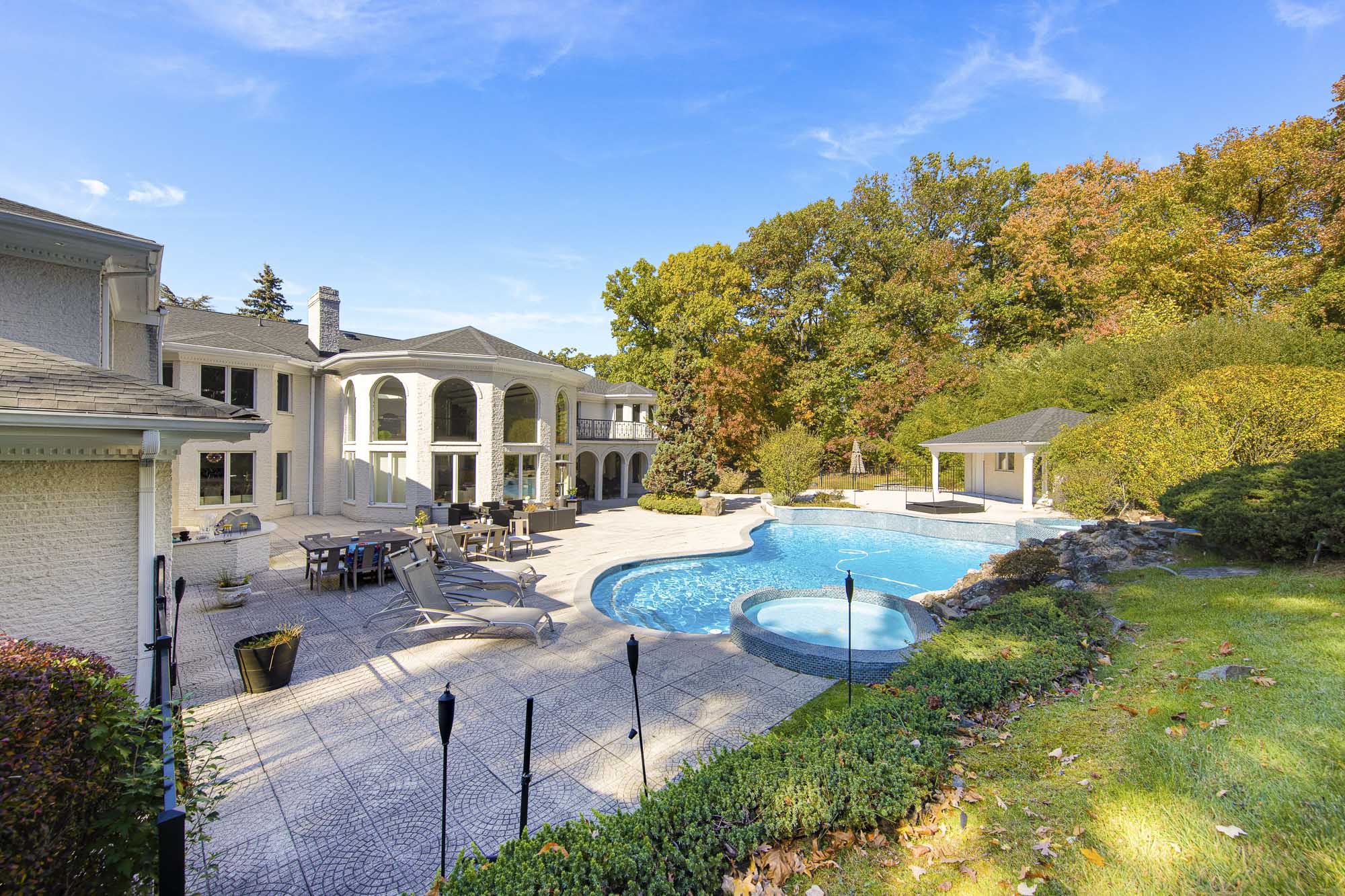 Spanning over 15,000 square feet, the impressive floor plan is elevator-ready and designed for both grand-scale entertaining and everyday comfort. The property showcases a stunning outdoor oasis complete with a swimming pool, waterfall feature, hot tub, dedicated children’s pool, sauna, and a large stone fire pit—creating a true private retreat.