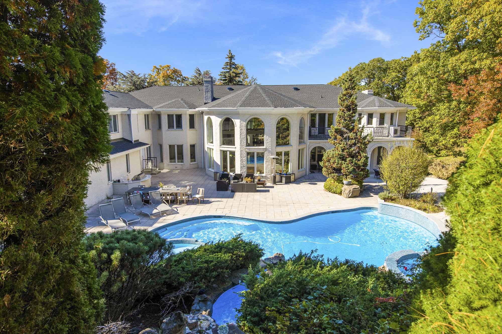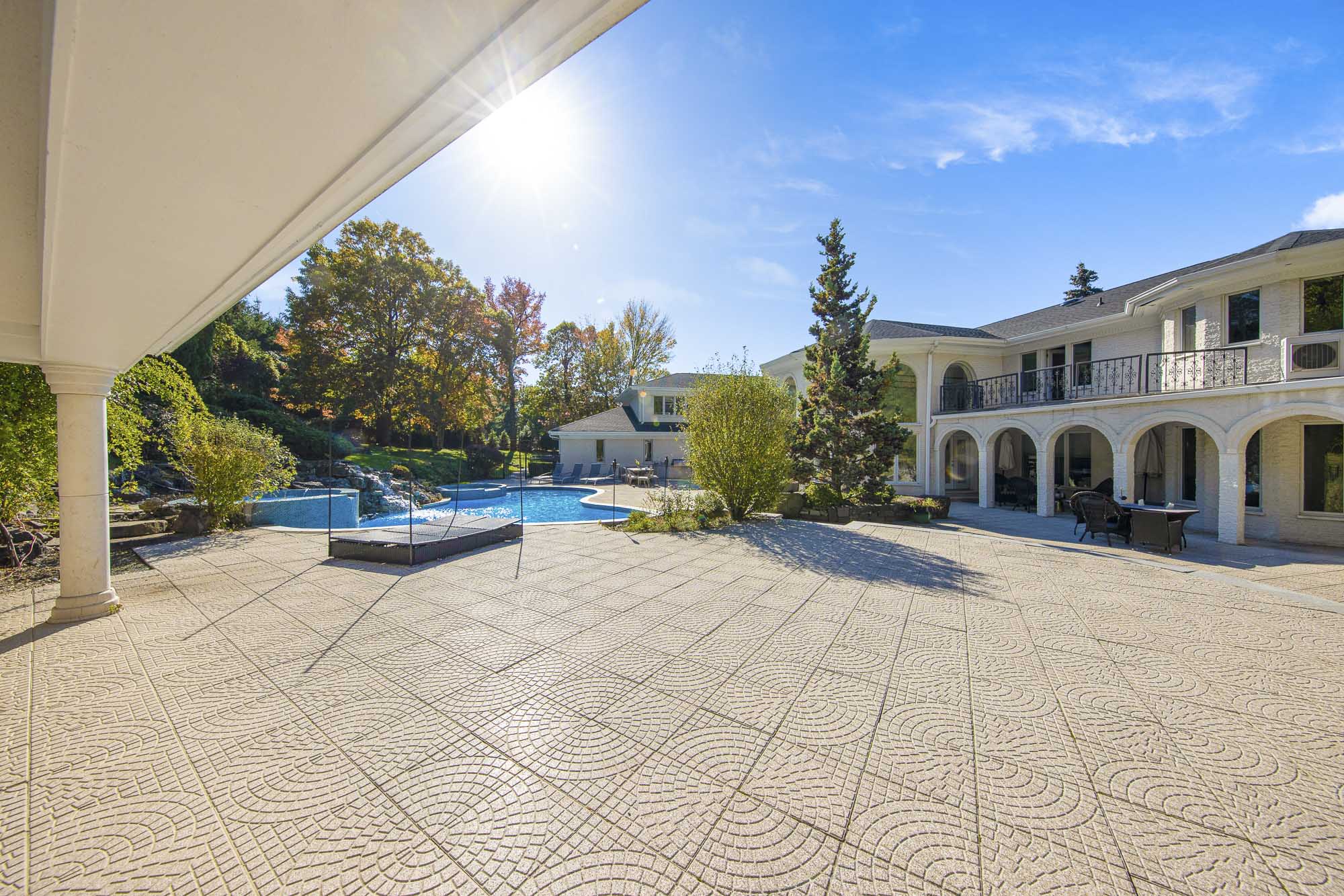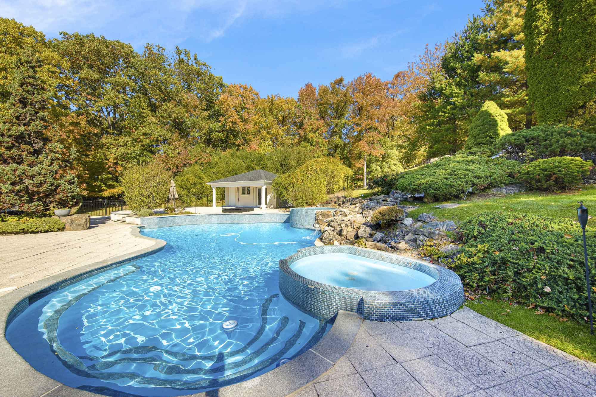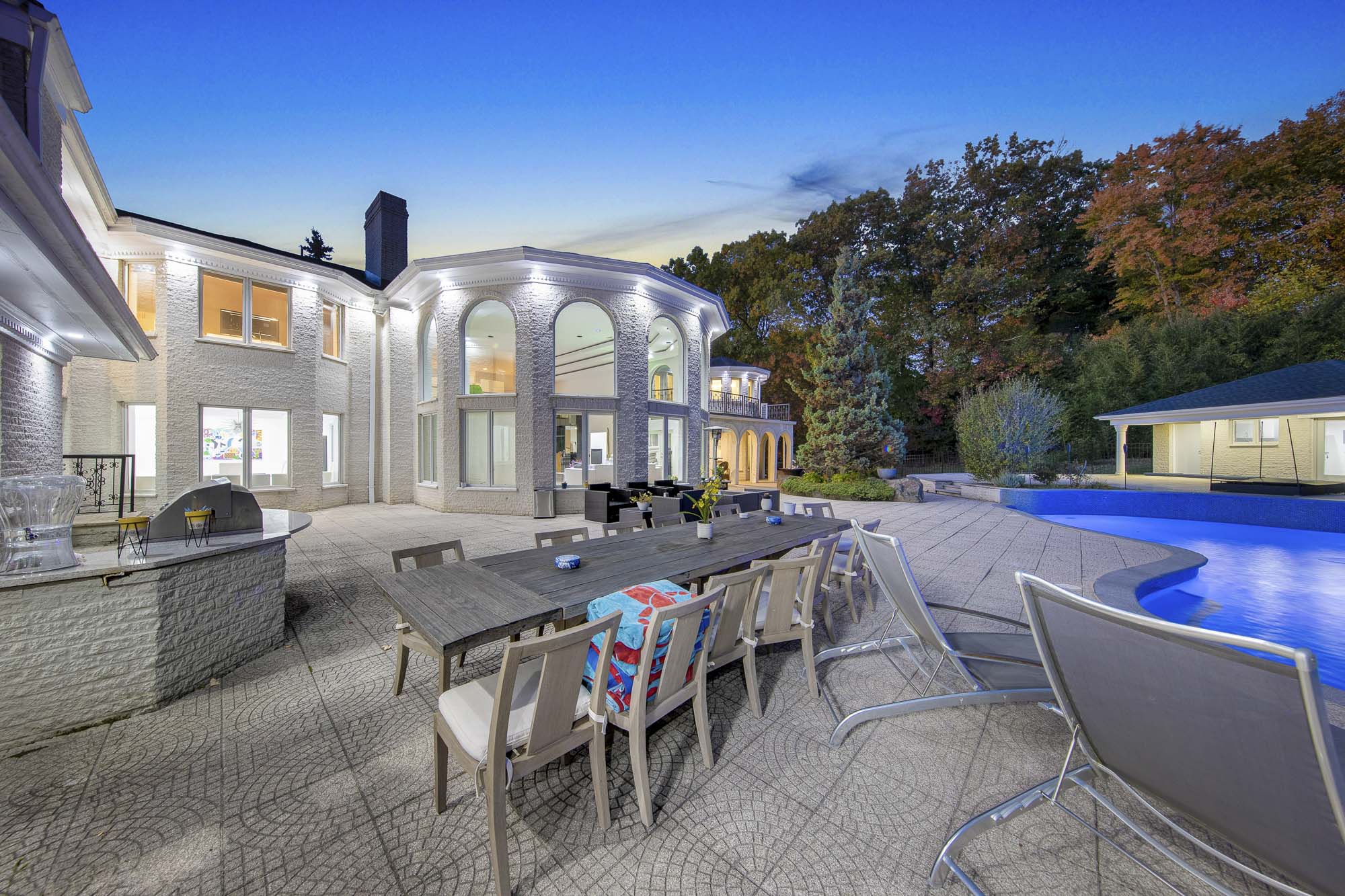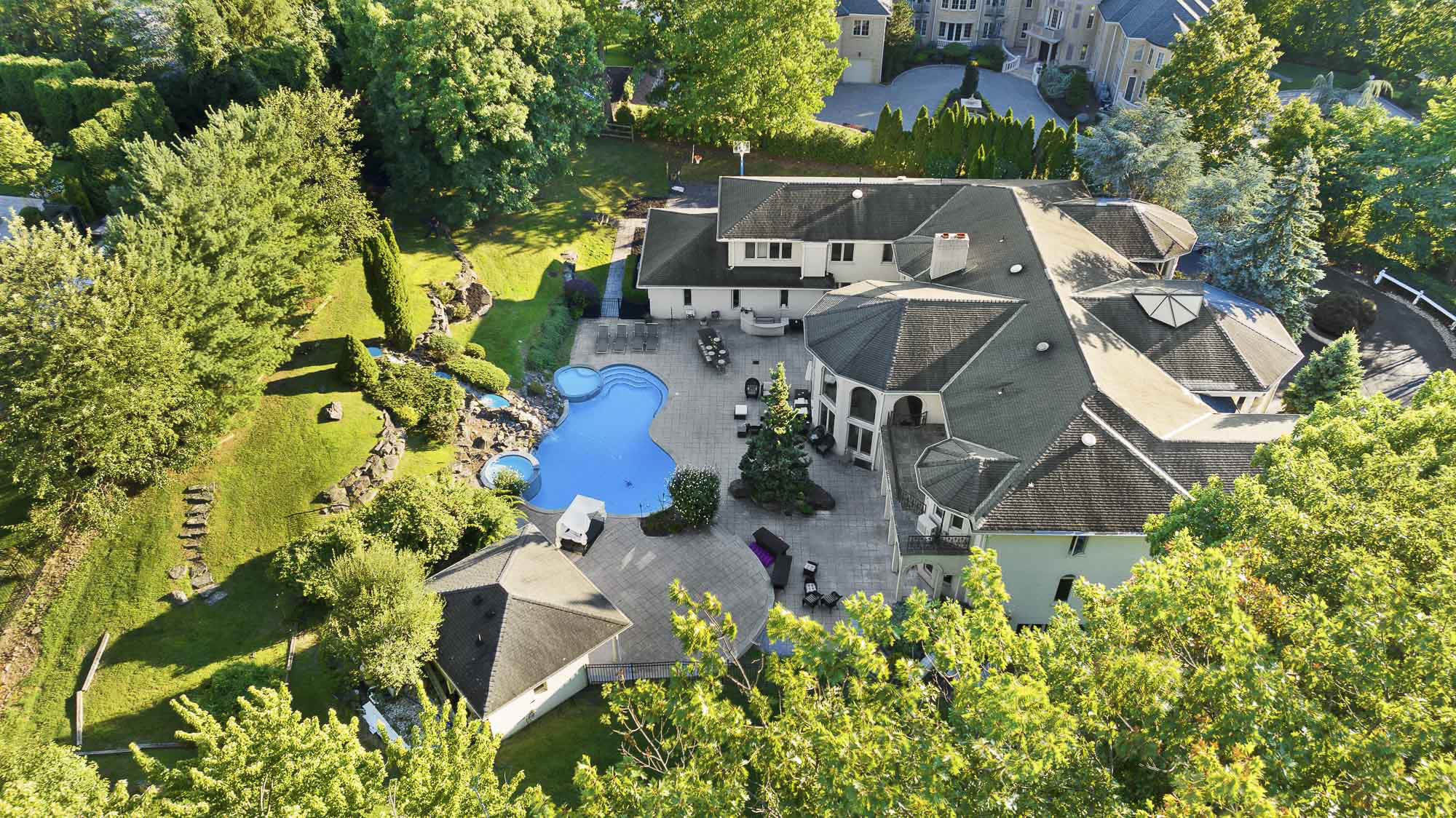 Spanning over 15,000 square feet, the impressive floor plan is elevator-ready and designed for both grand-scale entertaining and everyday comfort. The property showcases a stunning outdoor oasis complete with a swimming pool, waterfall feature, hot tub, dedicated children’s pool, sauna, and a large stone fire pit—creating a true private retreat.