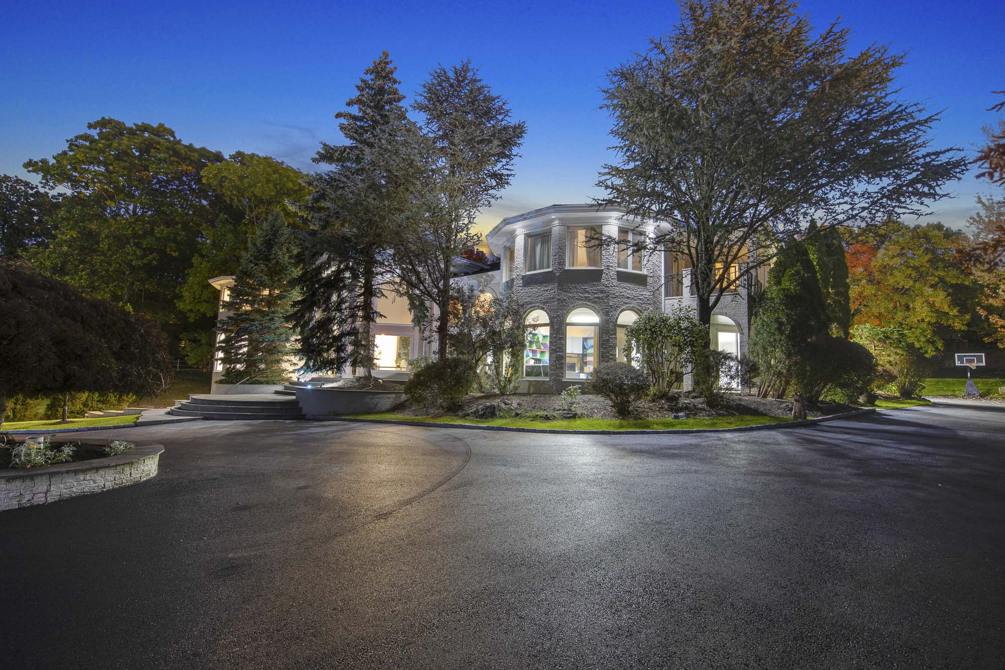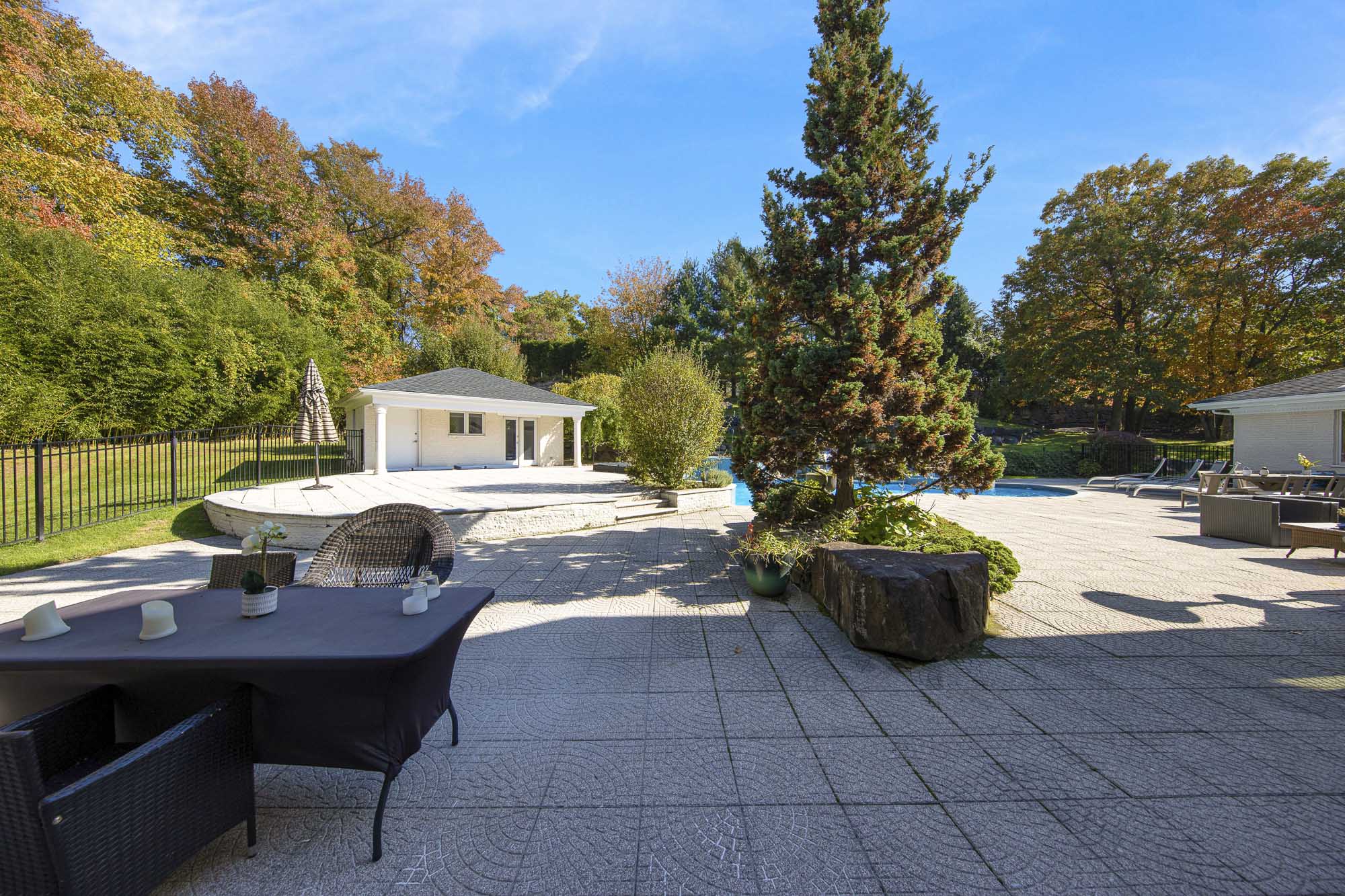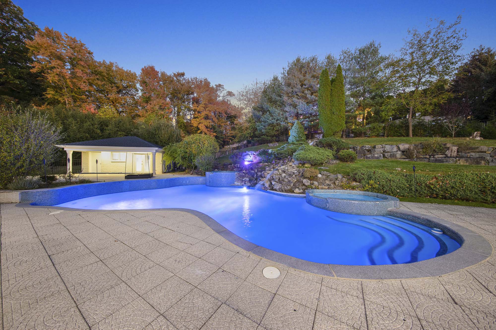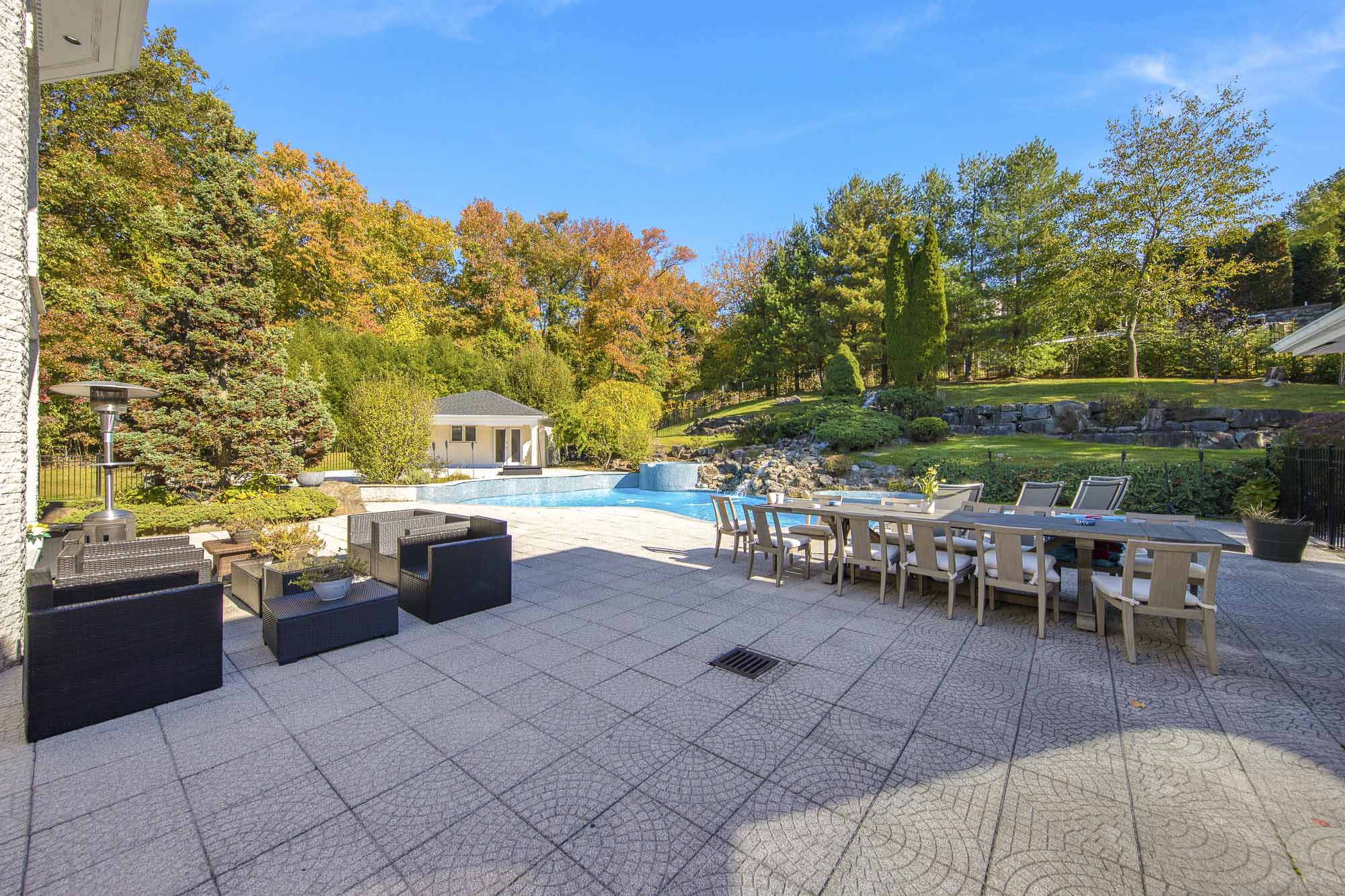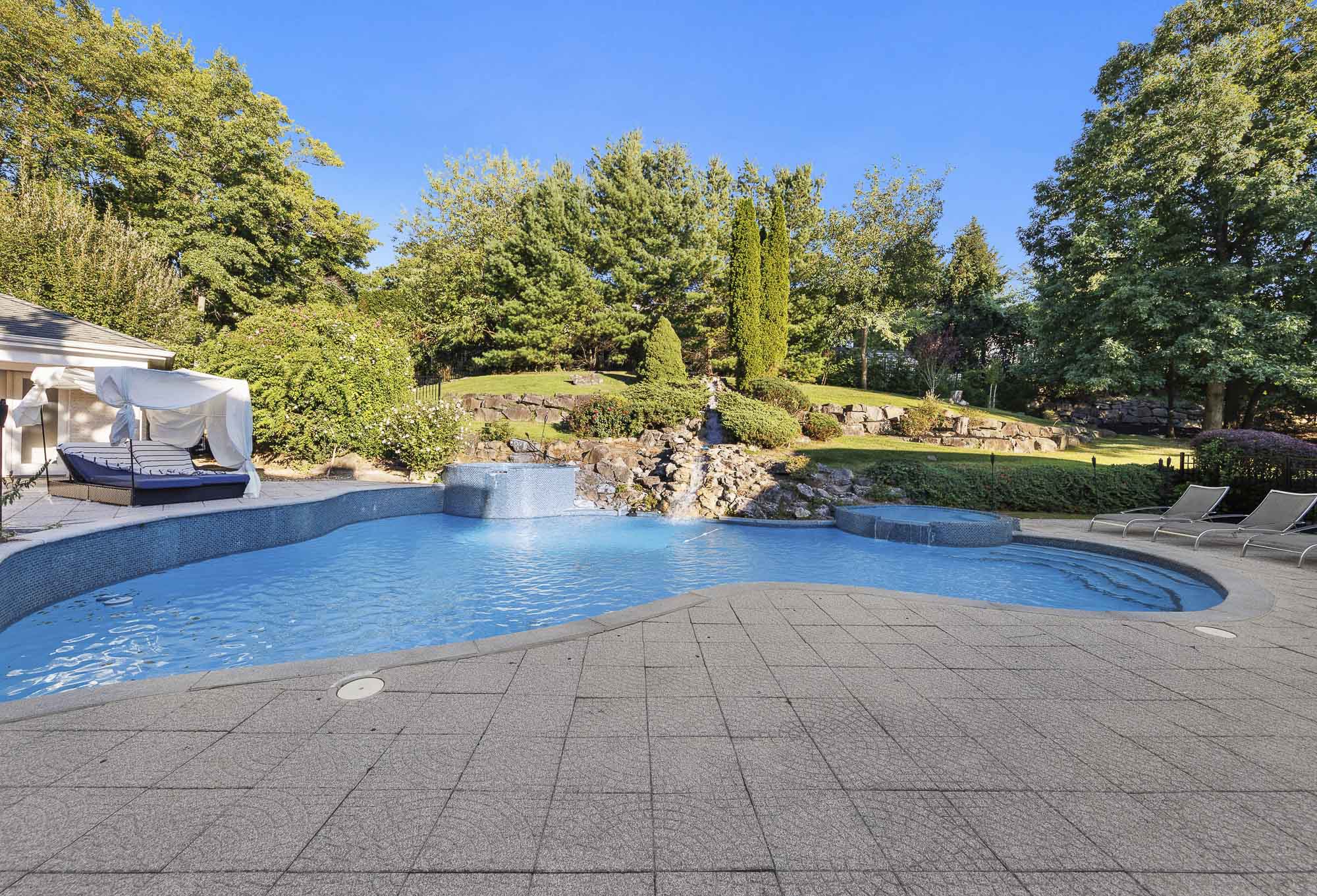 Spanning over 15,000 square feet, the impressive floor plan is elevator-ready and designed for both grand-scale entertaining and everyday comfort. The property showcases a stunning outdoor oasis complete with a swimming pool, waterfall feature, hot tub, dedicated children’s pool, sauna, and a large stone fire pit—creating a true private retreat.
