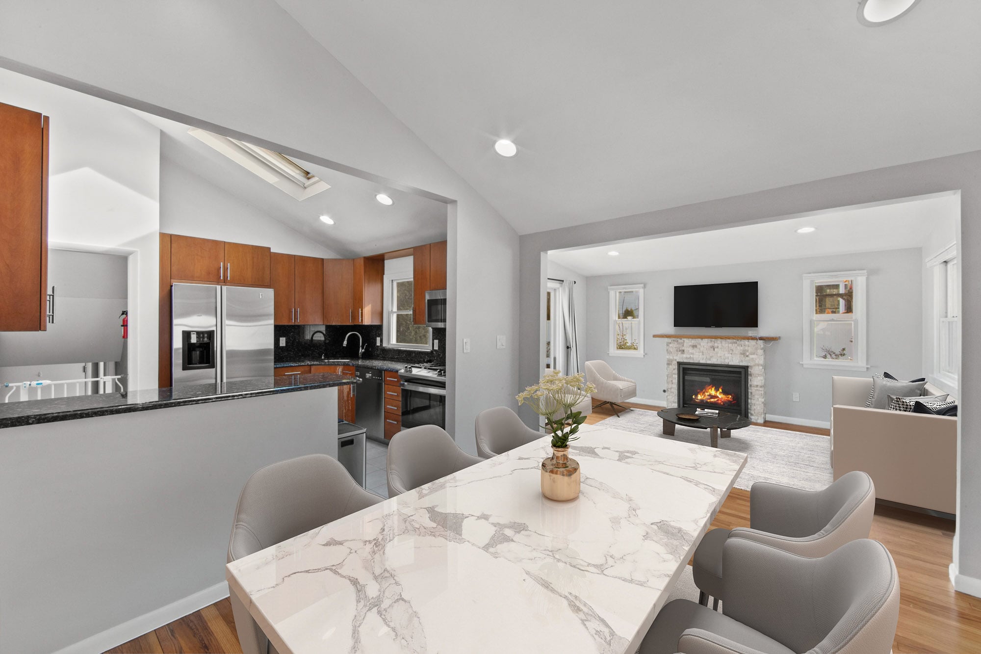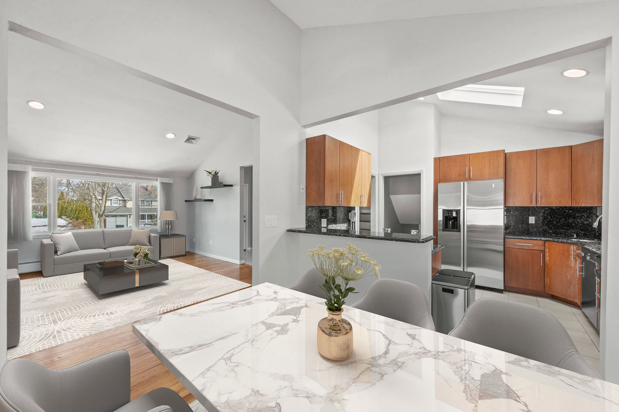 Set on quiet cul-de-sac in Paramus, this renovated & expanded split-level home offers comfortable living w/a practical & flexible layout. The property sits on an approximately 88.5' x 106' lot, providing a well-sized setting in a peaceful residential location. The home features a large living & dining room w/vaulted ceilings & expanded family room w/gas fireplace & sliding glass doors to the private back patio (w/ bbq gas line) & fenced in yard. Upstairs is a generous primary suite w/walk in closet & renovated marble & porcelain bathroom, plus 2 more large bedrooms & a 2nd full bathroom. At grade level, you'll find a conveniently located half bath & laundry room that offers potential for expansion to a full bathroom if desired. There is also a bonus room that could be used as a 4th bedroom, office, or playroom and, lastly, an oversized 2 car garage. A finished lower level adds additional living space & storage, ideal for recreation, media or a secondary family area. A separate bonus room provides further flexibility & can easily function as a home office, music room or guest space depending on needs. Updates include new roof (2021) & water softener system (2017) w/new filter installed (2022). Located on a low-traffic cul-de-sac while remaining close to Paramus shopping, dining, parks & major highways, this home offers a balance of privacy, convenience, and adaptable living space.
