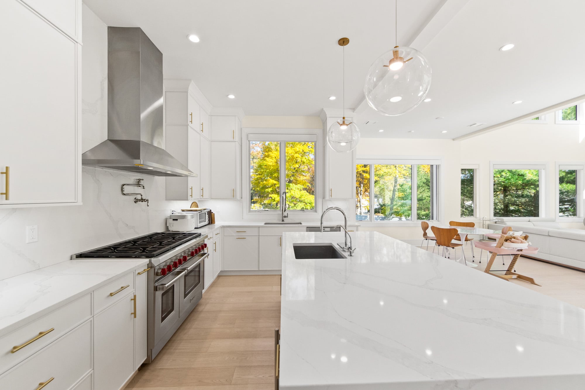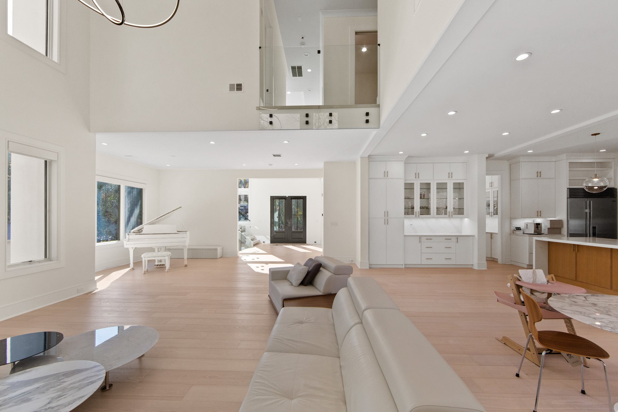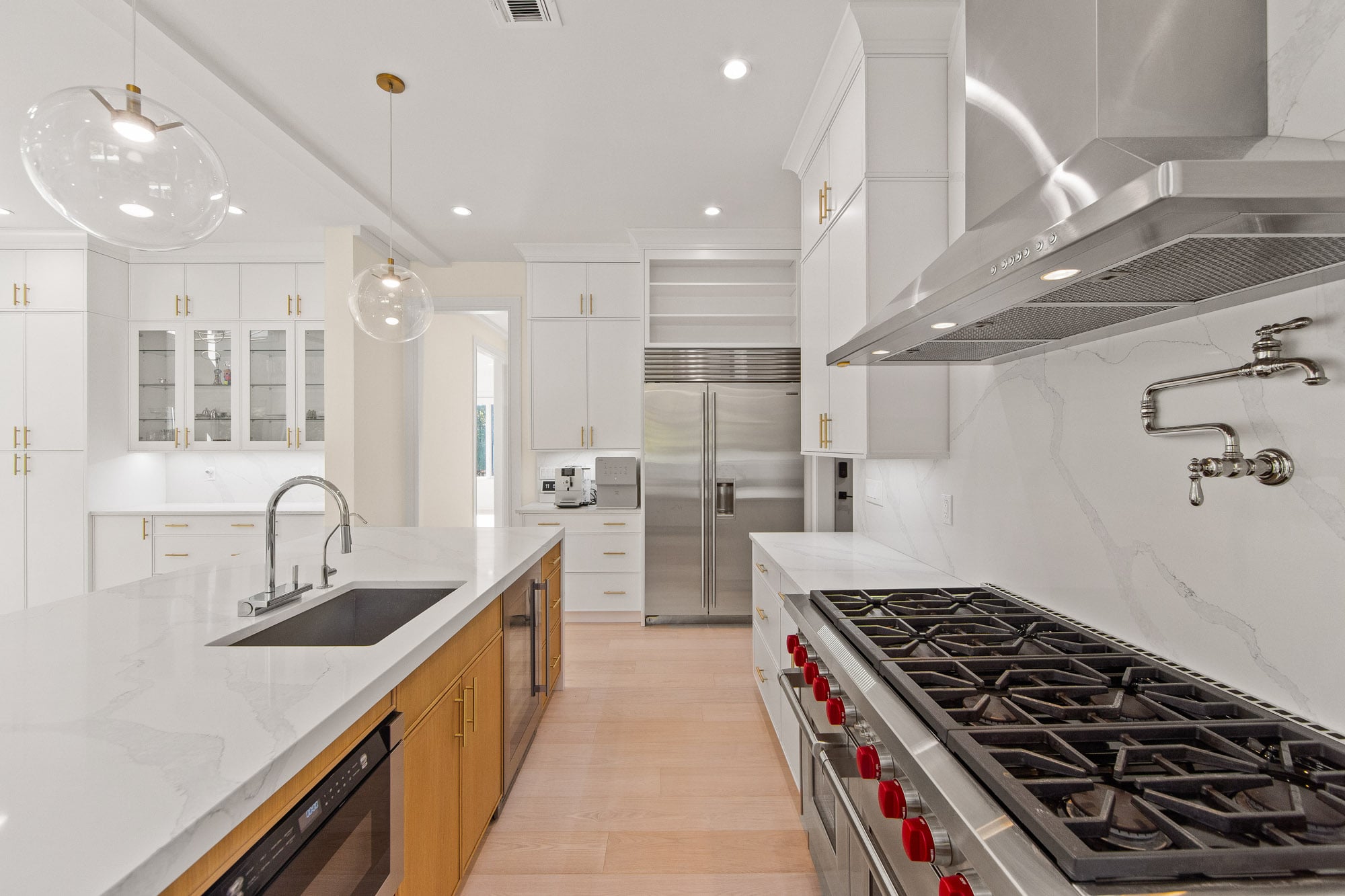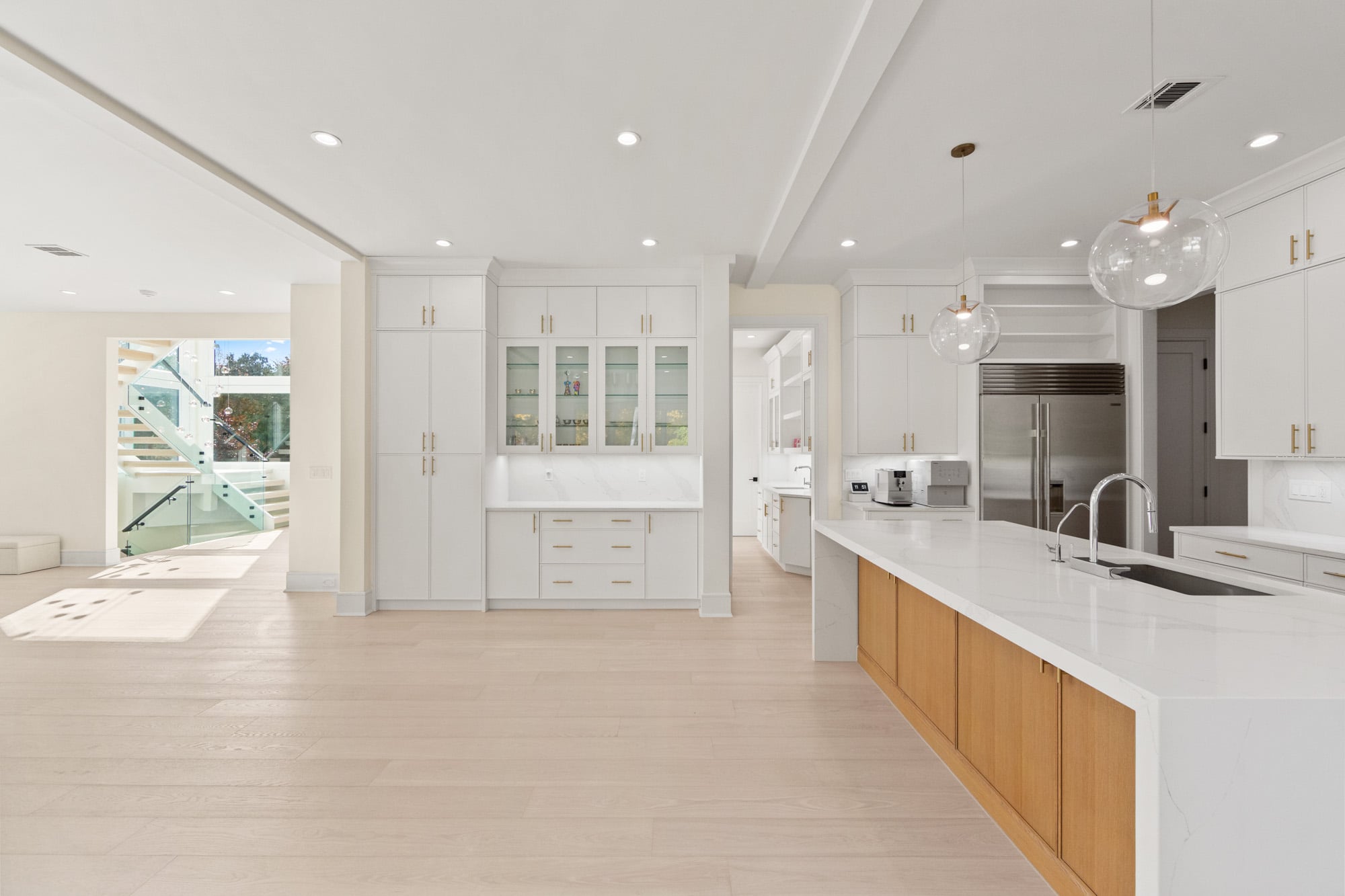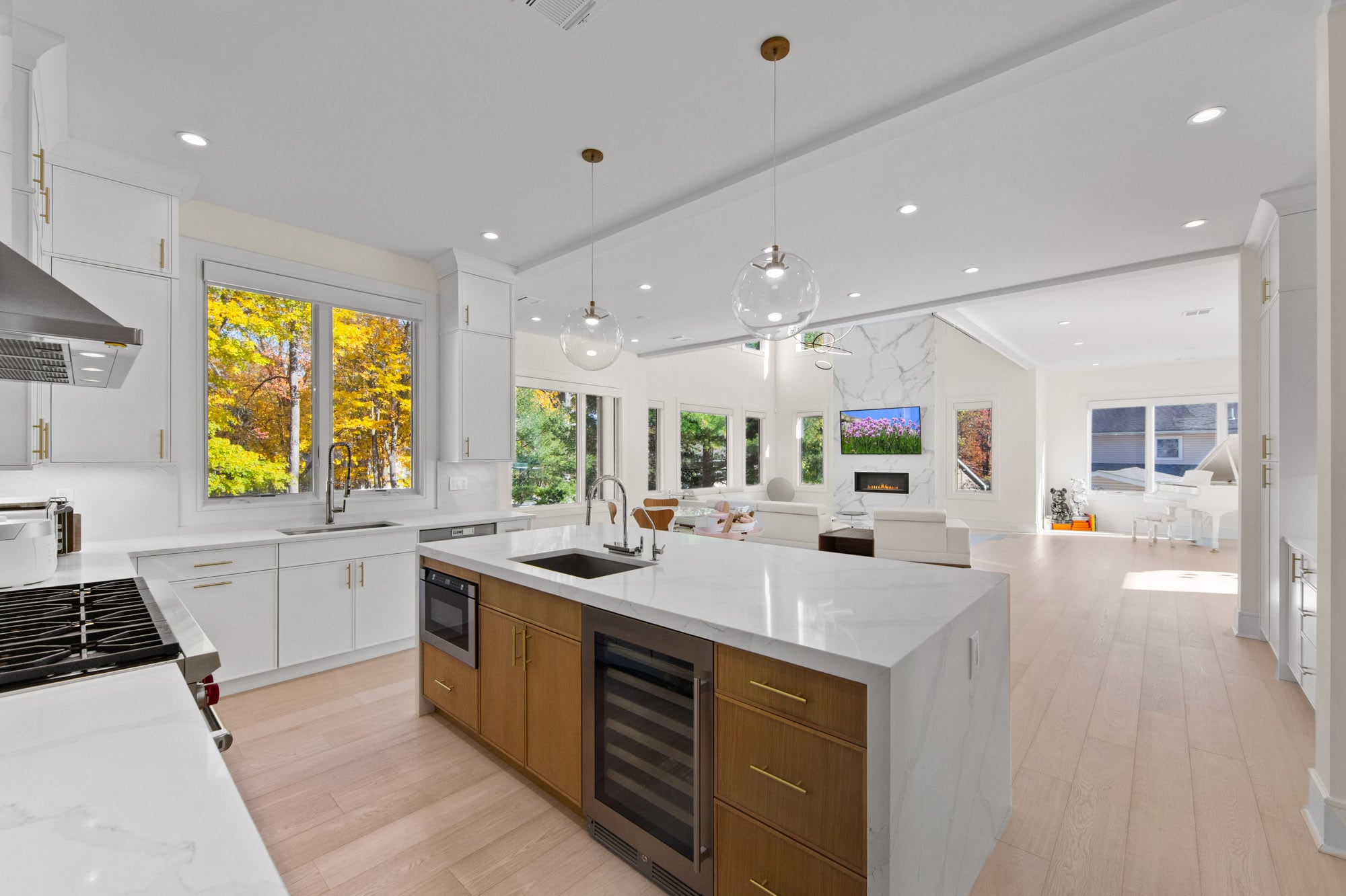 The home features six bedrooms, five full bathrooms, and one half bathroom, highlighted by a dramatic double-height foyer with oversized windows that flood the interior with natural light. The expansive family room includes a gas fireplace and flows seamlessly into a designer kitchen equipped with a Wolf range, Sub-Zero refrigerator, and premium finishes—ideal for both everyday living and entertaining.