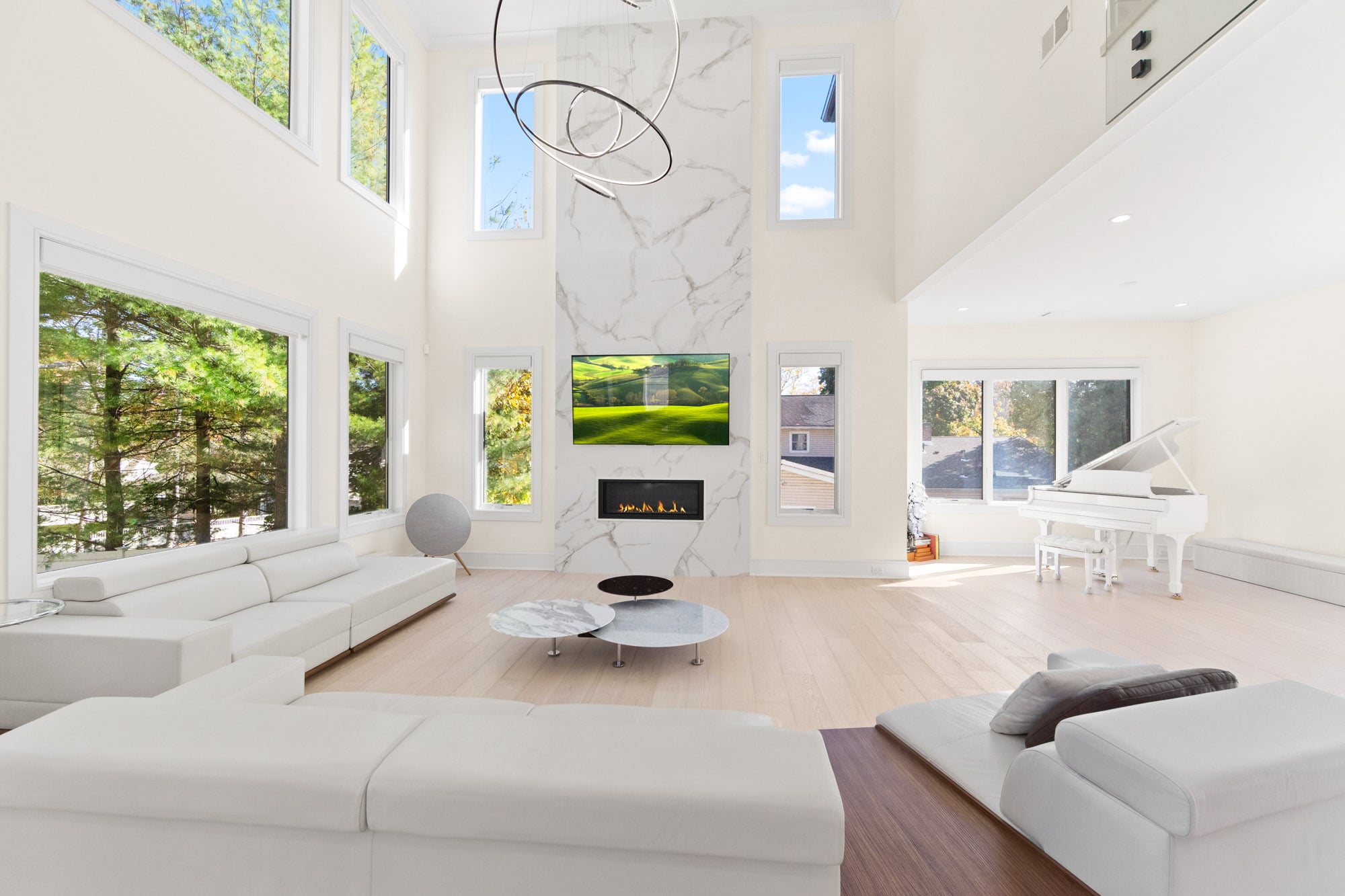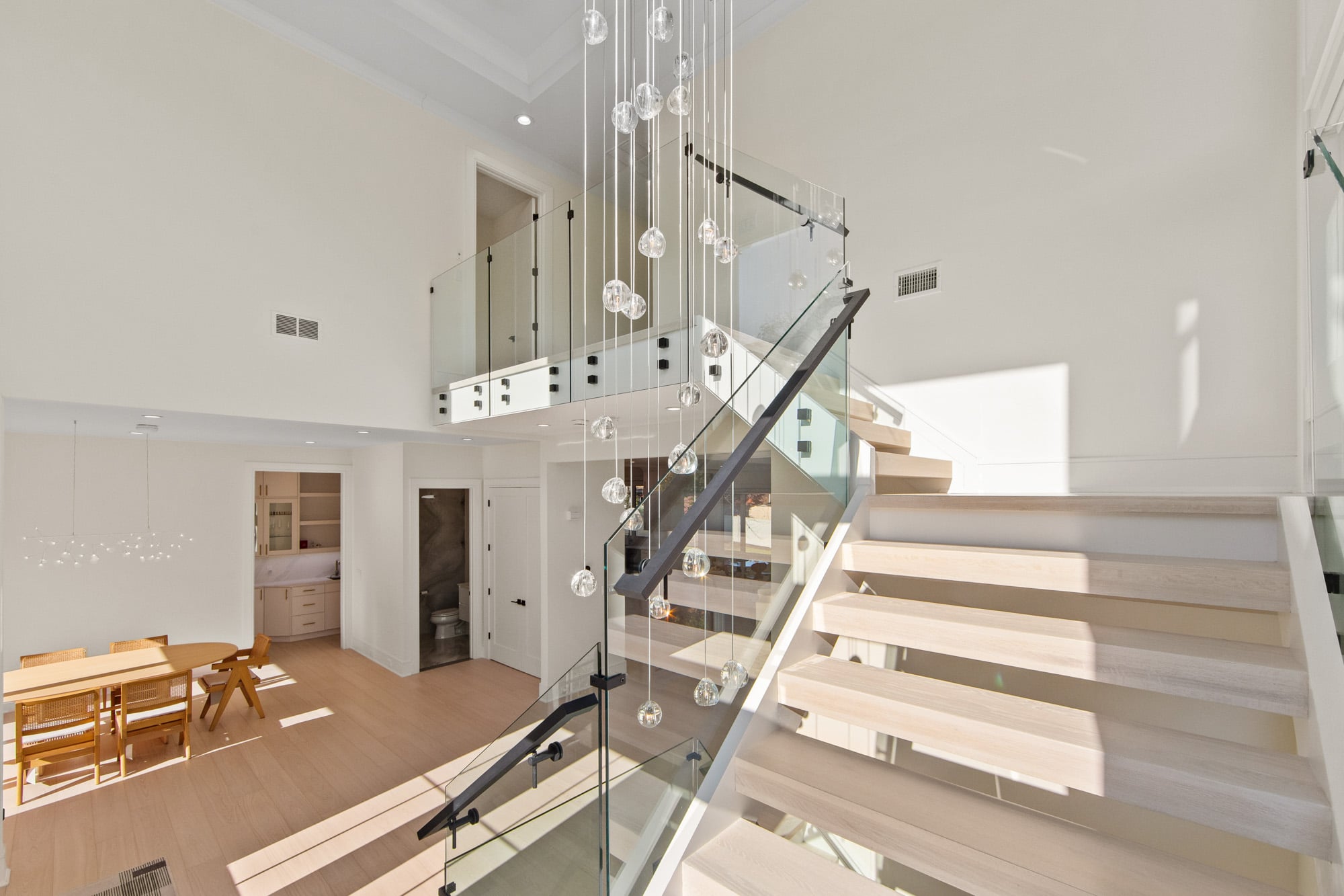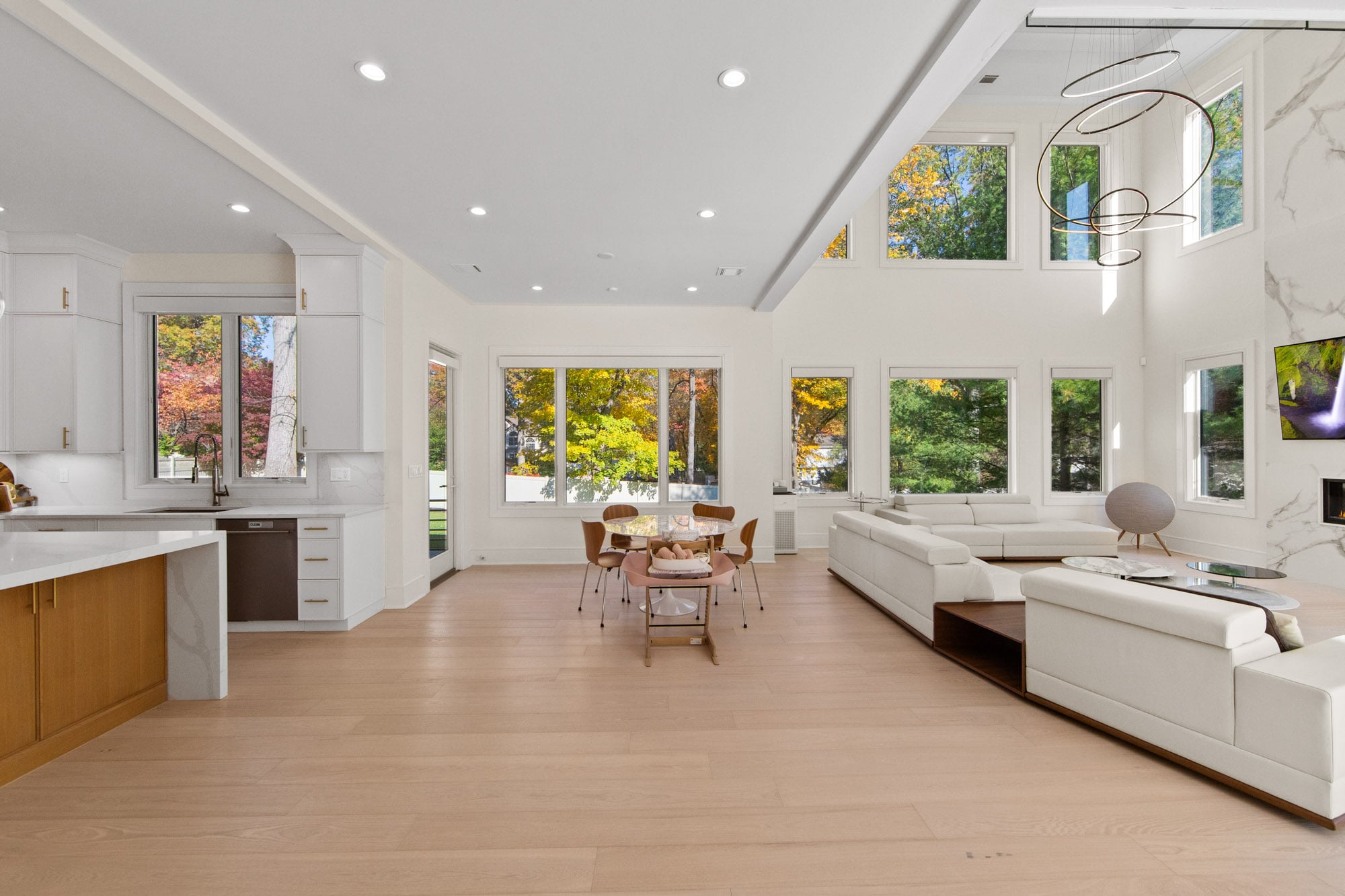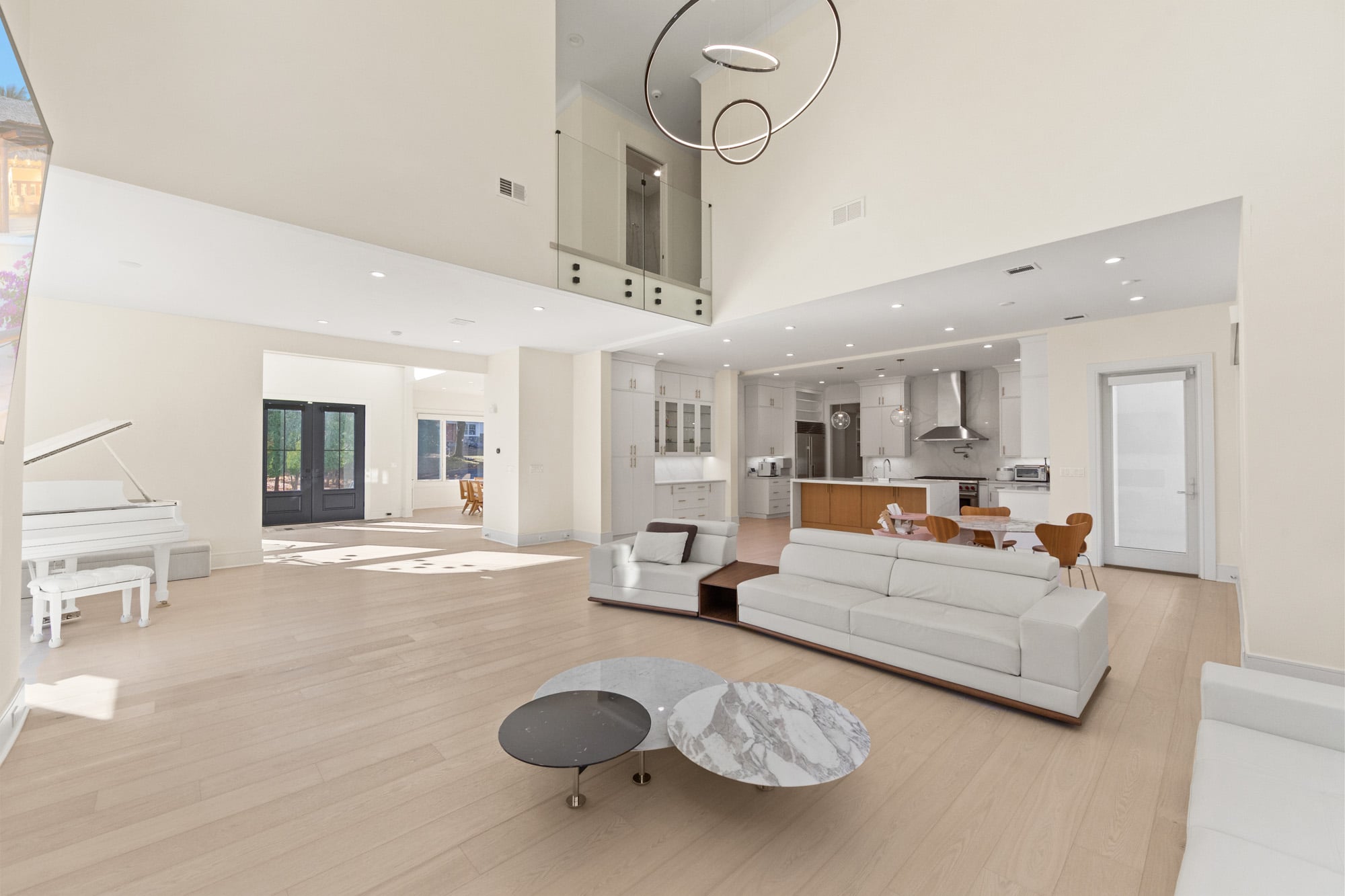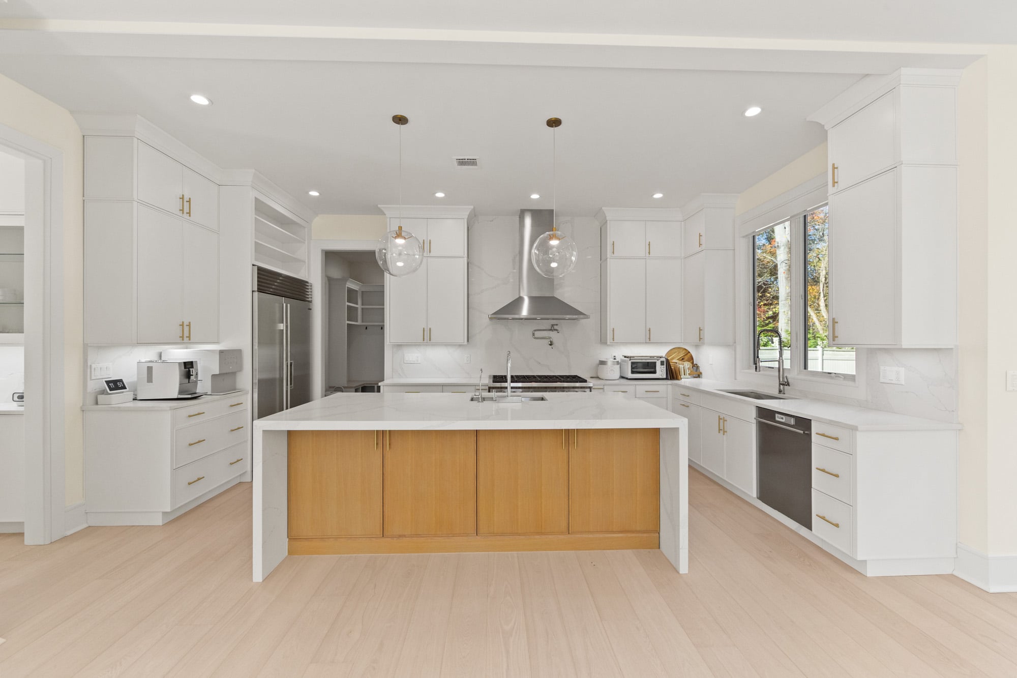 The home features six bedrooms, five full bathrooms, and one half bathroom, highlighted by a dramatic double-height foyer with oversized windows that flood the interior with natural light. The expansive family room includes a gas fireplace and flows seamlessly into a designer kitchen equipped with a Wolf range, Sub-Zero refrigerator, and premium finishes—ideal for both everyday living and entertaining.