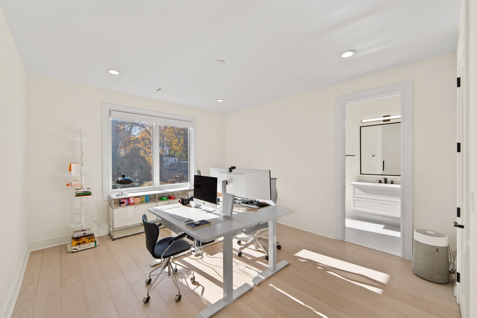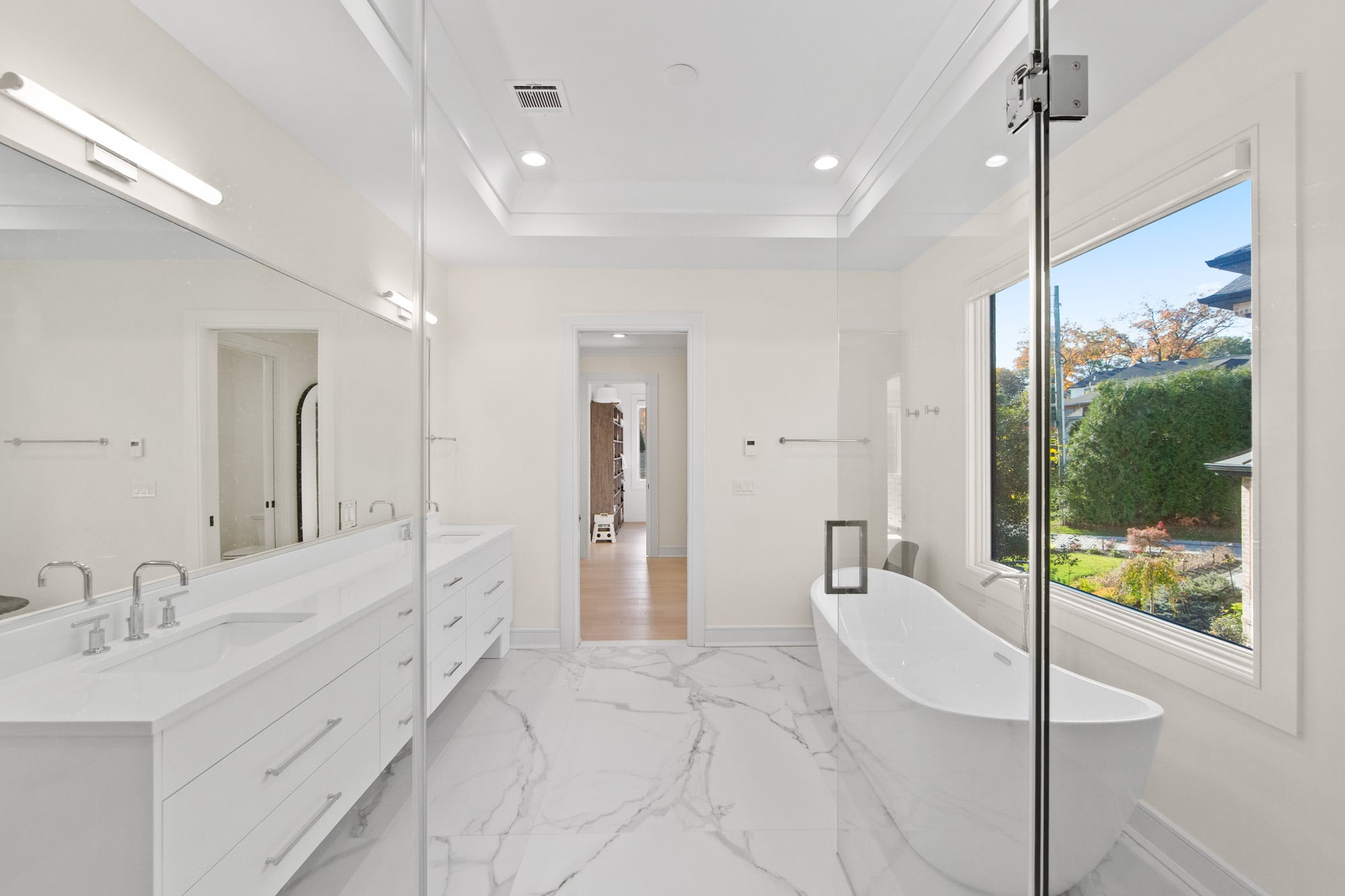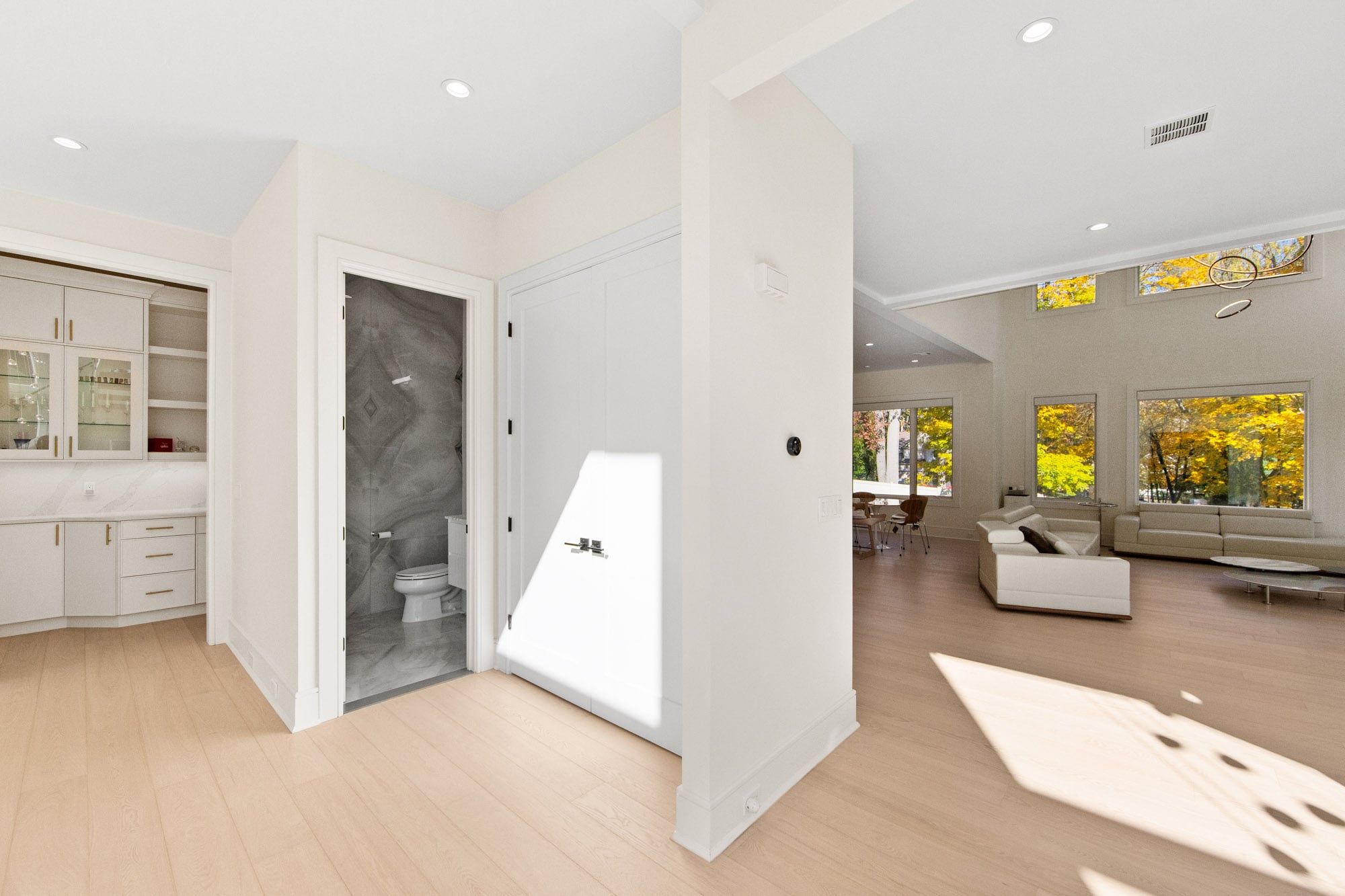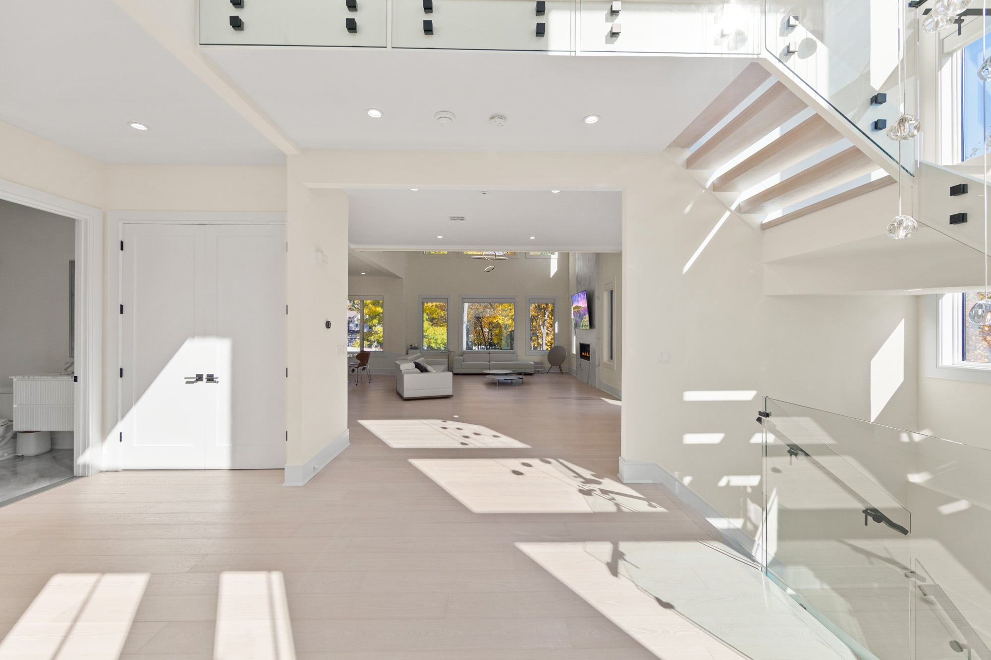 Designed for comfort and performance, the residence includes four-zone heating and cooling, radiant heat in the primary bathroom and mudroom, and smart home controls for temperature, lighting, and garage access. Nearly all windows are fitted with power shades for convenience and privacy. The primary suite offers large custom walk-in closets and a spa-inspired bath with radiant heated floors.