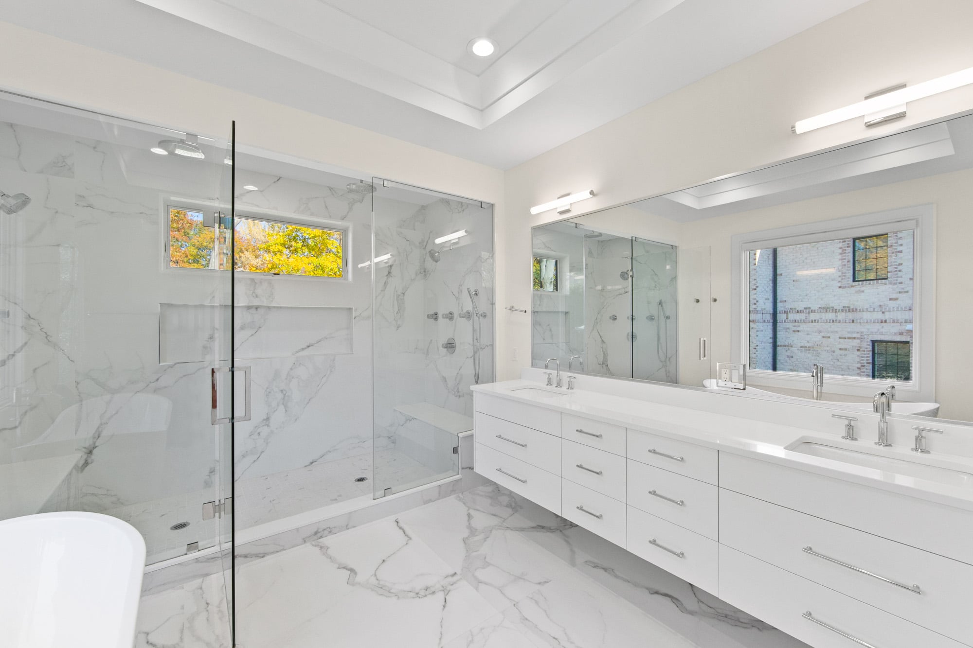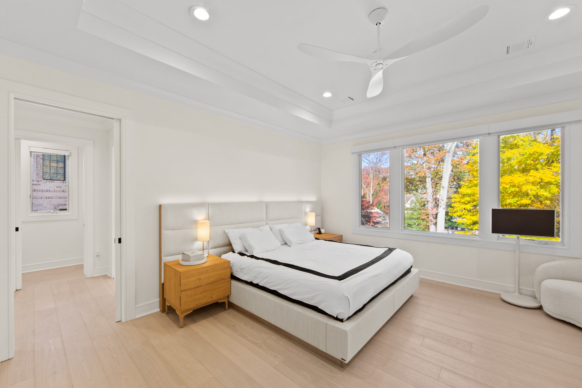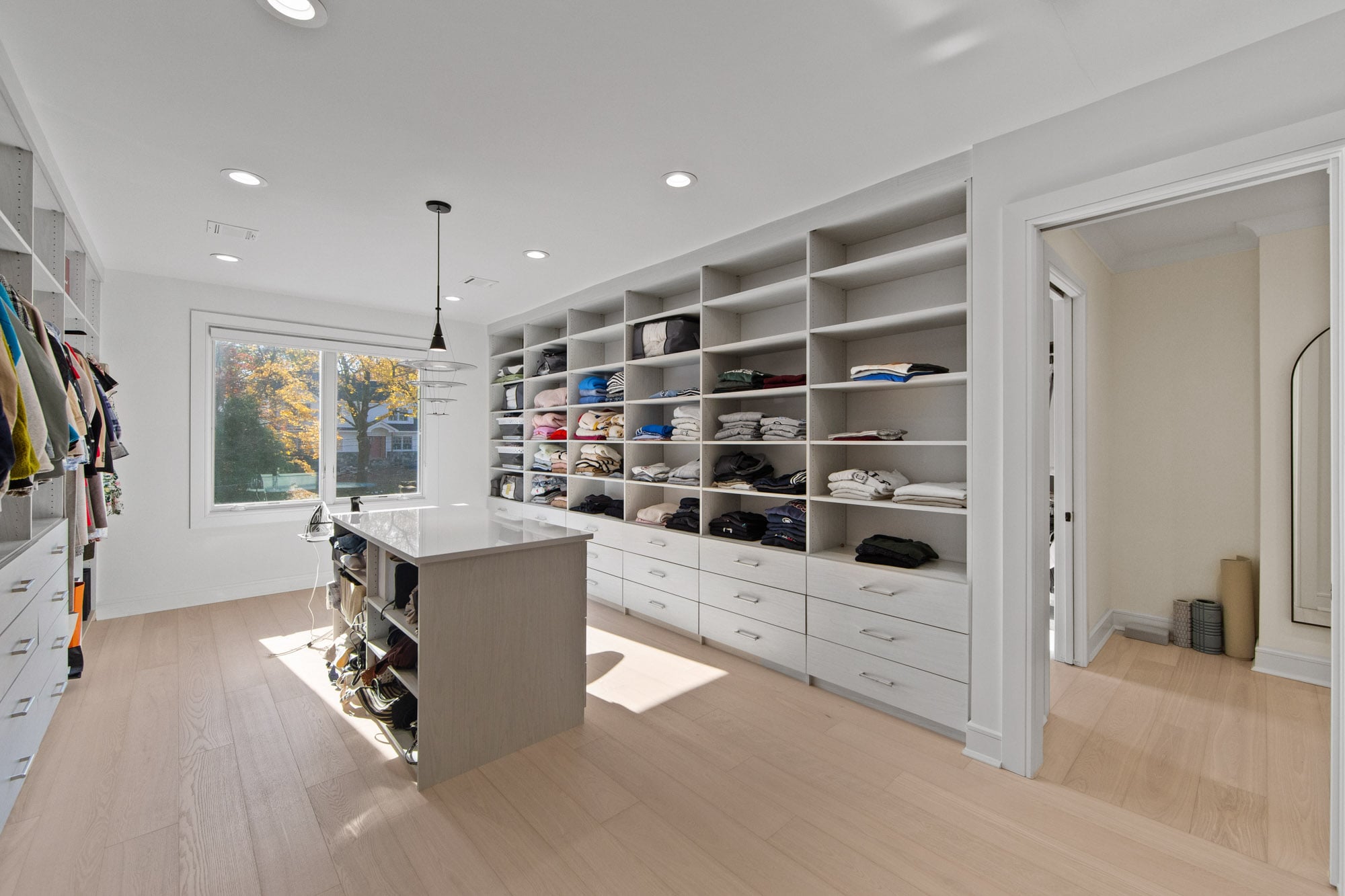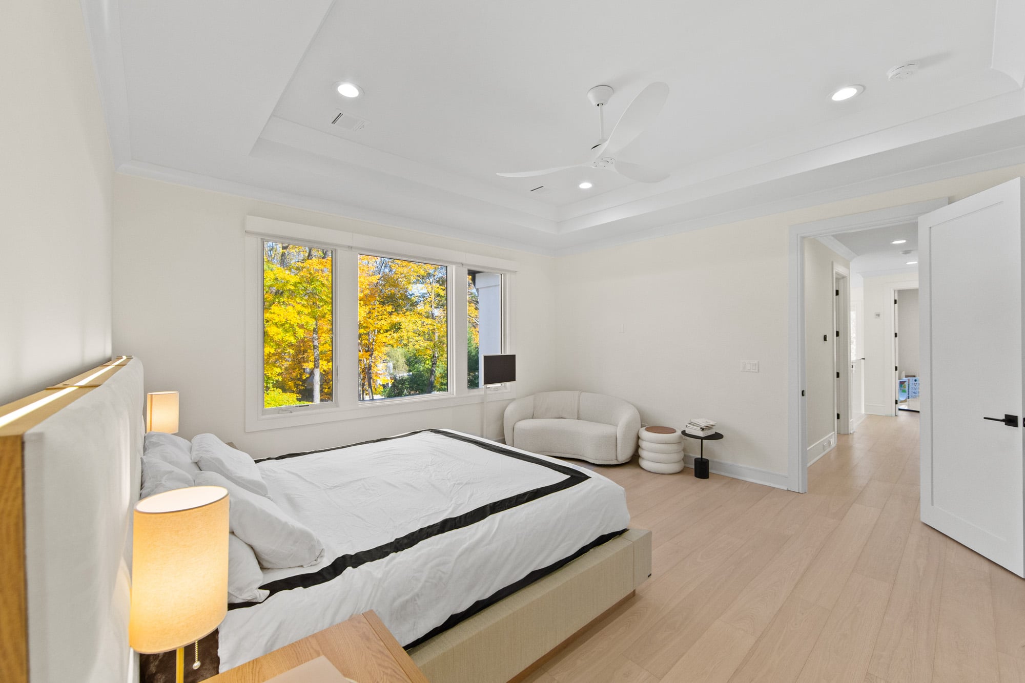 Designed for comfort and performance, the residence includes four-zone heating and cooling, radiant heat in the primary bathroom and mudroom, and smart home controls for temperature, lighting, and garage access. Nearly all windows are fitted with power shades for convenience and privacy. The primary suite offers large custom walk-in closets and a spa-inspired bath with radiant heated floors.