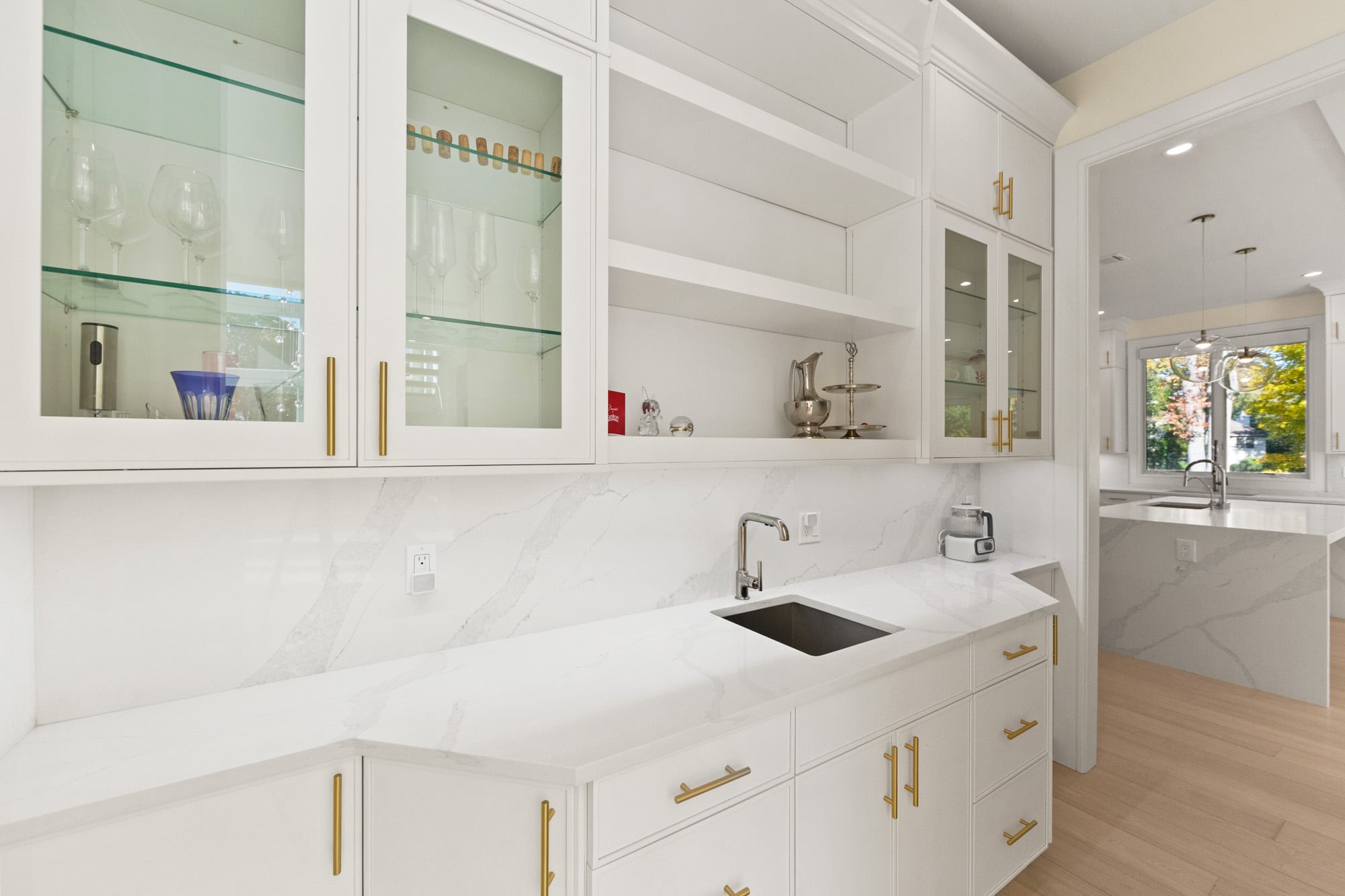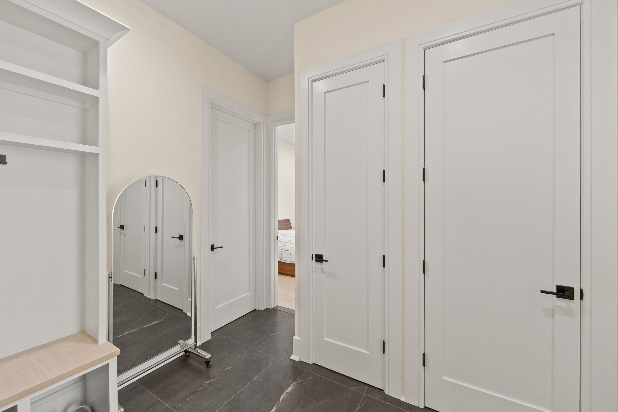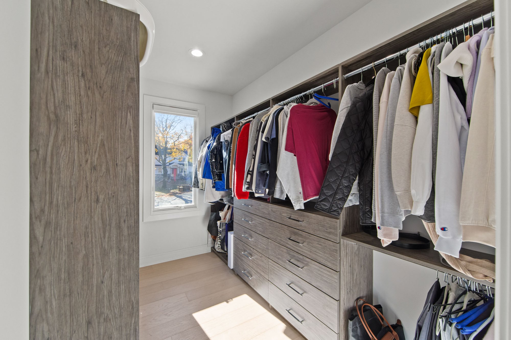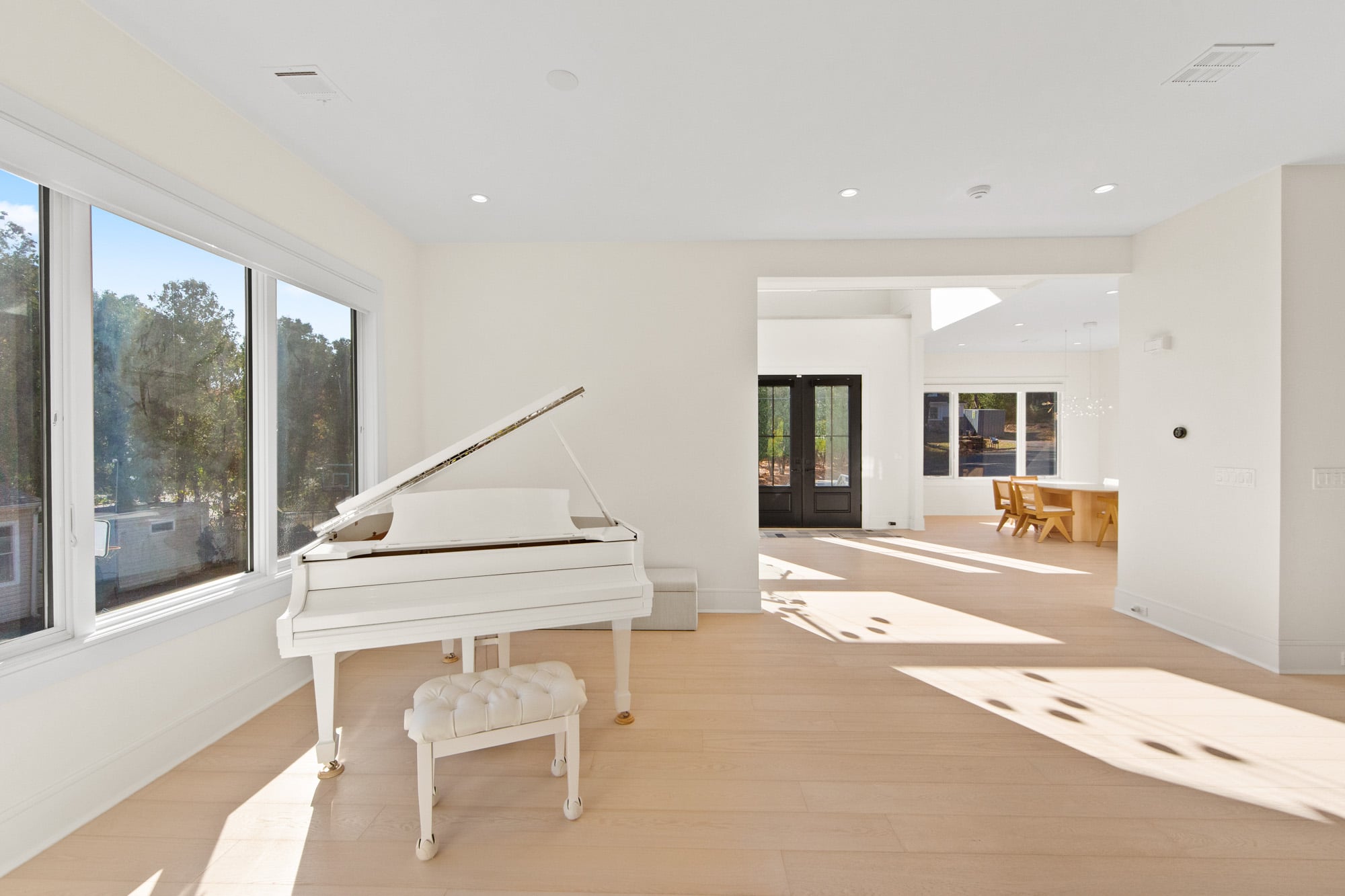 Designed for comfort and performance, the residence includes four-zone heating and cooling, radiant heat in the primary bathroom and mudroom, and smart home controls for temperature, lighting, and garage access. Nearly all windows are fitted with power shades for convenience and privacy. The primary suite offers large custom walk-in closets and a spa-inspired bath with radiant heated floors.