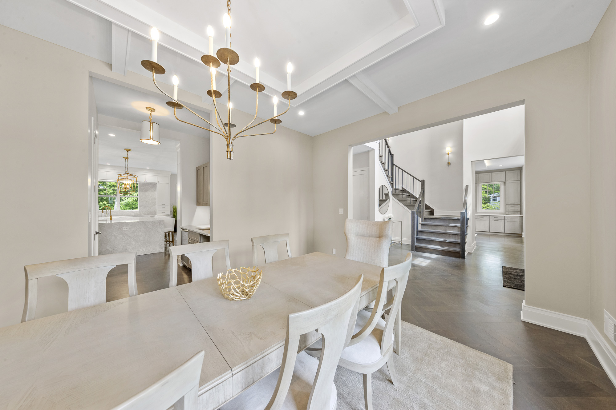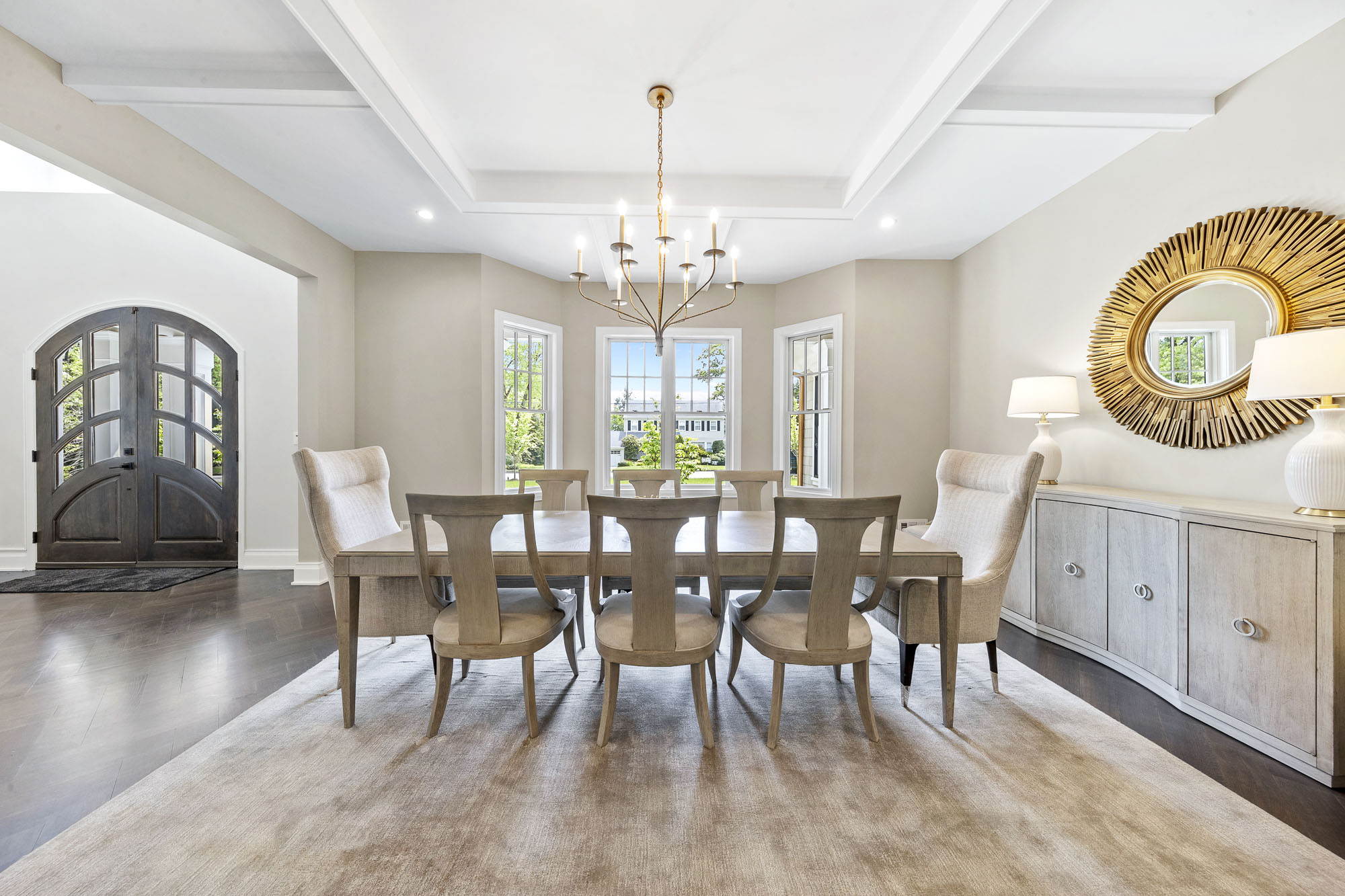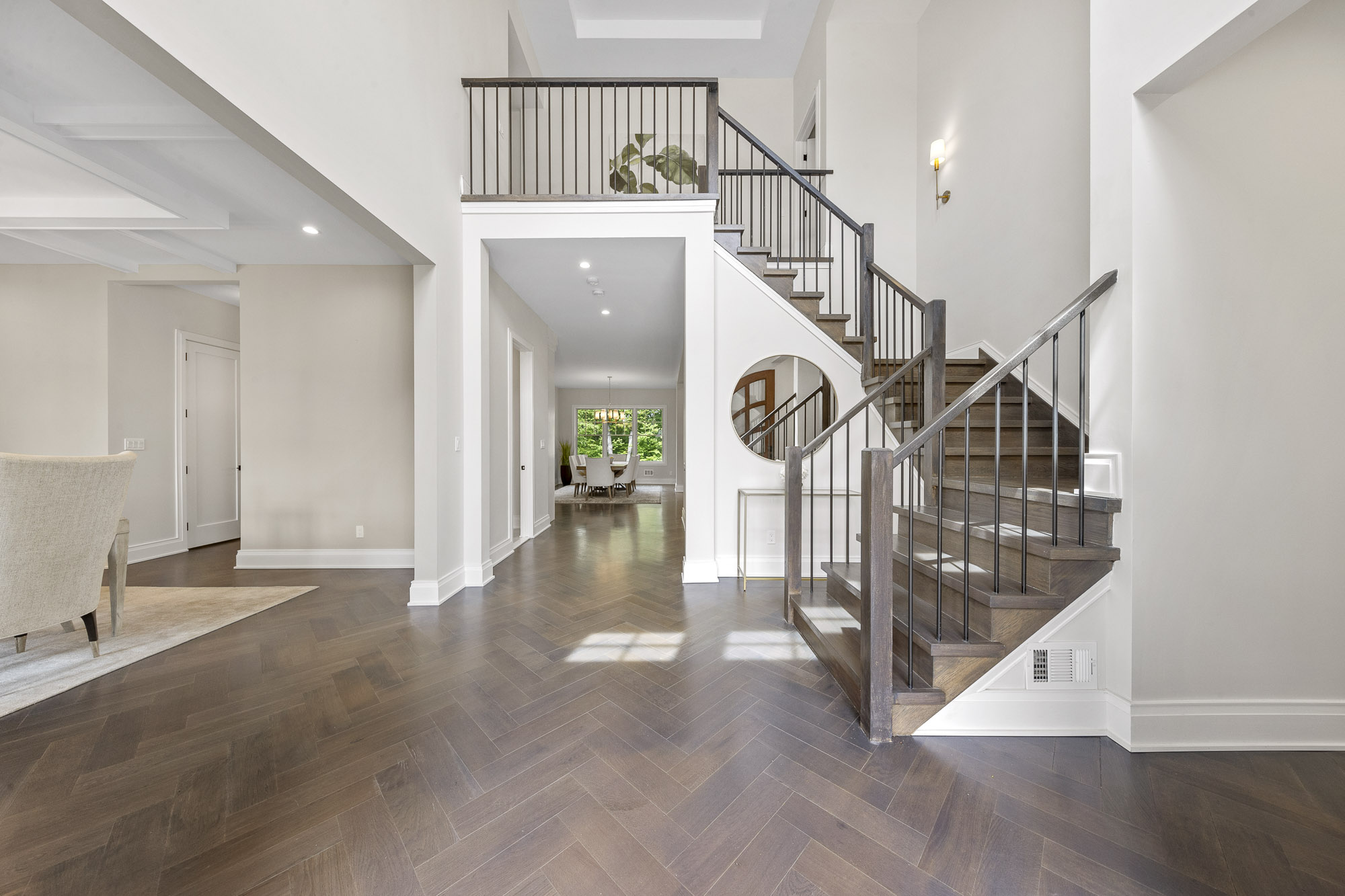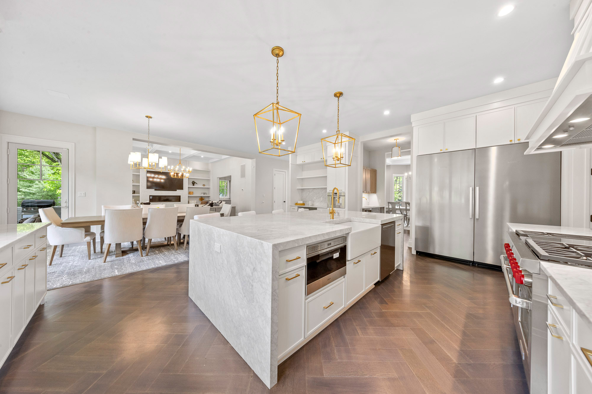 Step inside to discover soaring 9 to 14-foot ceilings, adorned with unique ceiling details in nearly every room. The interior is adorned with designer high-end lighting fixtures, vanities, and appliances, while 5-inch herringbone hardwood floors add a touch of elegance to every space.