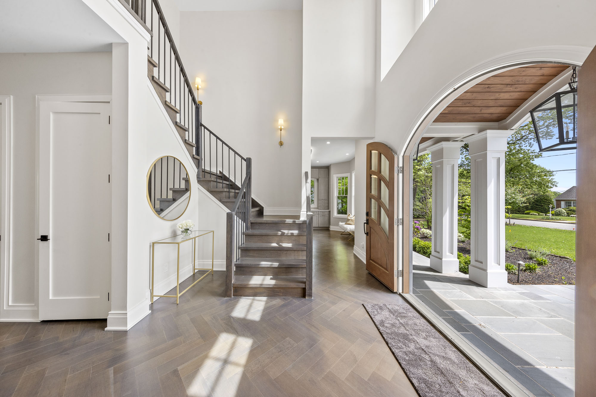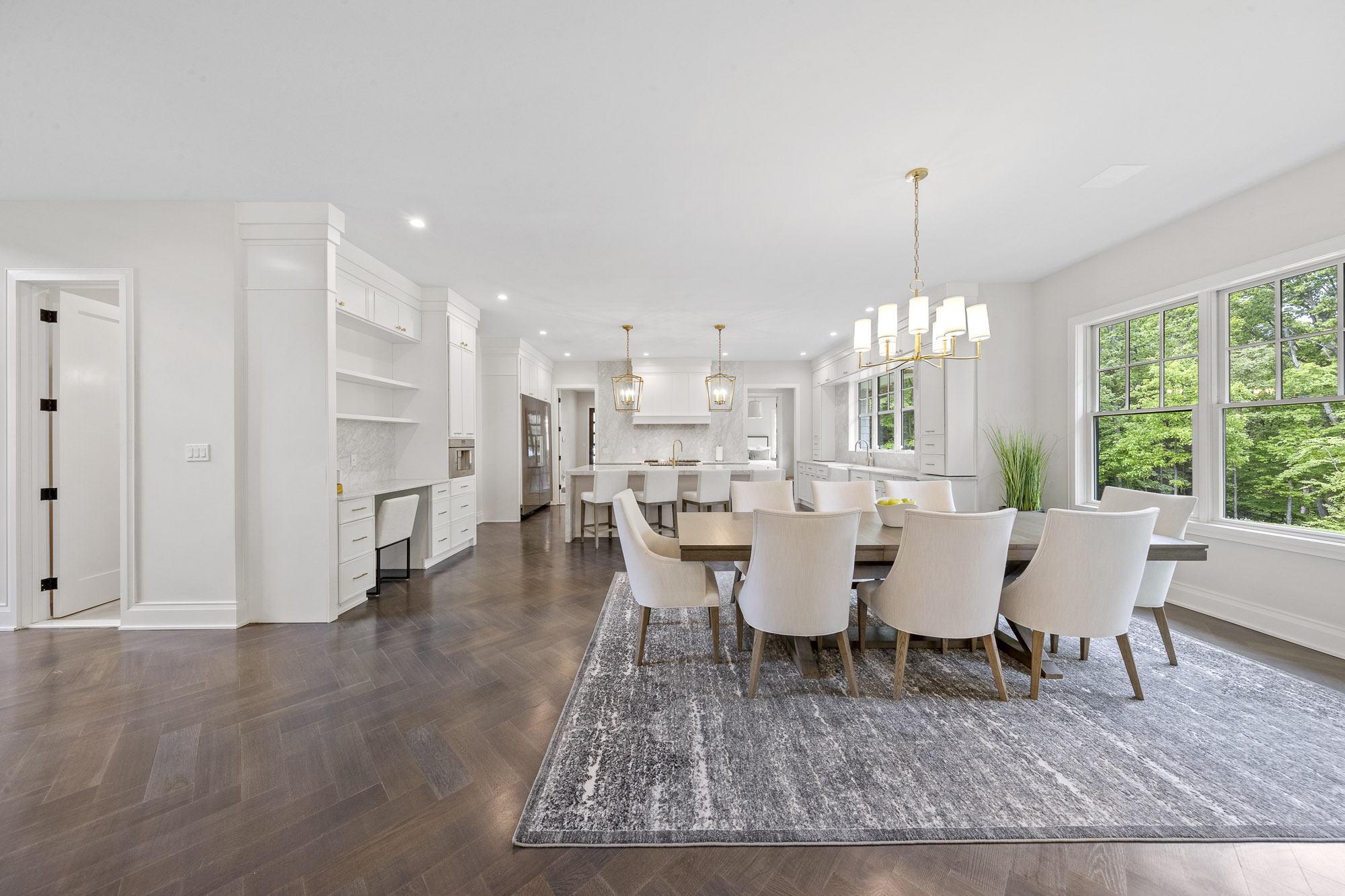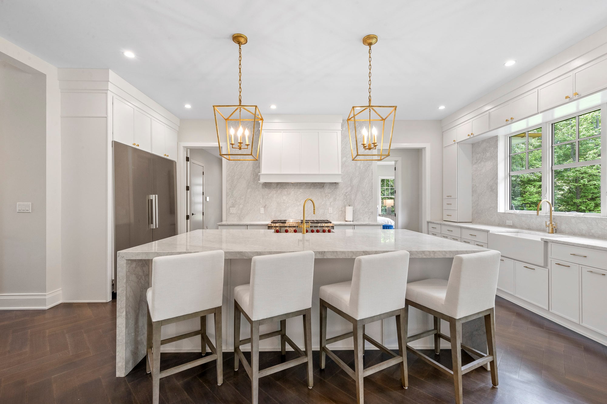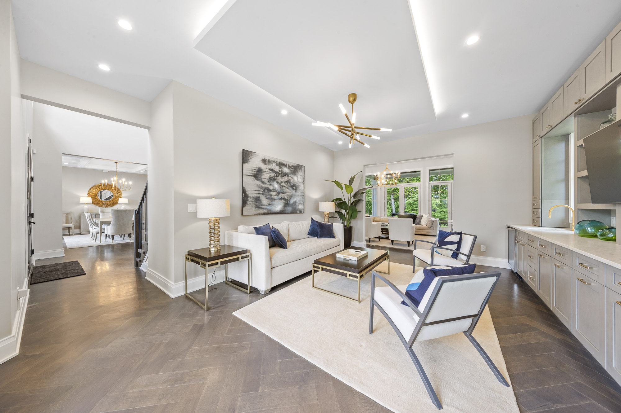 Step inside to discover soaring 9 to 14-foot ceilings, adorned with unique ceiling details in nearly every room. The interior is adorned with designer high-end lighting fixtures, vanities, and appliances, while 5-inch herringbone hardwood floors add a touch of elegance to every space.