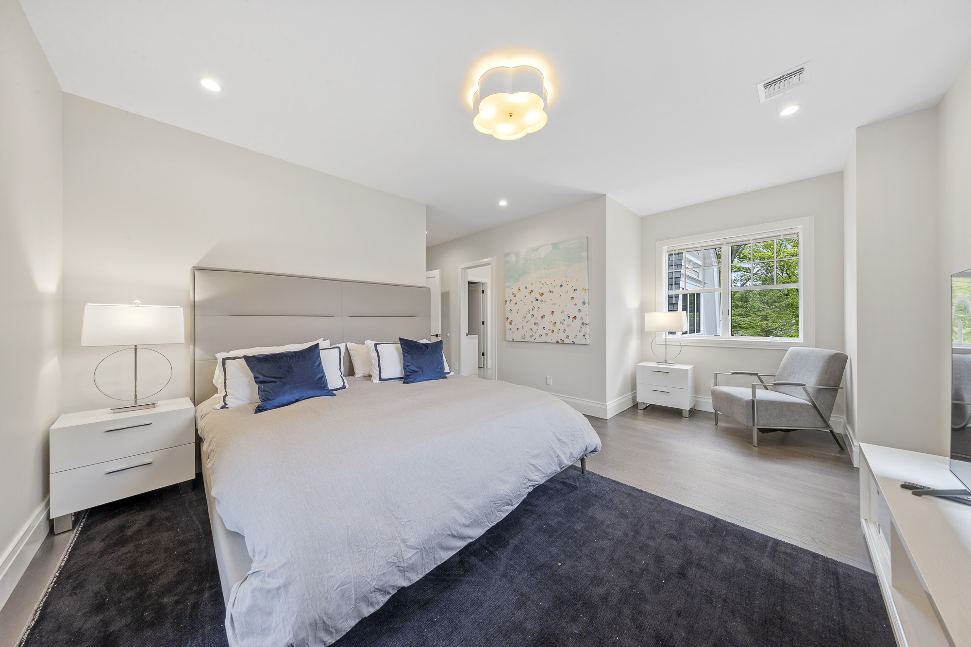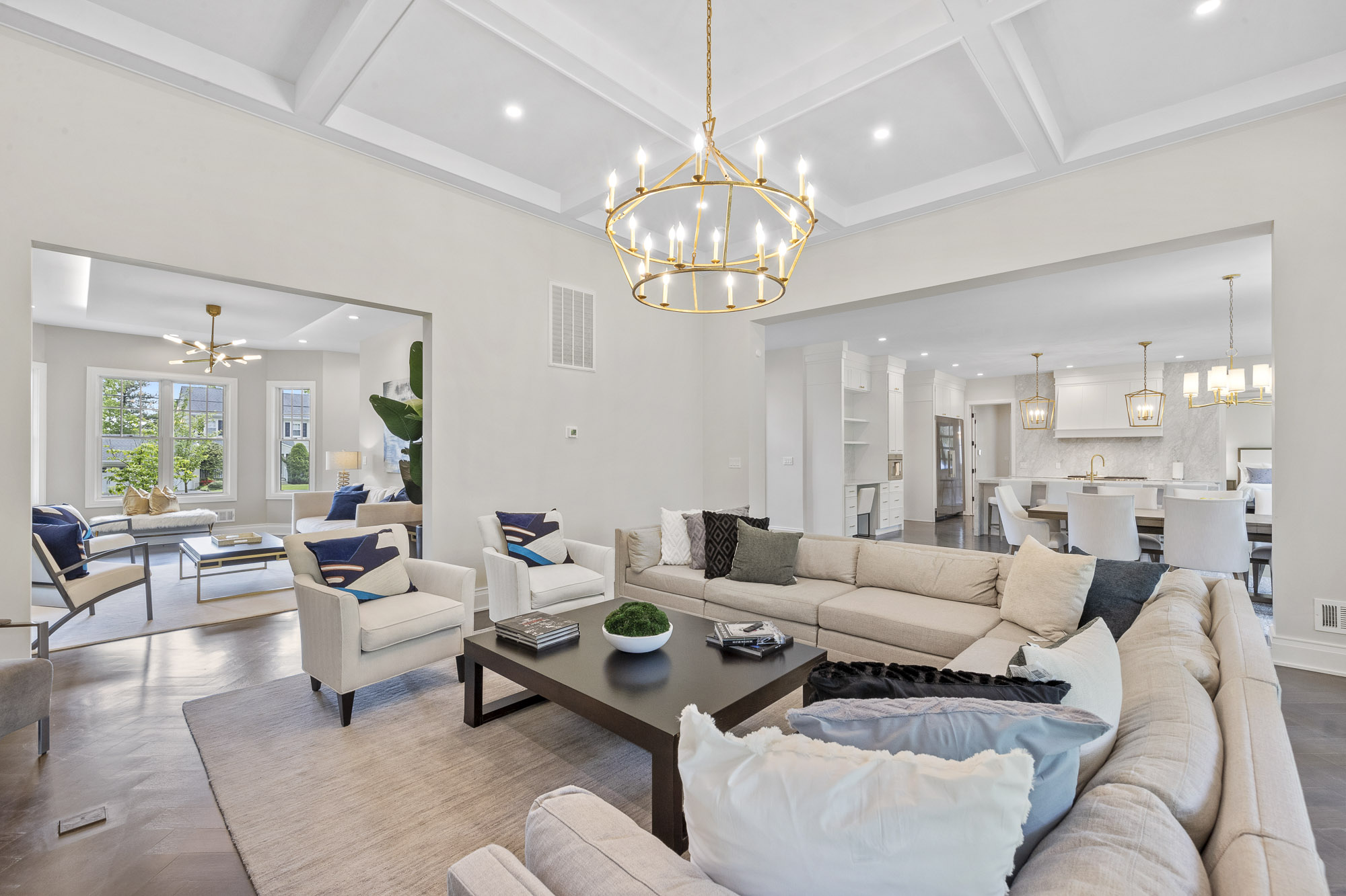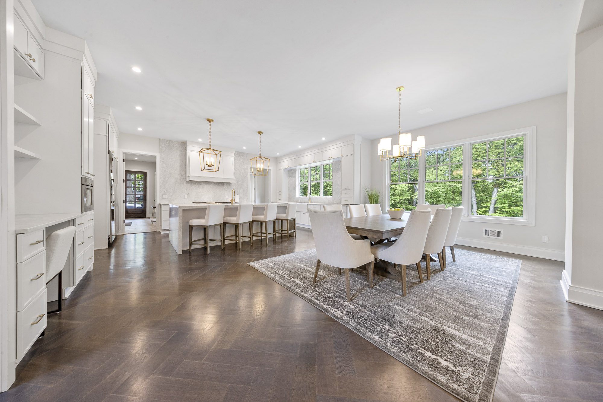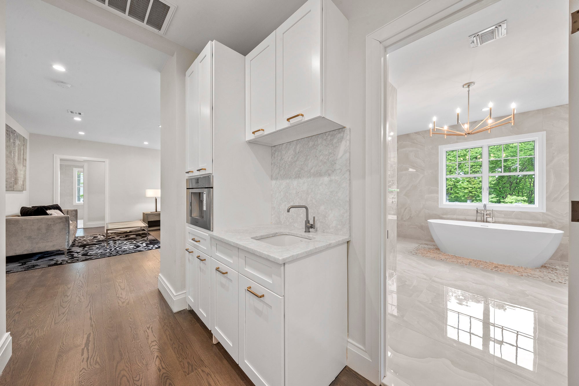 Step inside to discover soaring 9 to 14-foot ceilings, adorned with unique ceiling details in nearly every room. The interior is adorned with designer high-end lighting fixtures, vanities, and appliances, while 5-inch herringbone hardwood floors add a touch of elegance to every space.