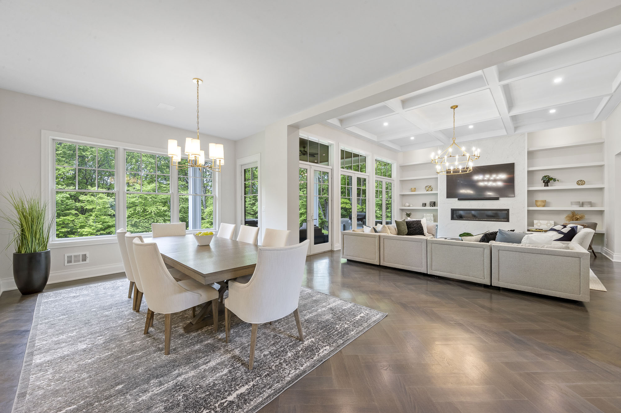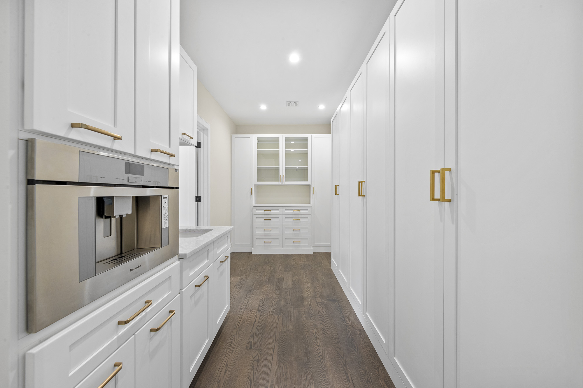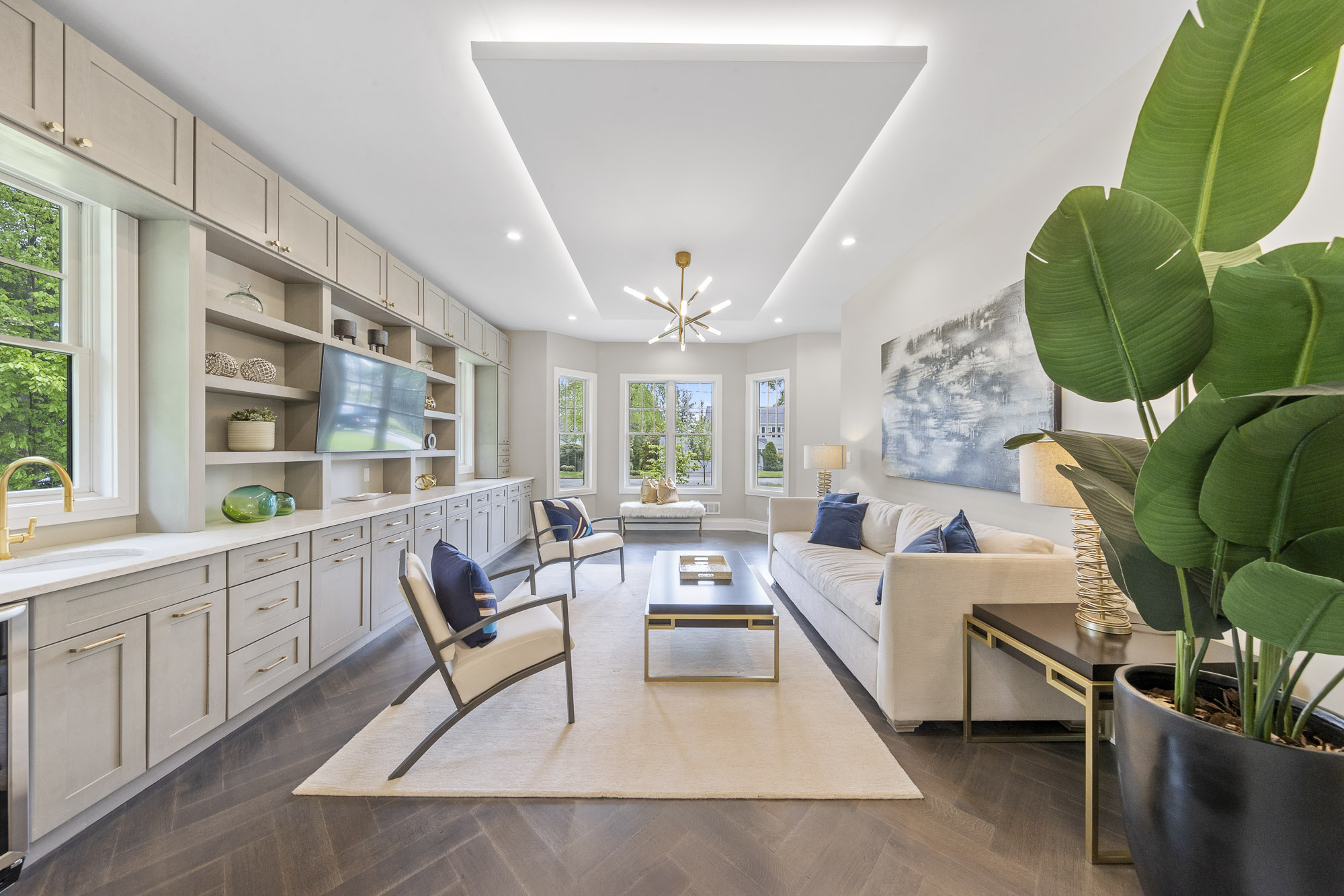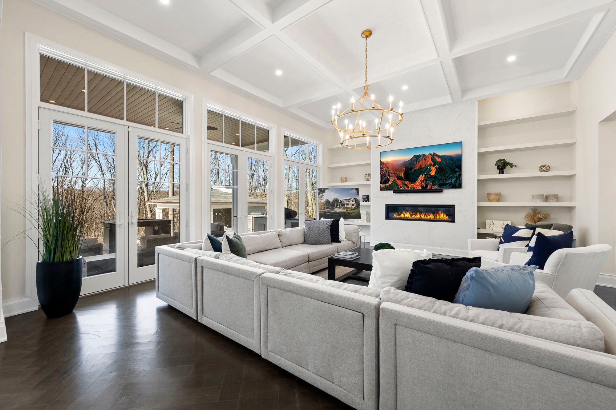 The open living spaces are filled with abundant natural light, creating a bright and airy ambiance throughout. At the heart of the home lies a designer kitchen featuring a 10-foot marble center island and top-of-the-line Wolf and Thermador appliances. Adjacent to the kitchen is the grand great room, complete with a coffered ceiling and an impressive chic fireplace.