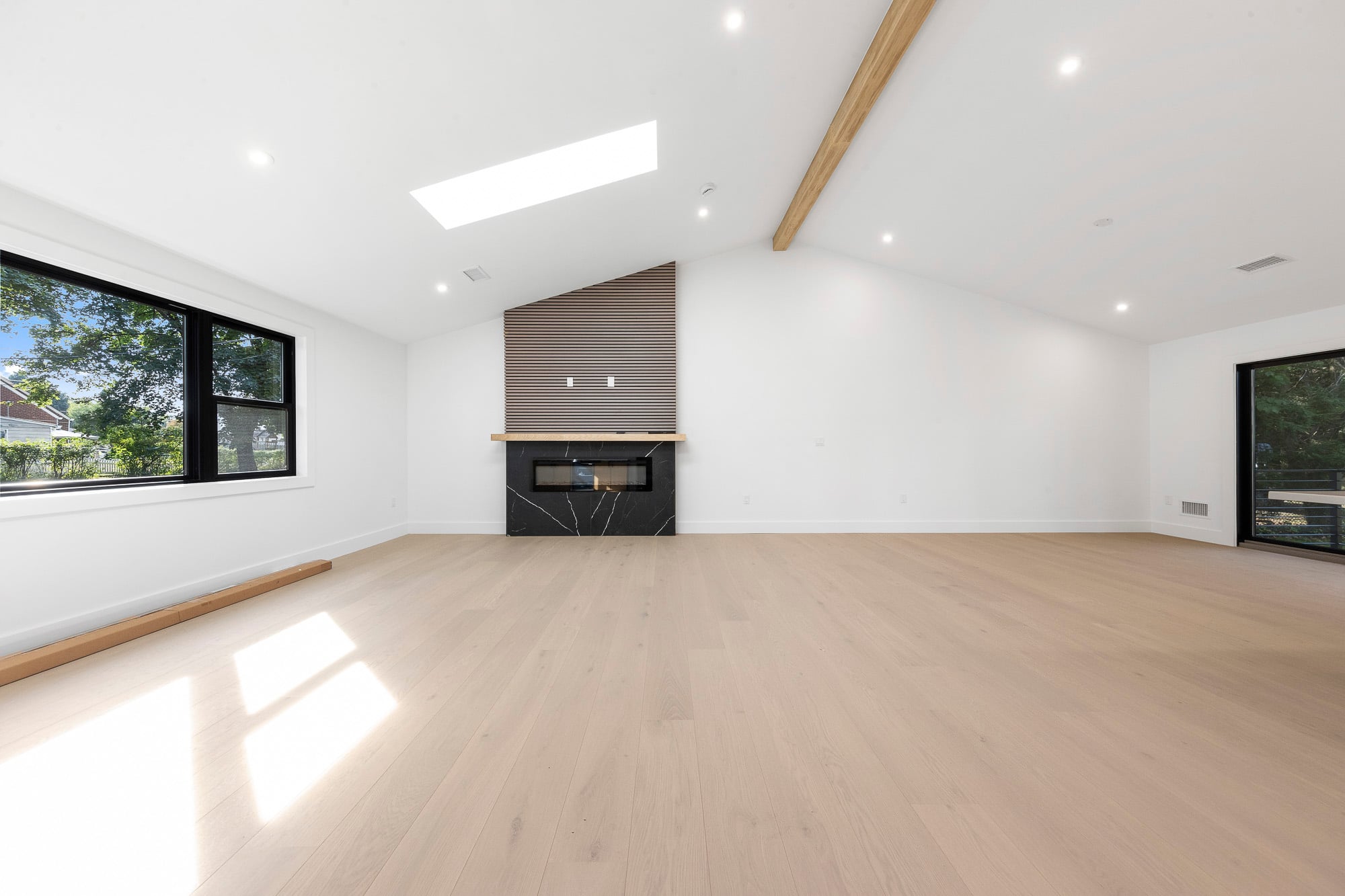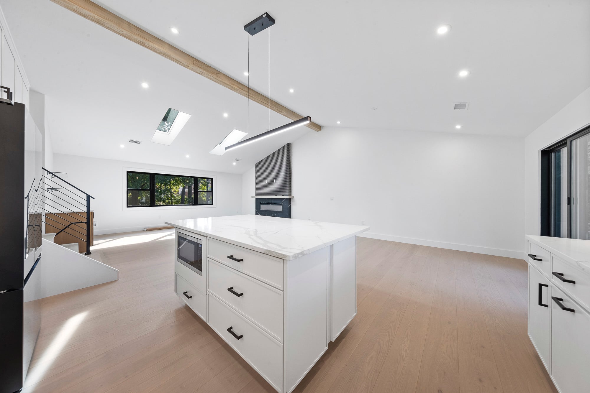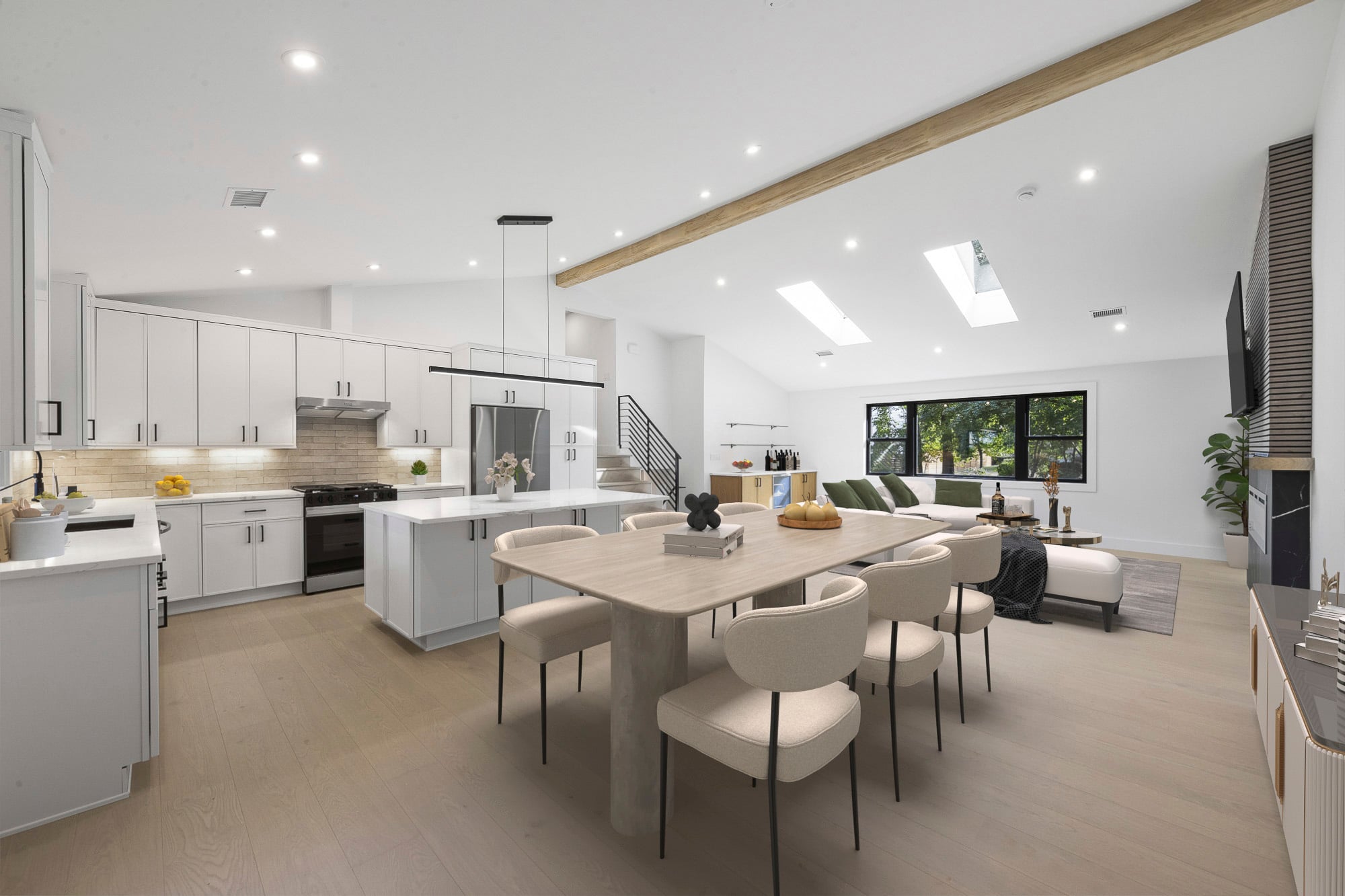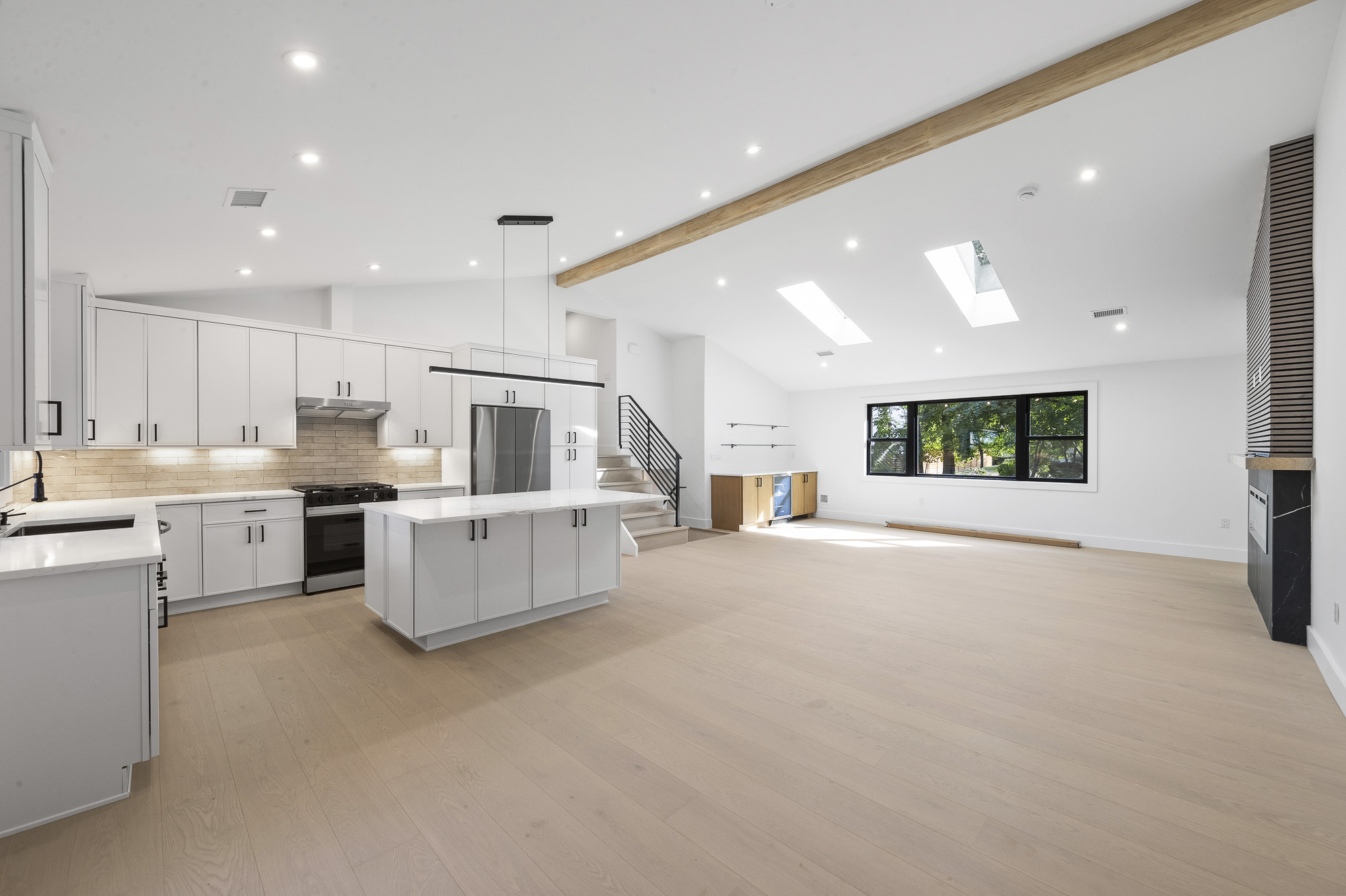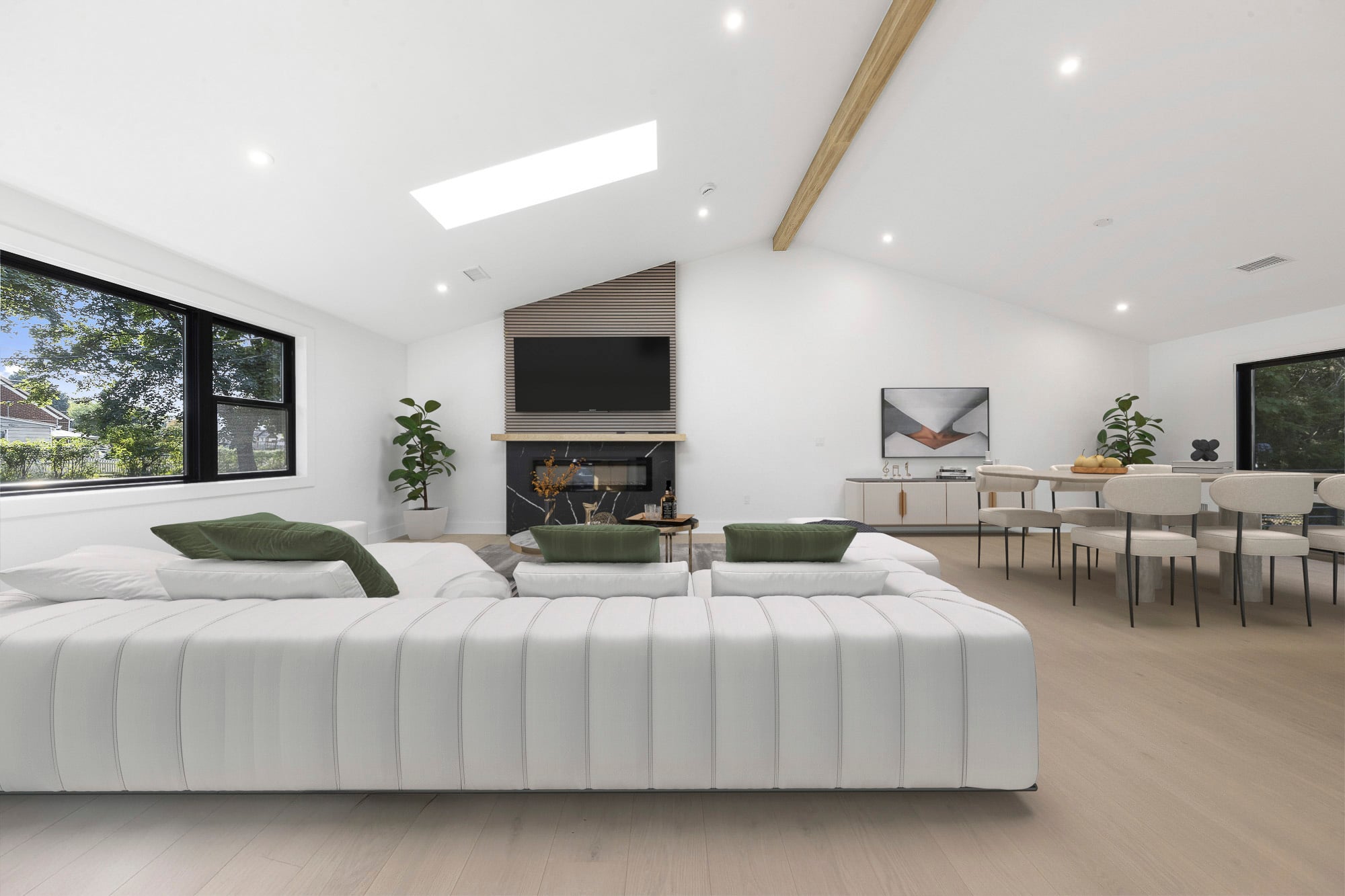 Every major component of the home has been newly completed, including a new roof, Andersen windows, HardiePlank siding, updated electrical and plumbing systems, and multi-zone HVAC. The interior features five bedrooms and four full bathrooms, with a layout designed for flexibility across all levels. White oak engineered flooring runs throughout, complemented by custom accent walls, vaulted ceilings, skylights, and integrated LED lighting that enhances natural light and overall flow.