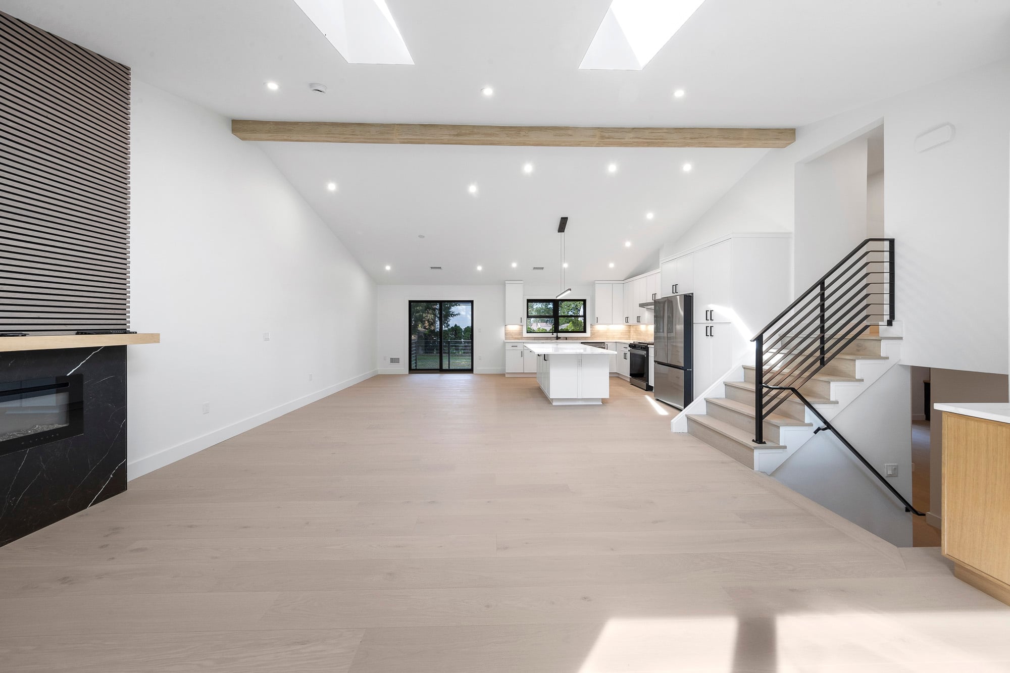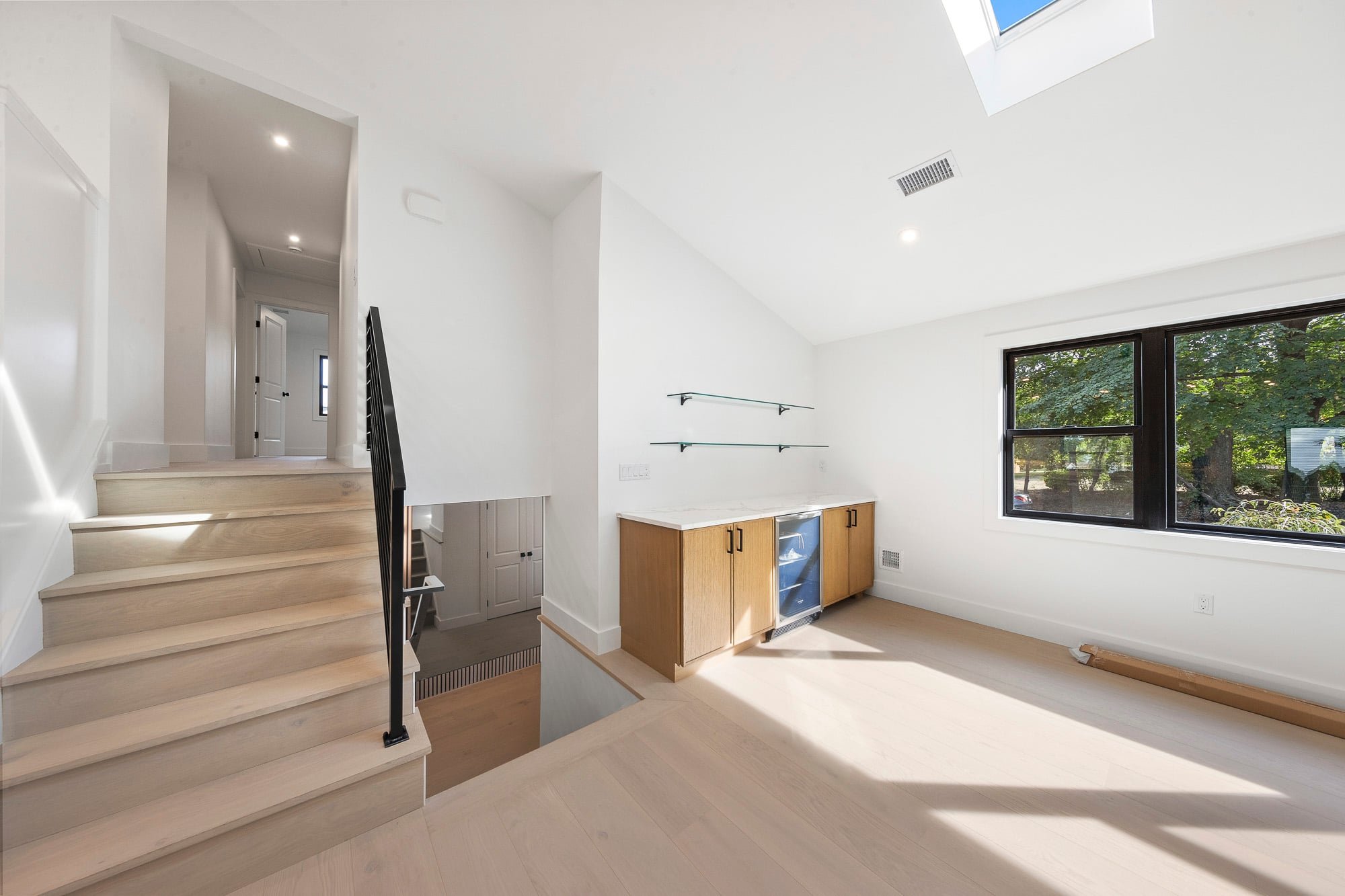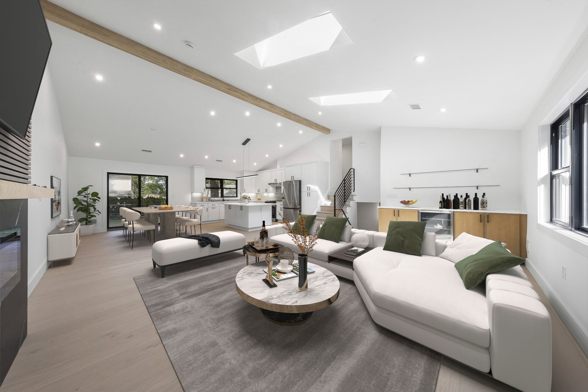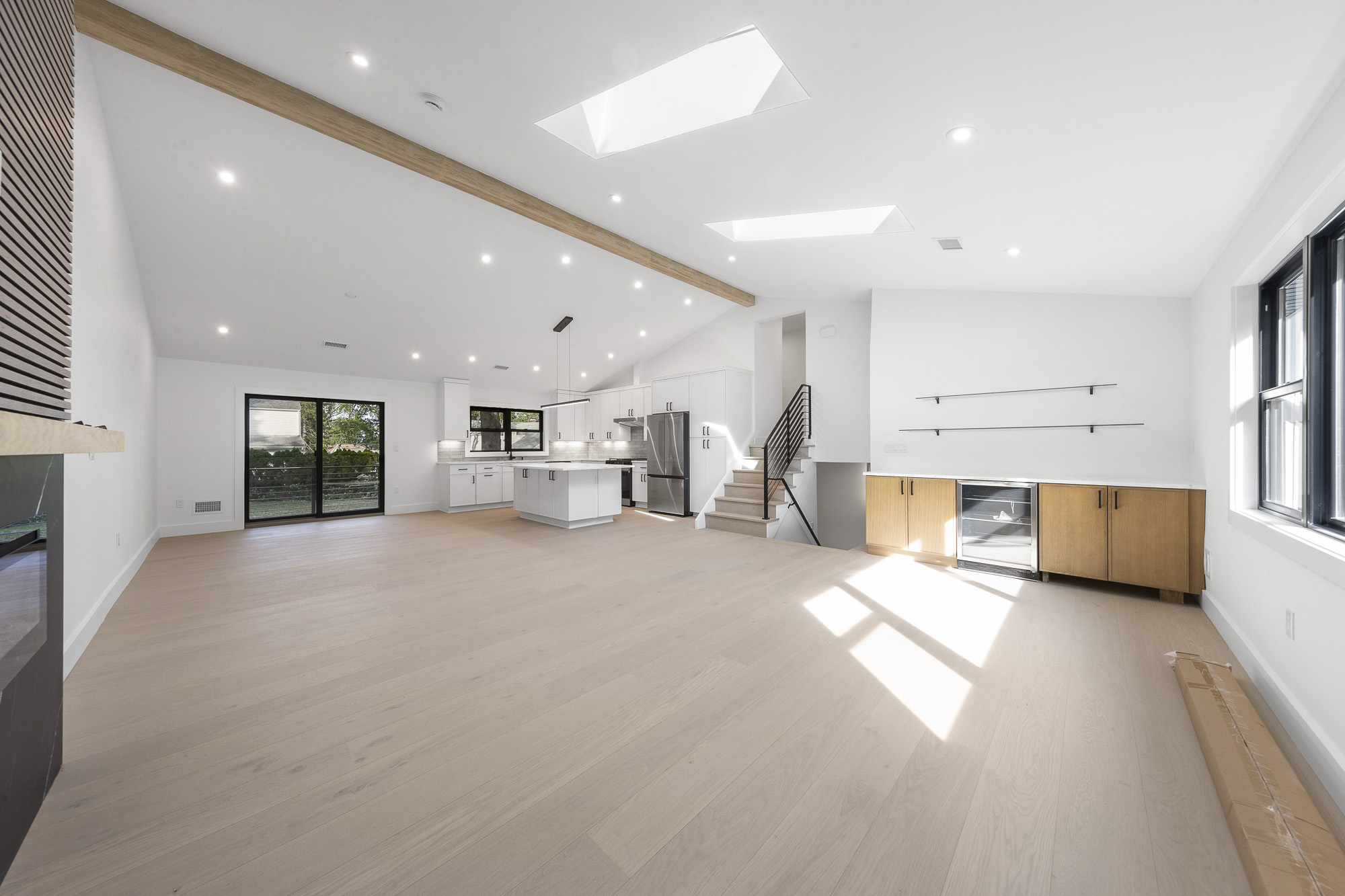 Every major component of the home has been newly completed, including a new roof, Andersen windows, HardiePlank siding, updated electrical and plumbing systems, and multi-zone HVAC. The interior features five bedrooms and four full bathrooms, with a layout designed for flexibility across all levels. White oak engineered flooring runs throughout, complemented by custom accent walls, vaulted ceilings, skylights, and integrated LED lighting that enhances natural light and overall flow.
