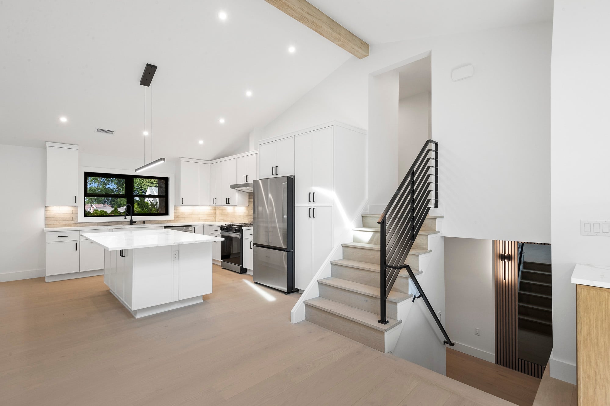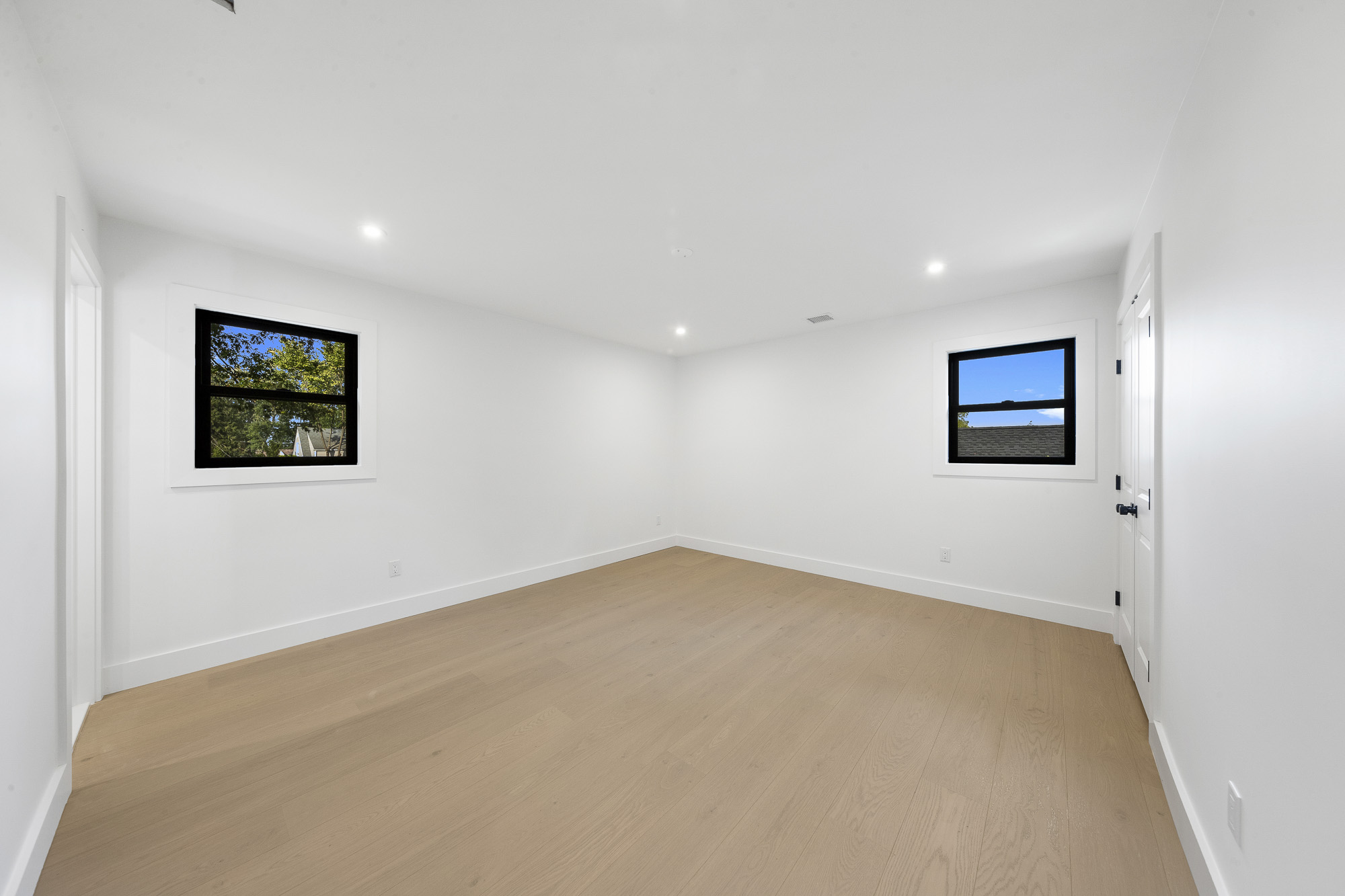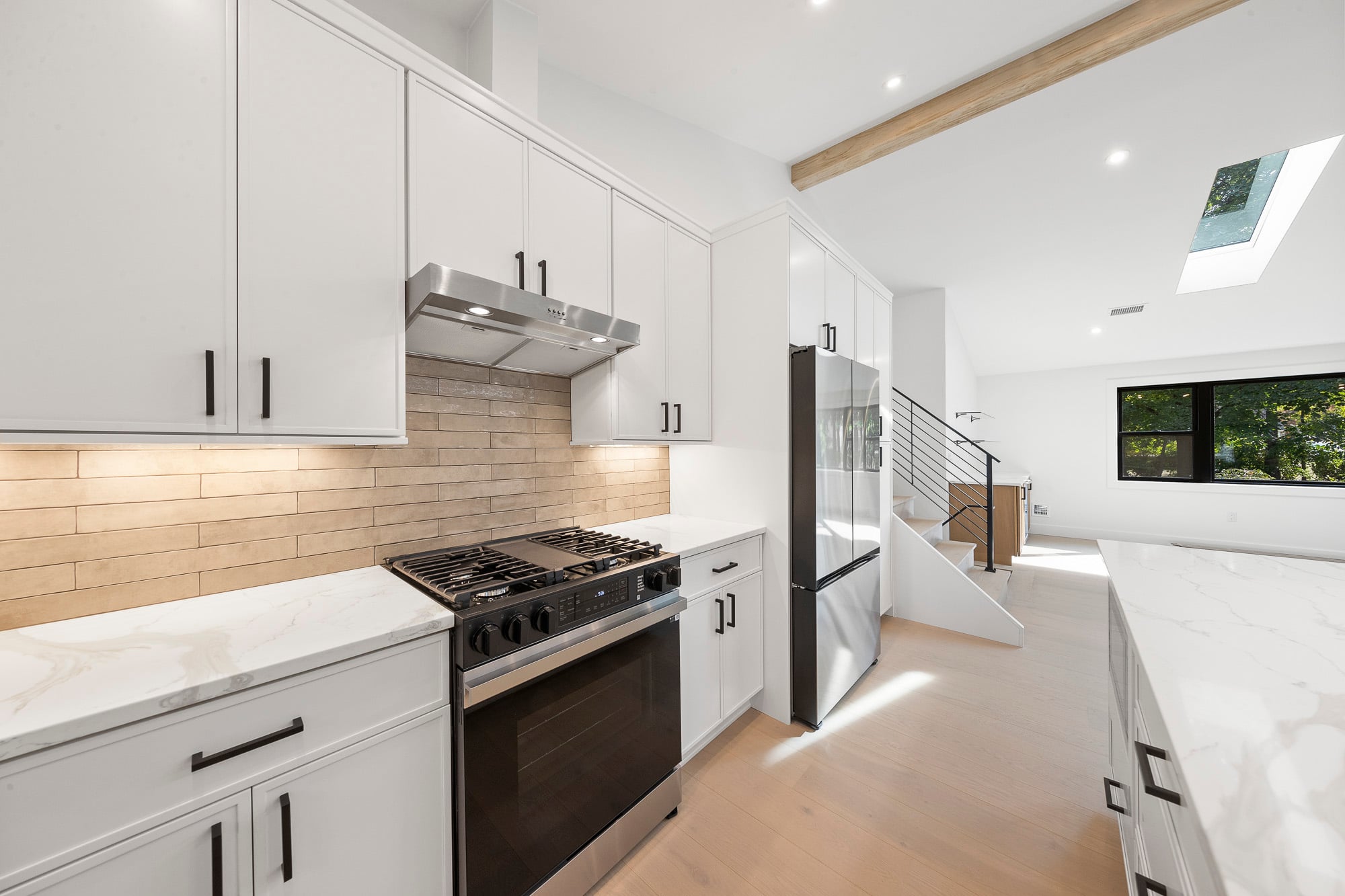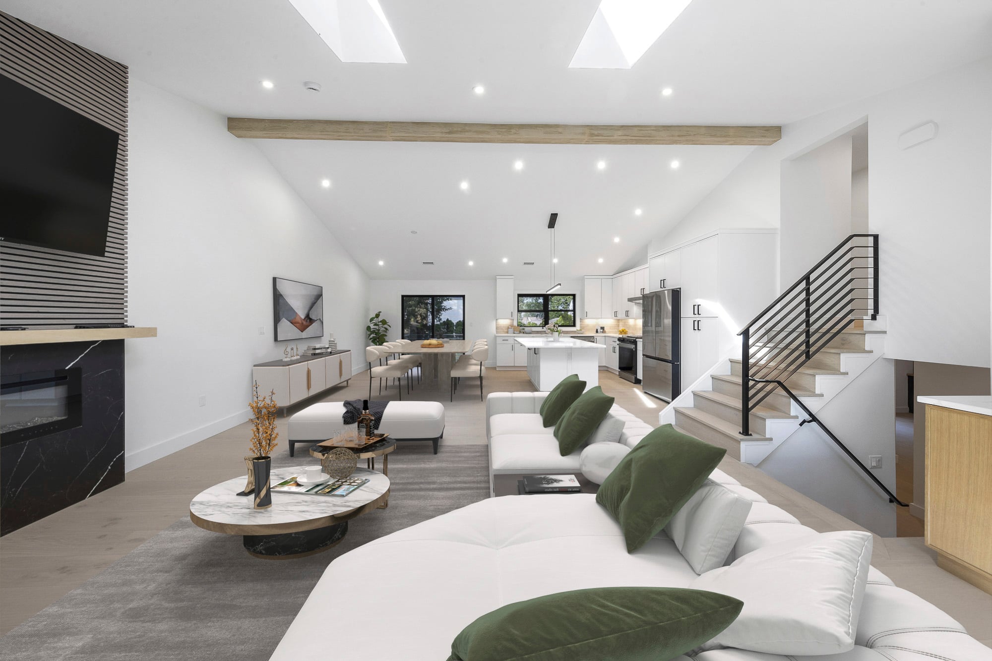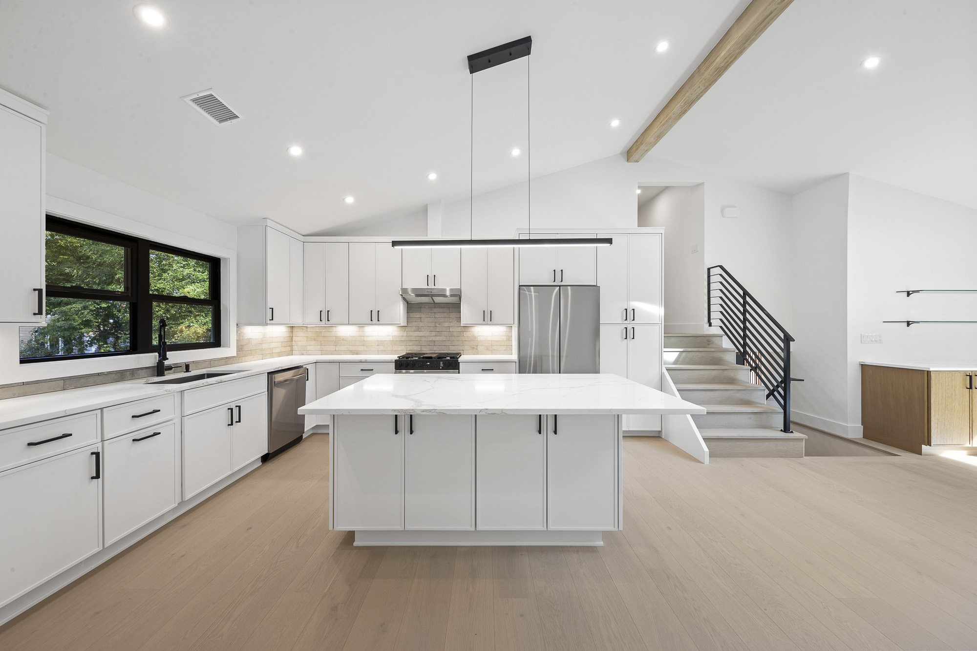 Every major component of the home has been newly completed, including a new roof, Andersen windows, HardiePlank siding, updated electrical and plumbing systems, and multi-zone HVAC. The interior features five bedrooms and four full bathrooms, with a layout designed for flexibility across all levels. White oak engineered flooring runs throughout, complemented by custom accent walls, vaulted ceilings, skylights, and integrated LED lighting that enhances natural light and overall flow.