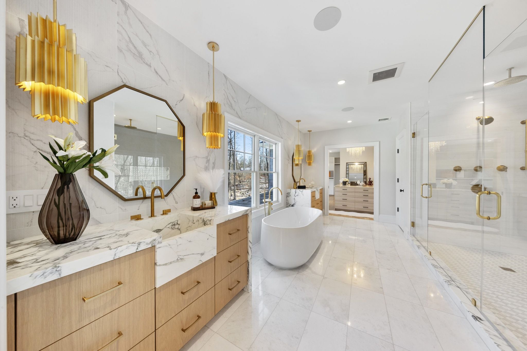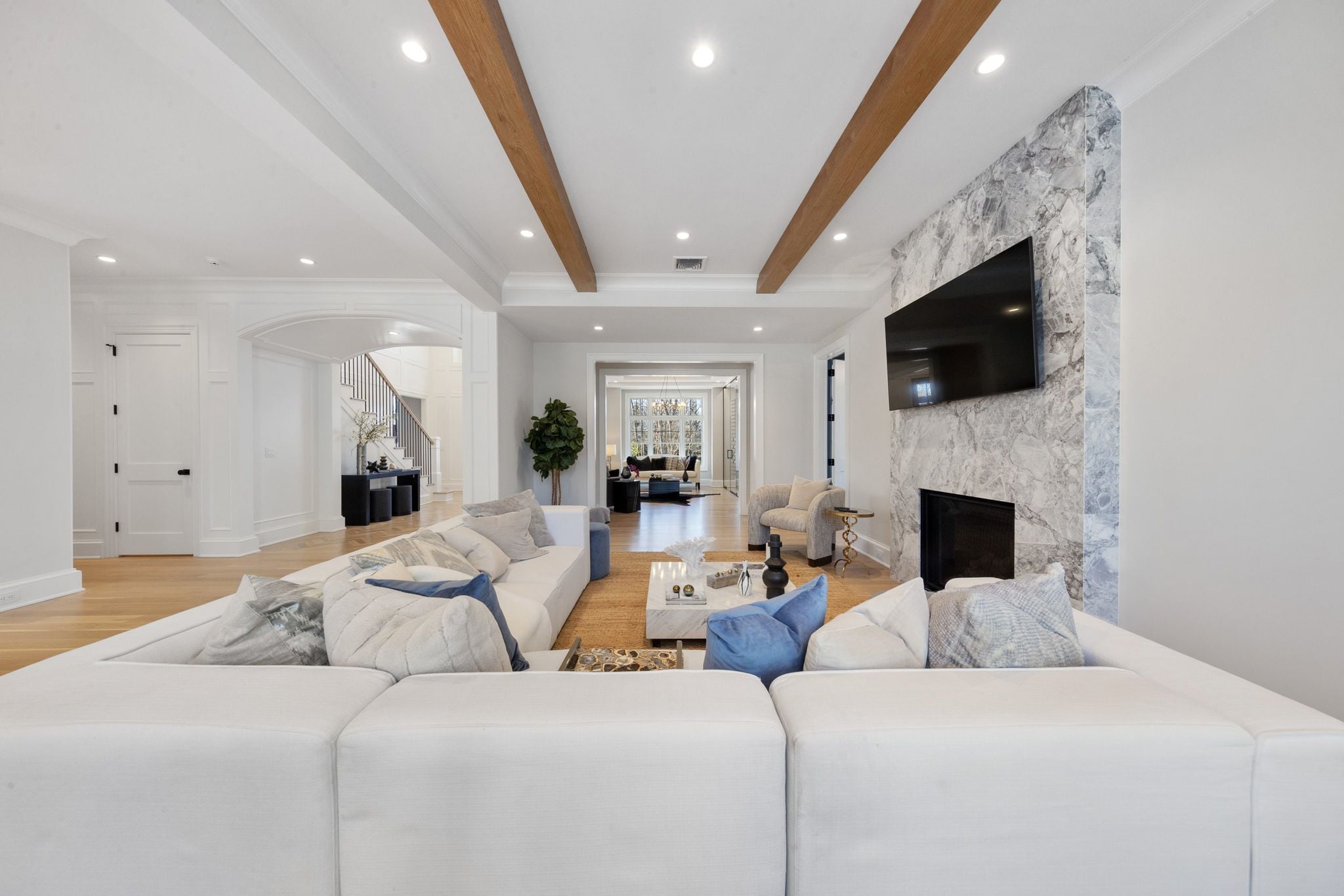 The main level is designed for both everyday living and large-scale entertaining, with a gourmet chef’s kitchen, formal living and dining rooms, private study, guest suite, sunroom, and a dramatic great room with expansive scale and natural light. Upstairs, five en-suite bedrooms include a spacious primary suite with a spa-like bath and a large bonus room offering flexibility for additional living or recreation space.
