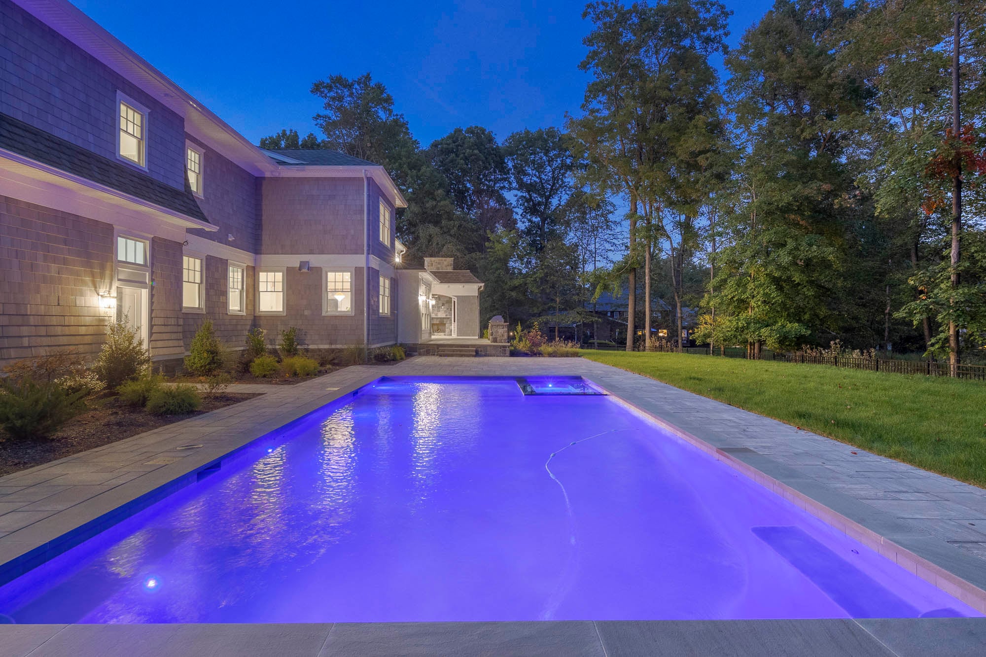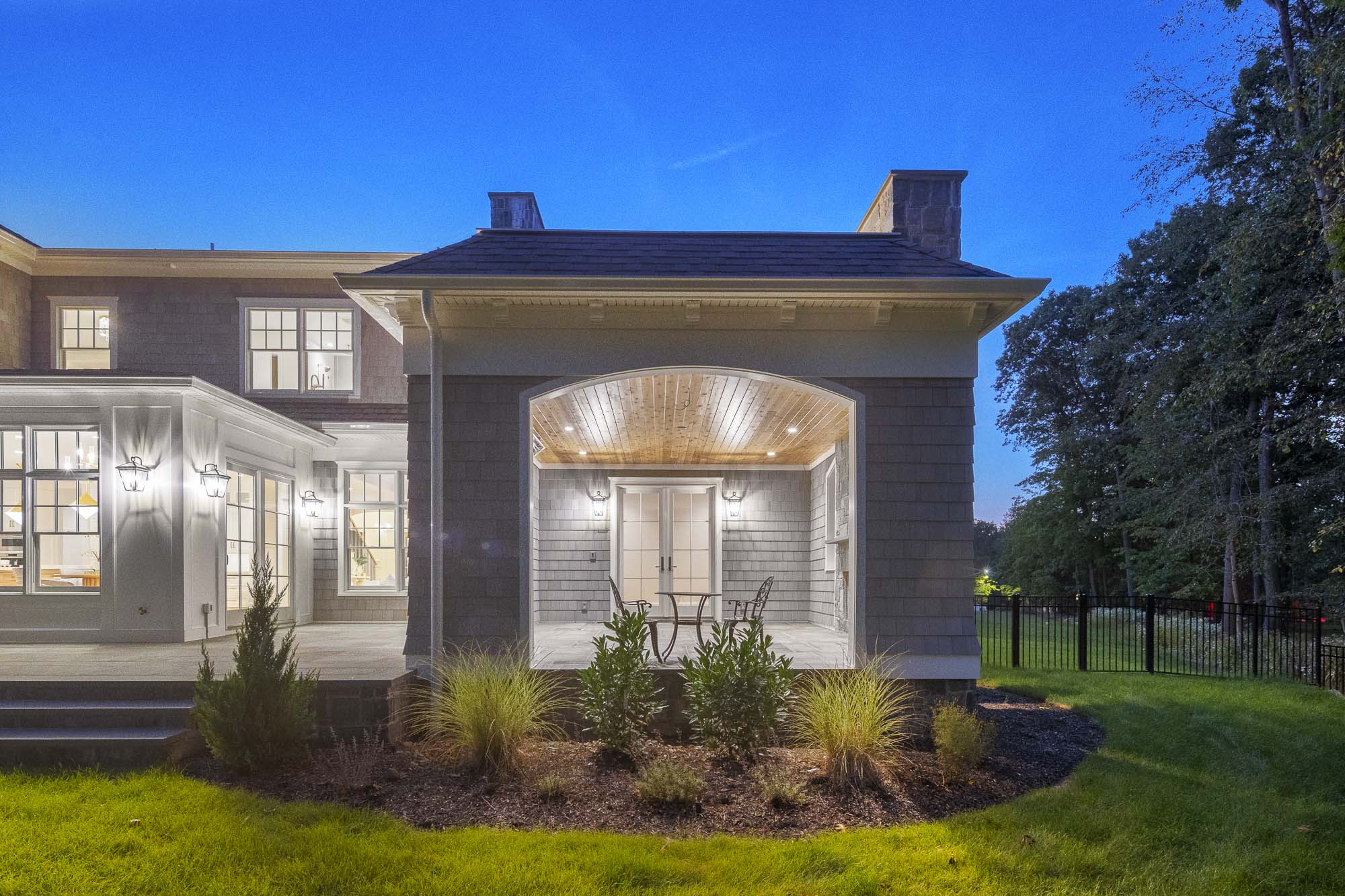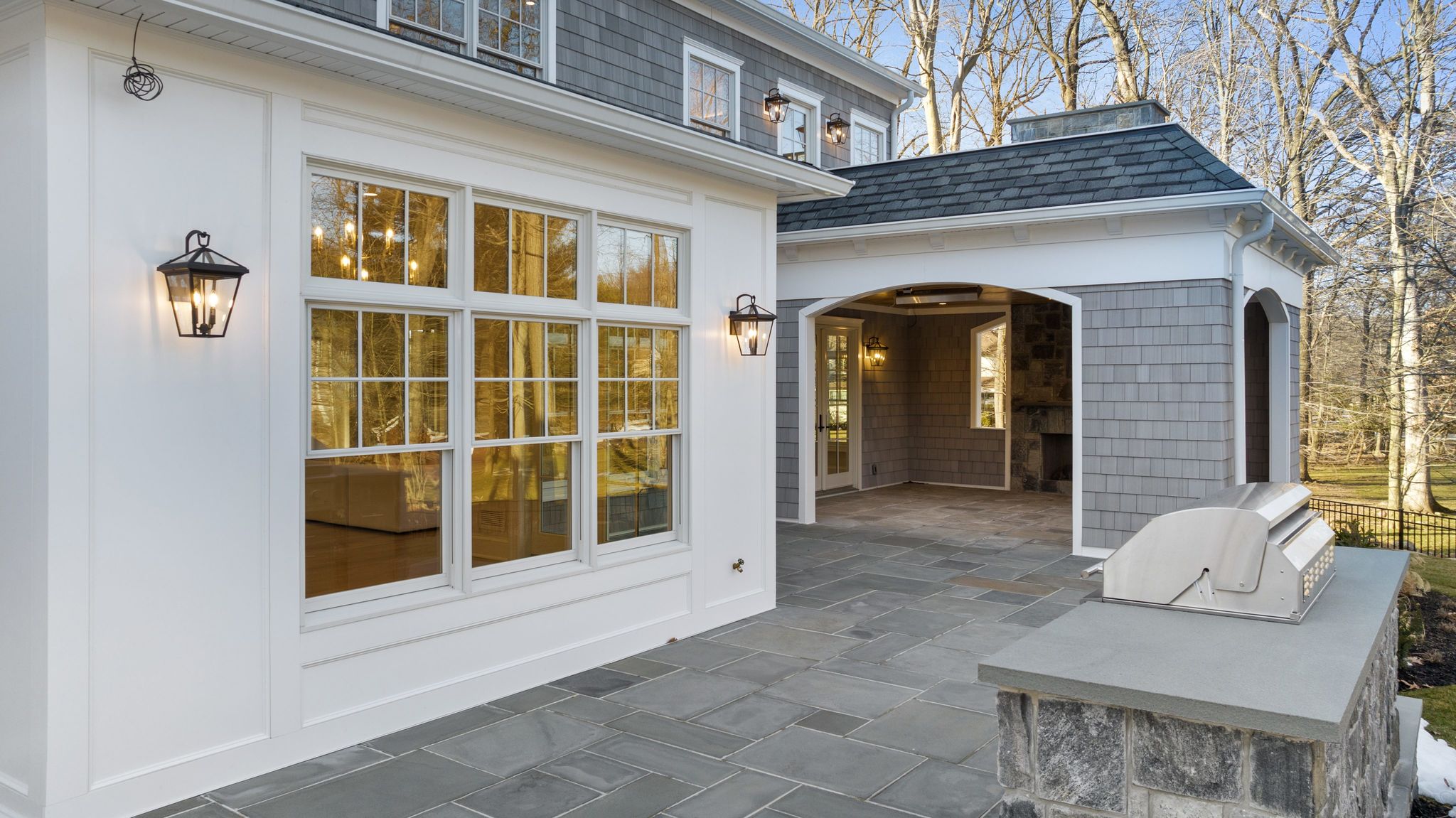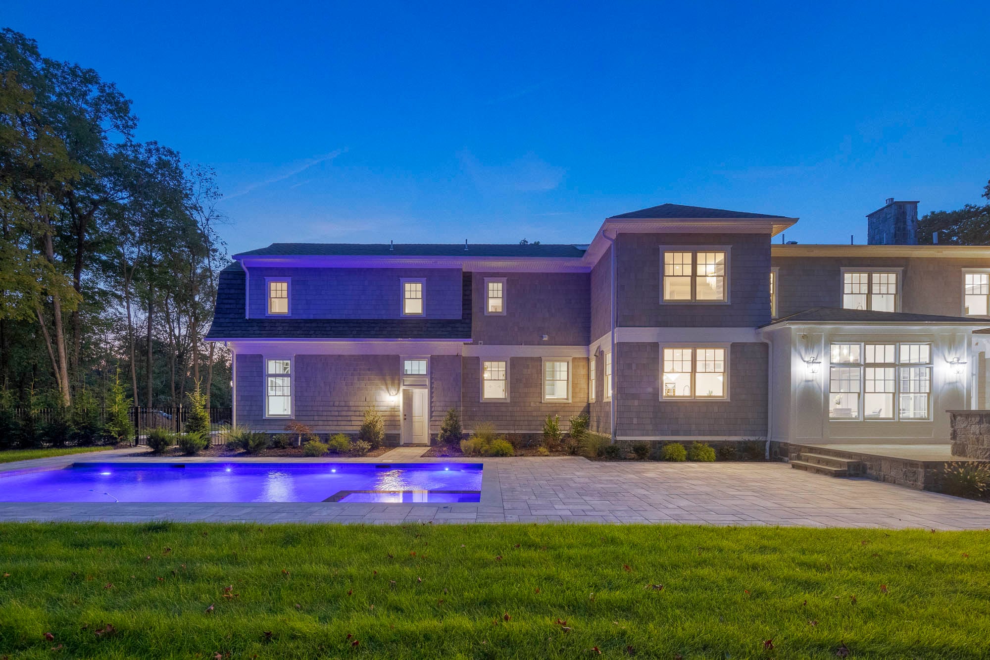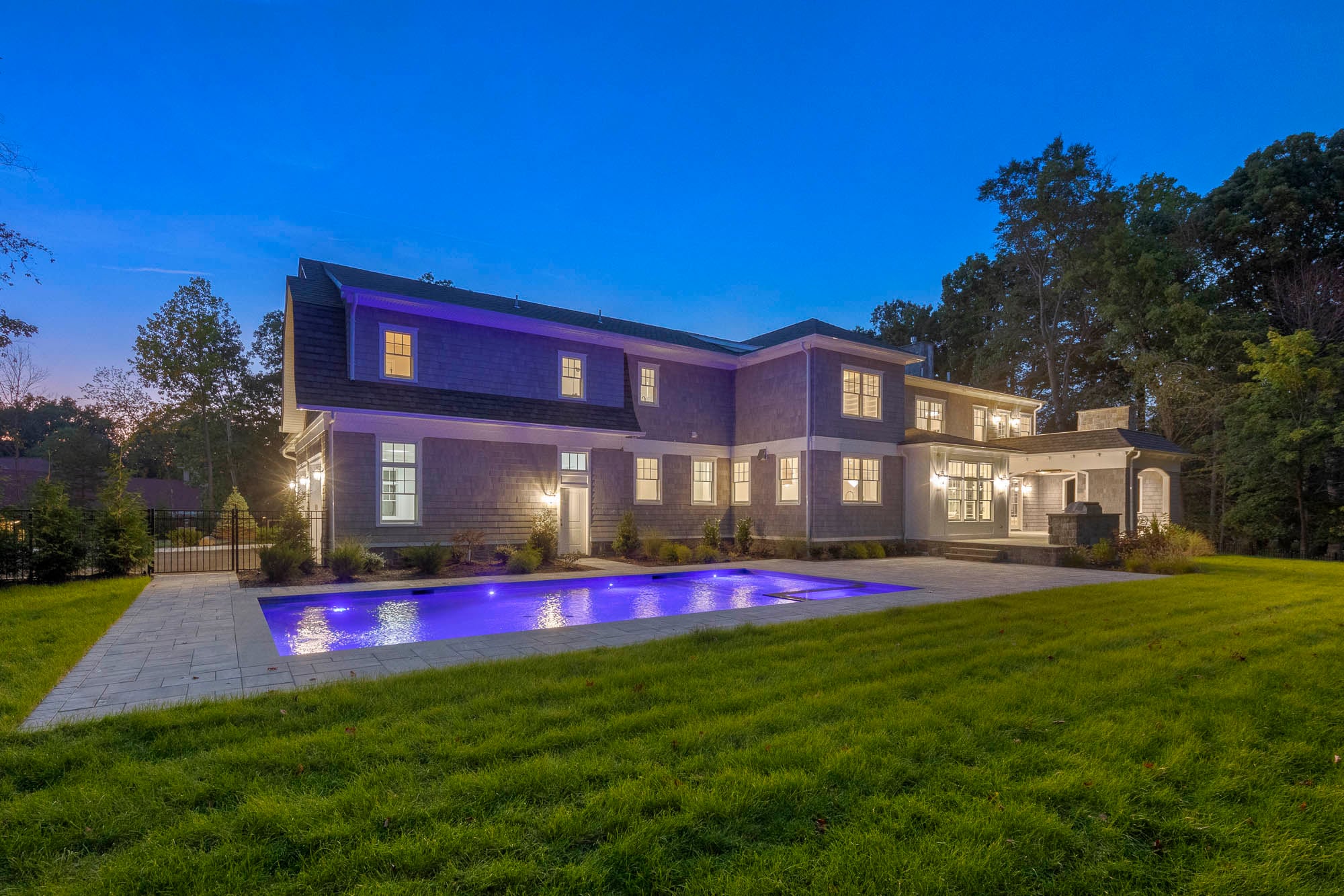 The fully finished lower level enhances the home’s functionality with a family room, private theater, fitness center, and nanny or guest quarters. Outdoor living is equally well-appointed, featuring a bluestone patio, outdoor kitchen, covered porch with gas fireplace, and a heated saltwater gunite pool with spa and sun deck—creating a private, resort-style setting.