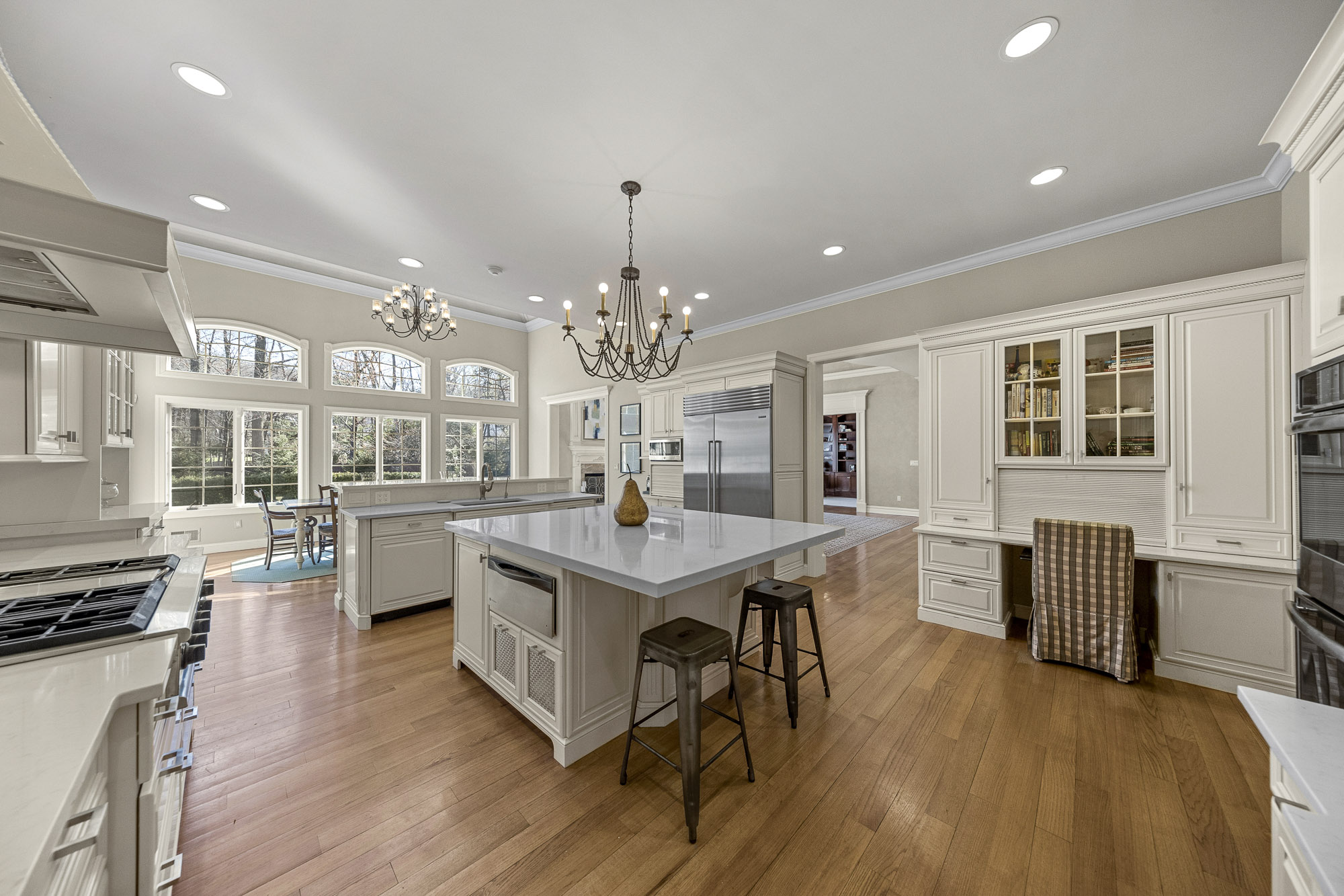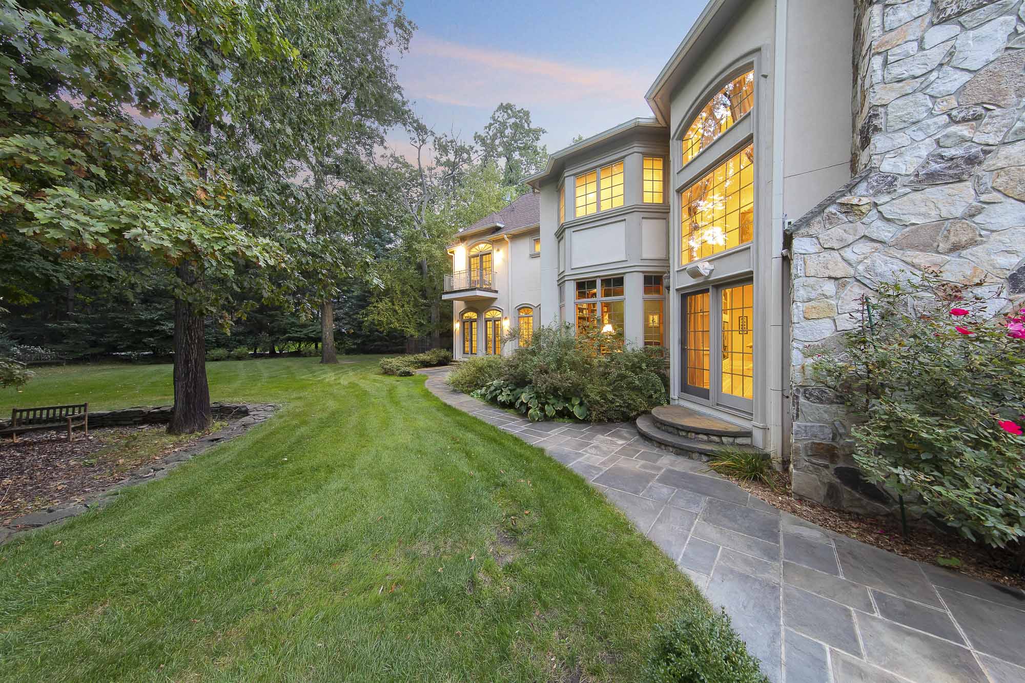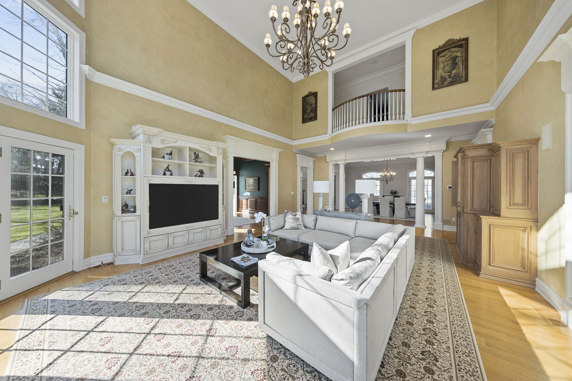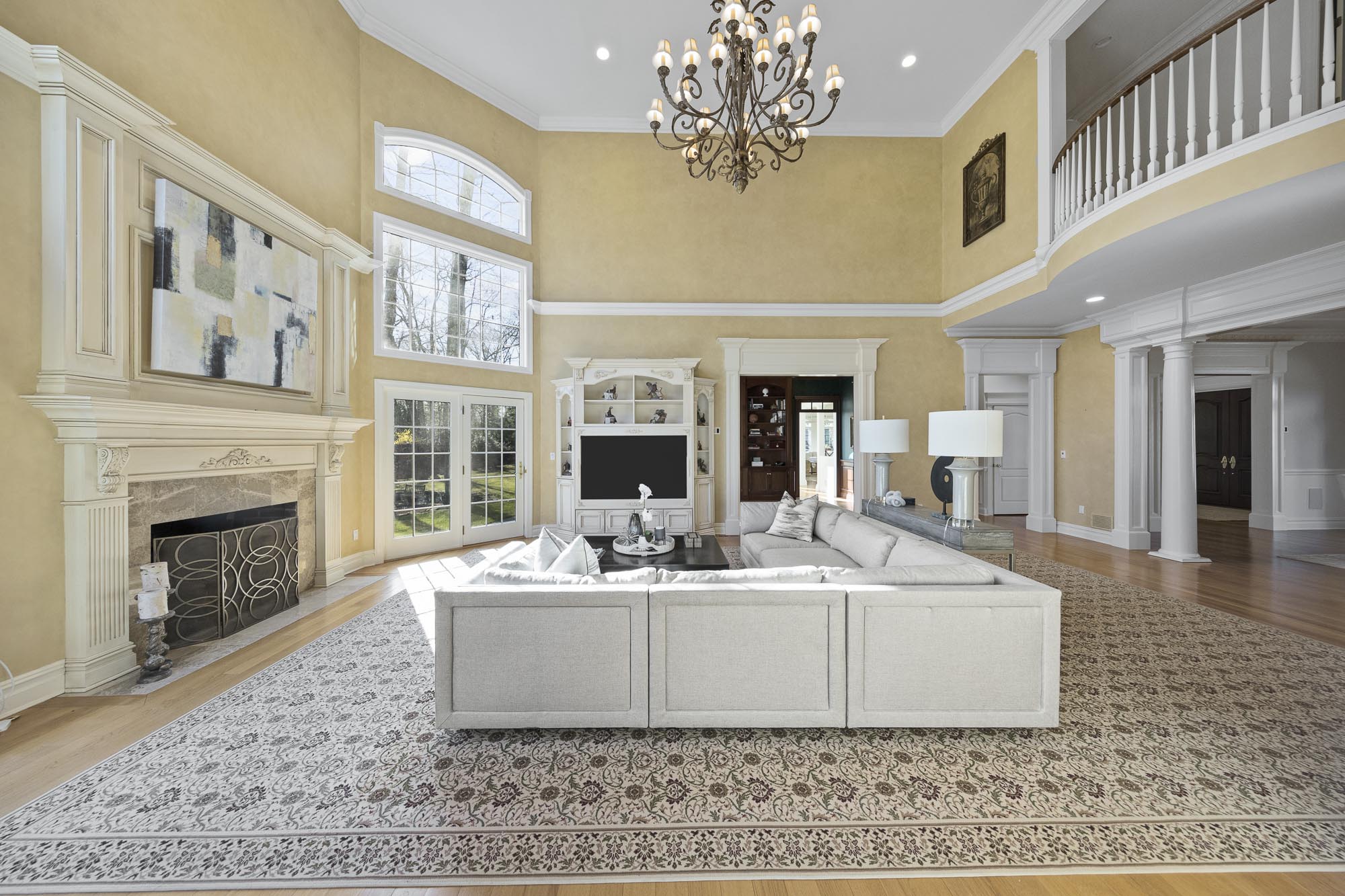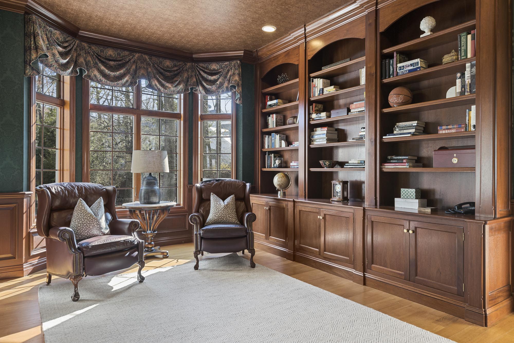 This 7,500 sq ft home features 5–6 bedrooms, 6 baths, two home offices, a remodeled chef’s kitchen, a dramatic great room, banquet-size dining room, and a full lower level with theater, gym, sauna bath, game room, and music studio.