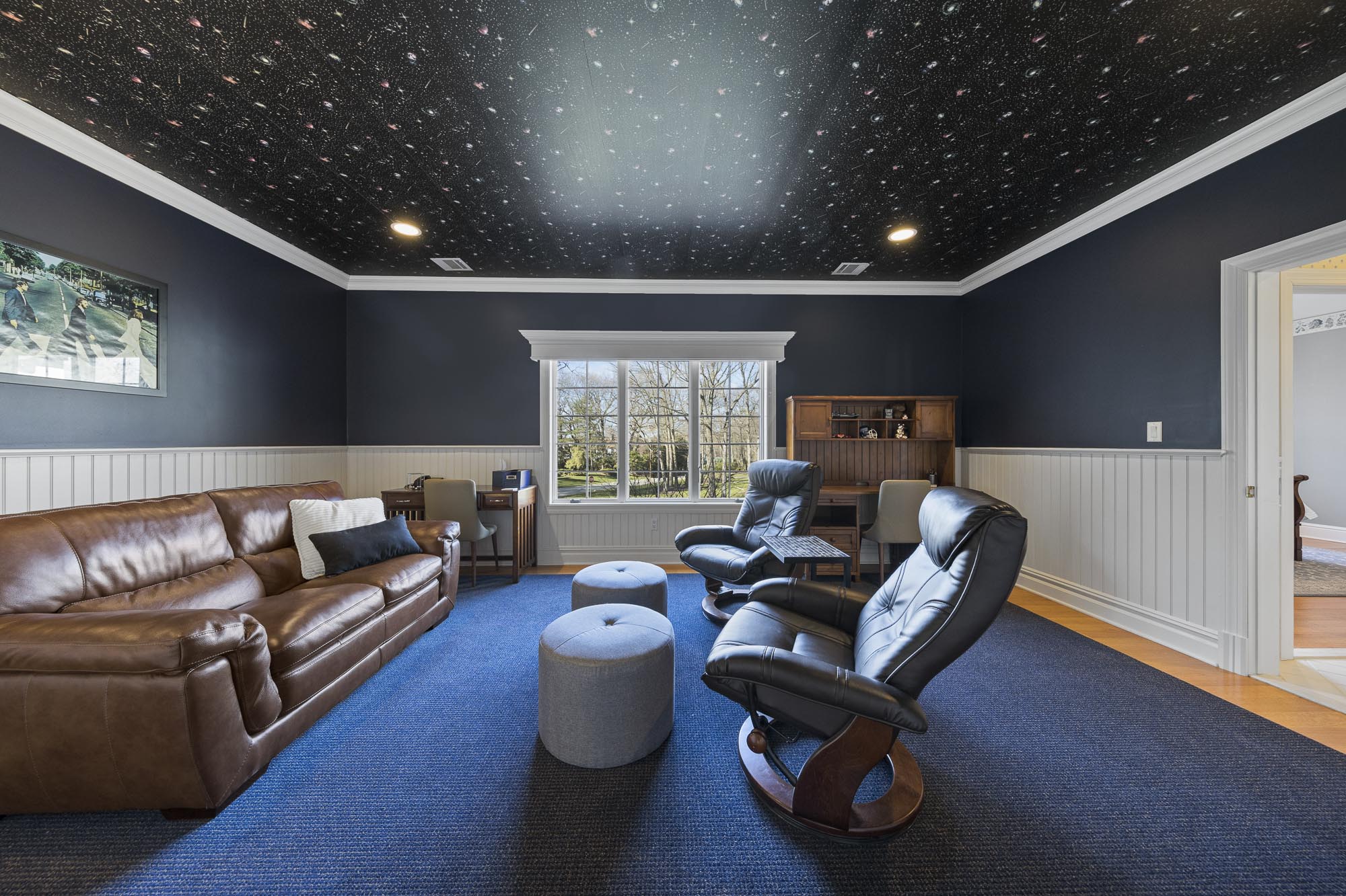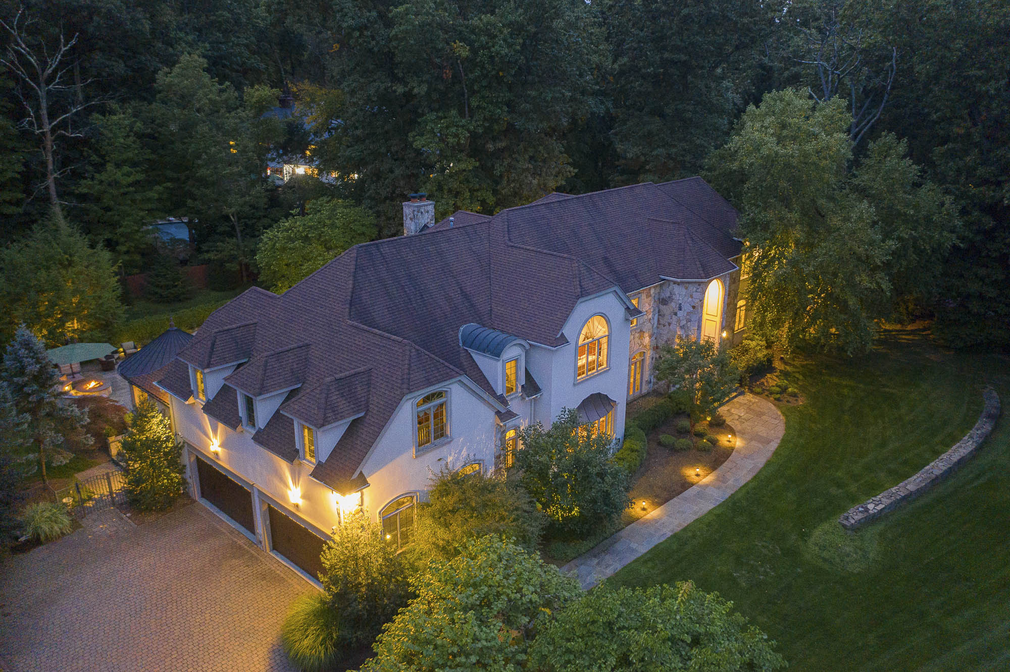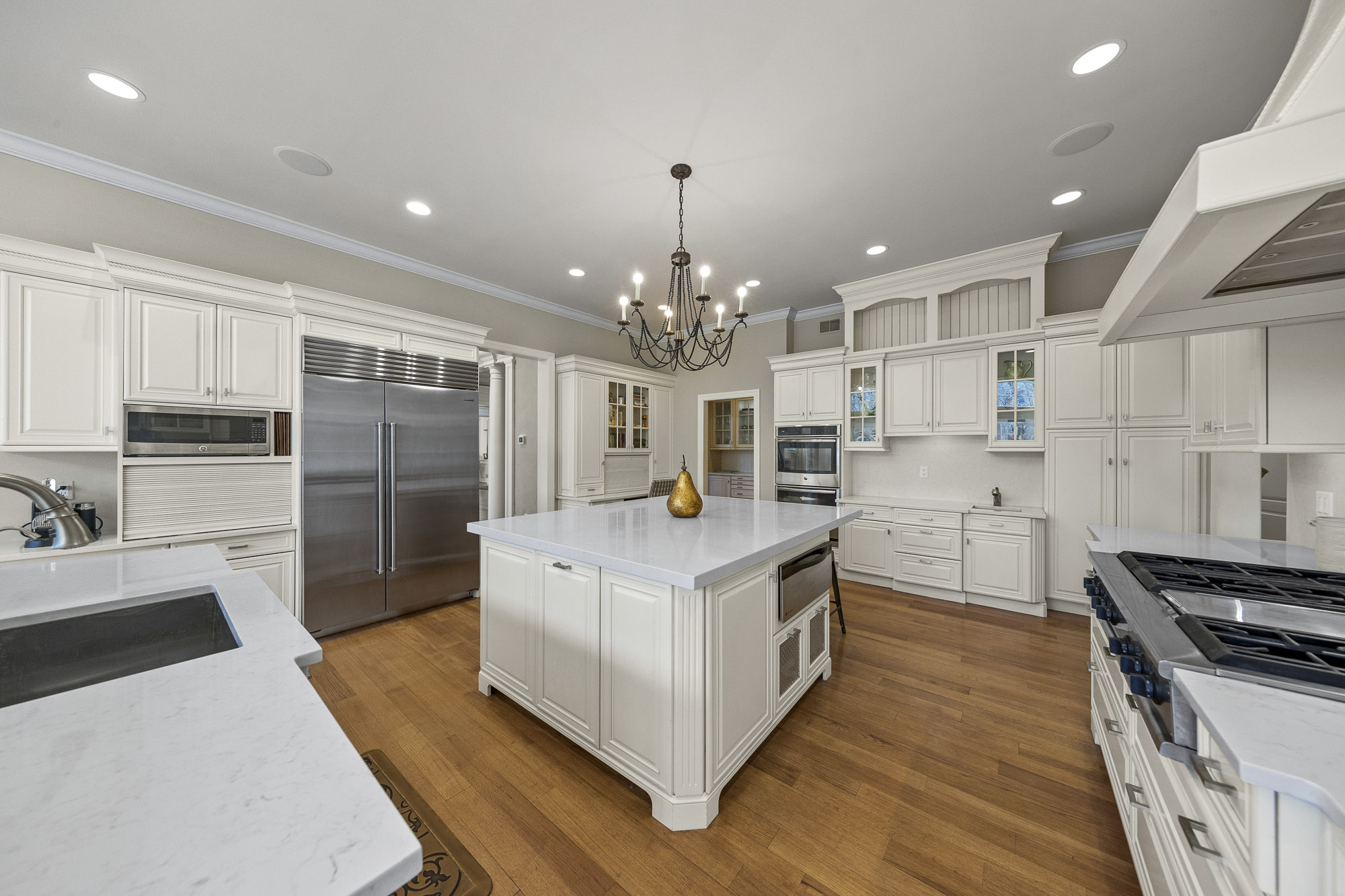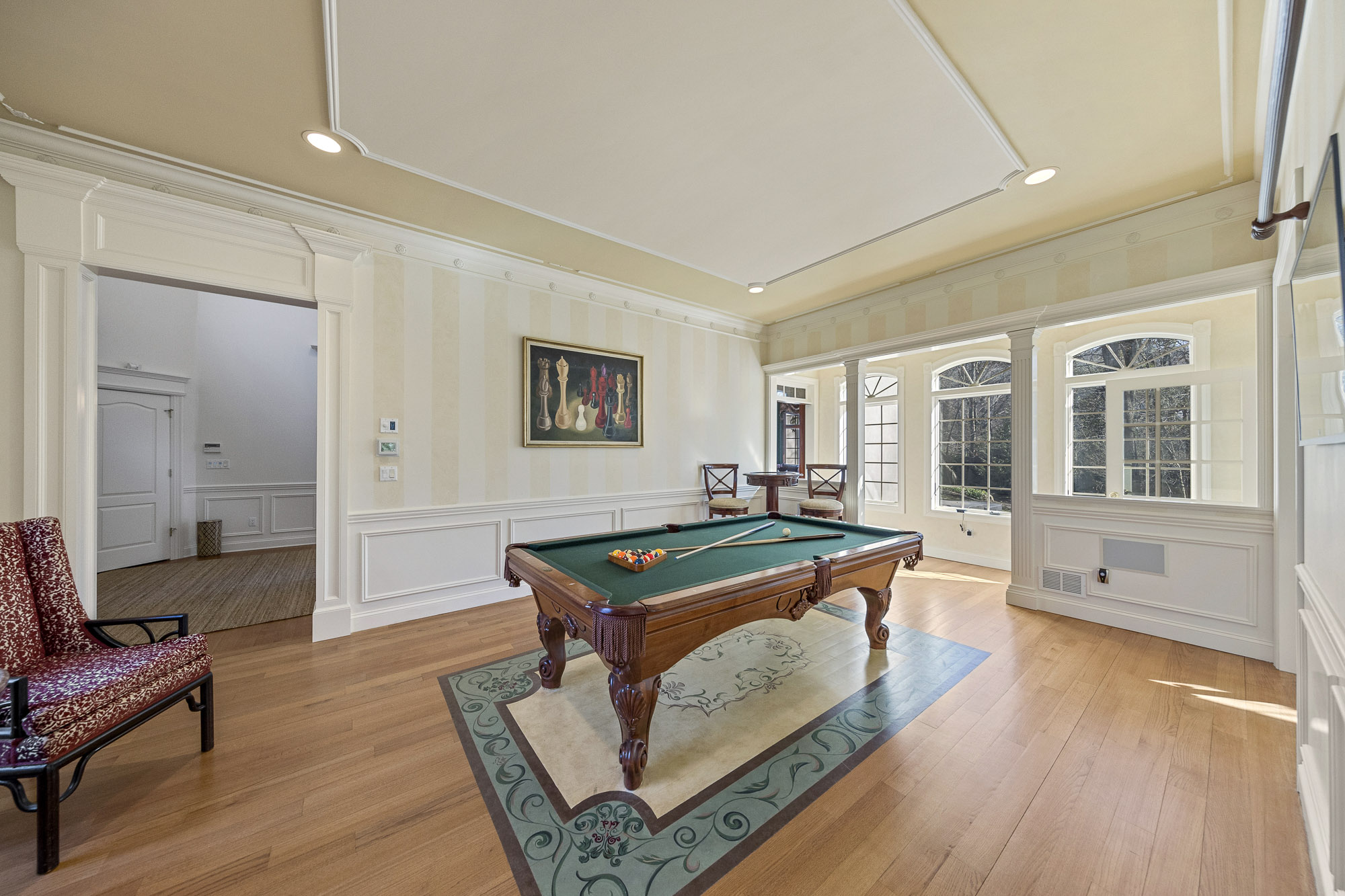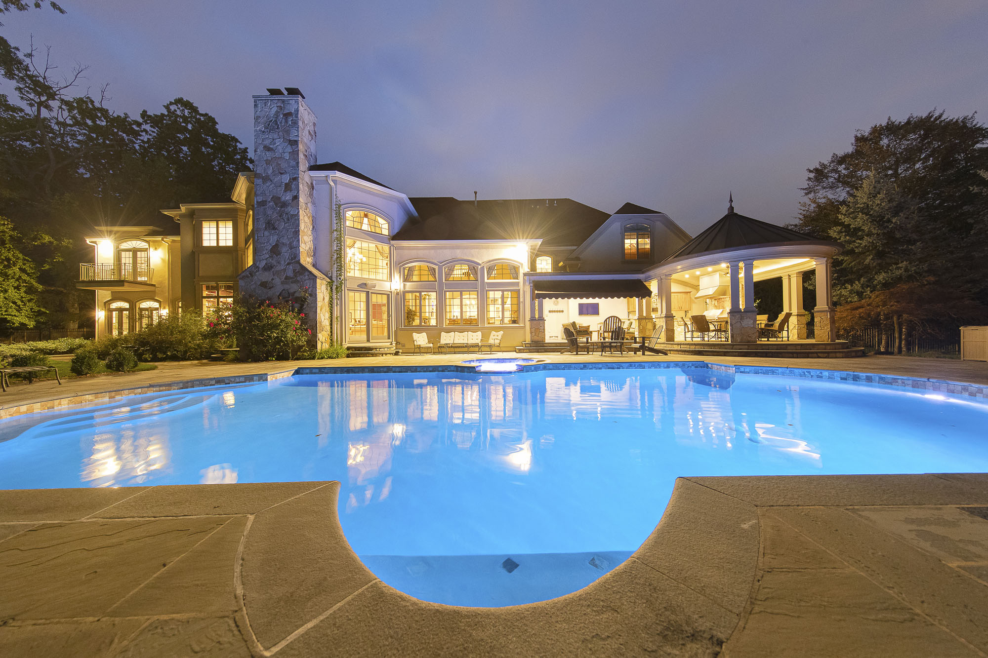 This 7,500 sq ft home features 5–6 bedrooms, 6 baths, two home offices, a remodeled chef’s kitchen, a dramatic great room, banquet-size dining room, and a full lower level with theater, gym, sauna bath, game room, and music studio.