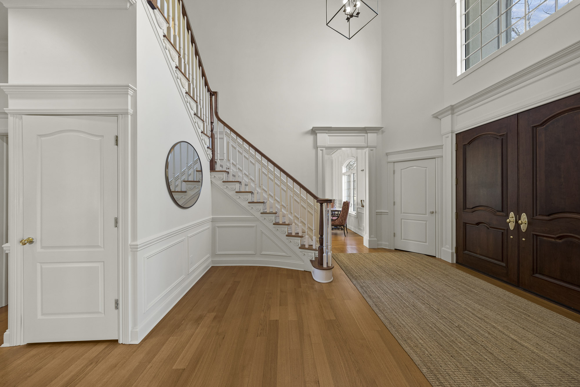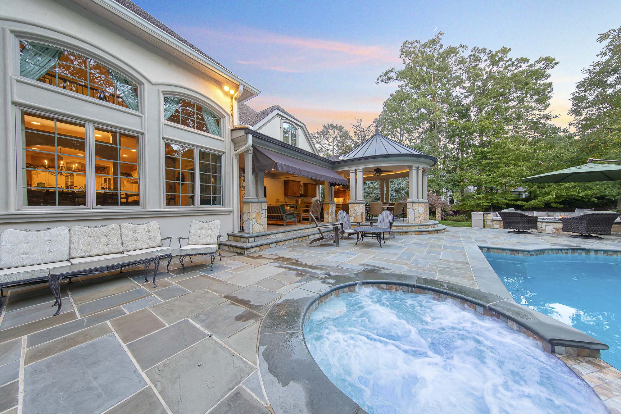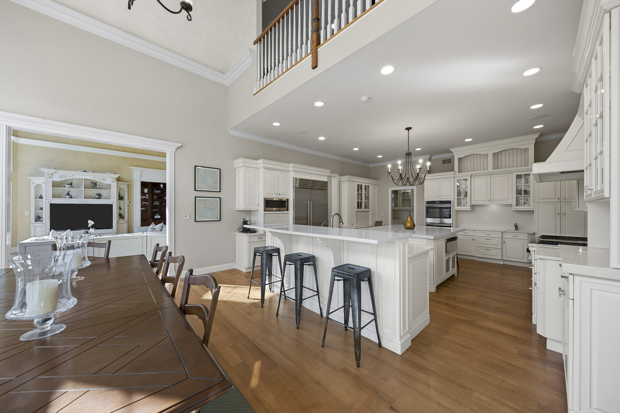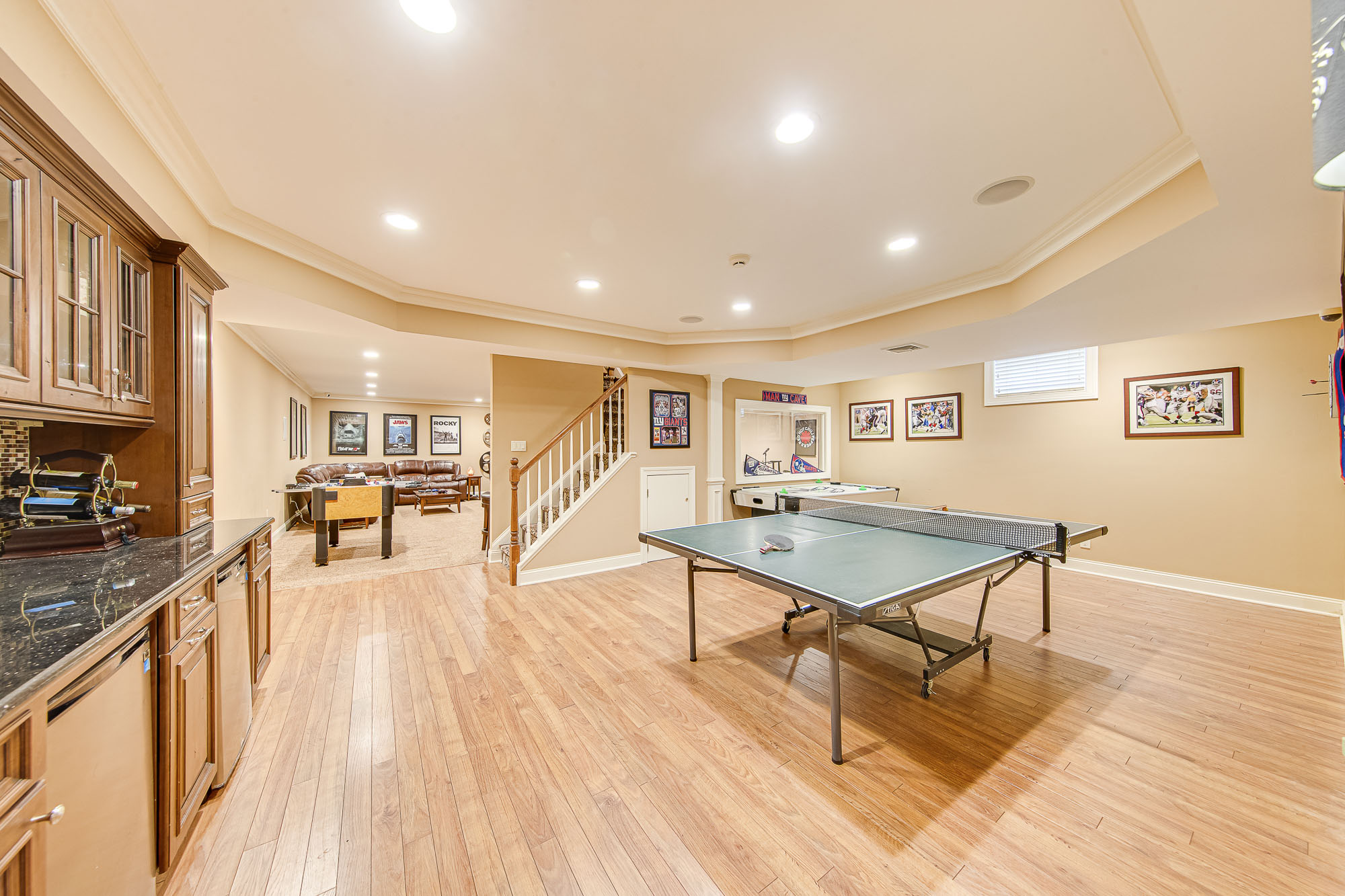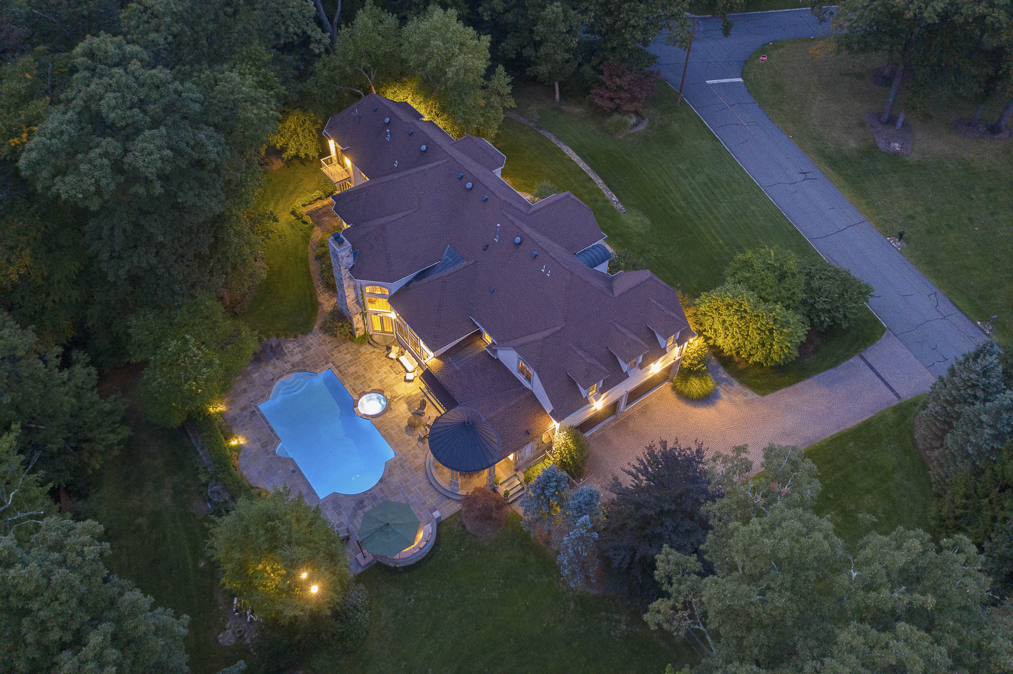 This 7,500 sq ft home features 5–6 bedrooms, 6 baths, two home offices, a remodeled chef’s kitchen, a dramatic great room, banquet-size dining room, and a full lower level with theater, gym, sauna bath, game room, and music studio.