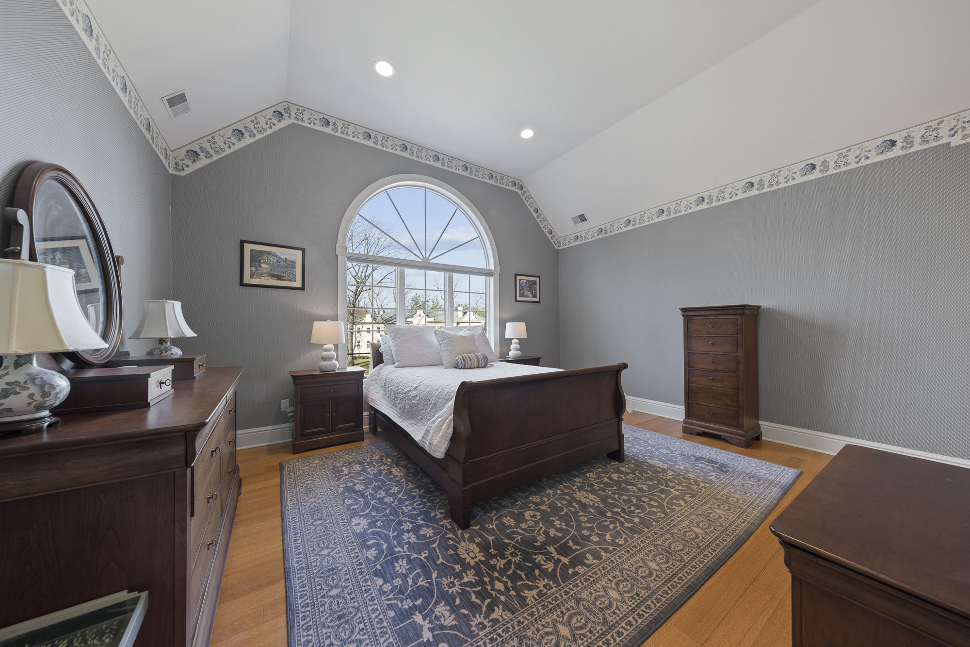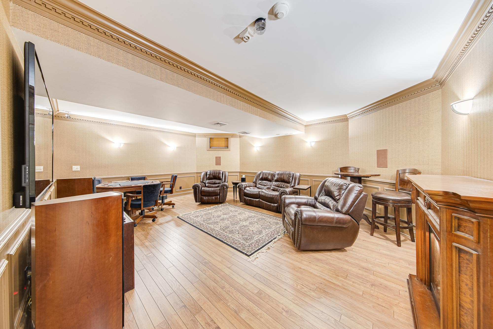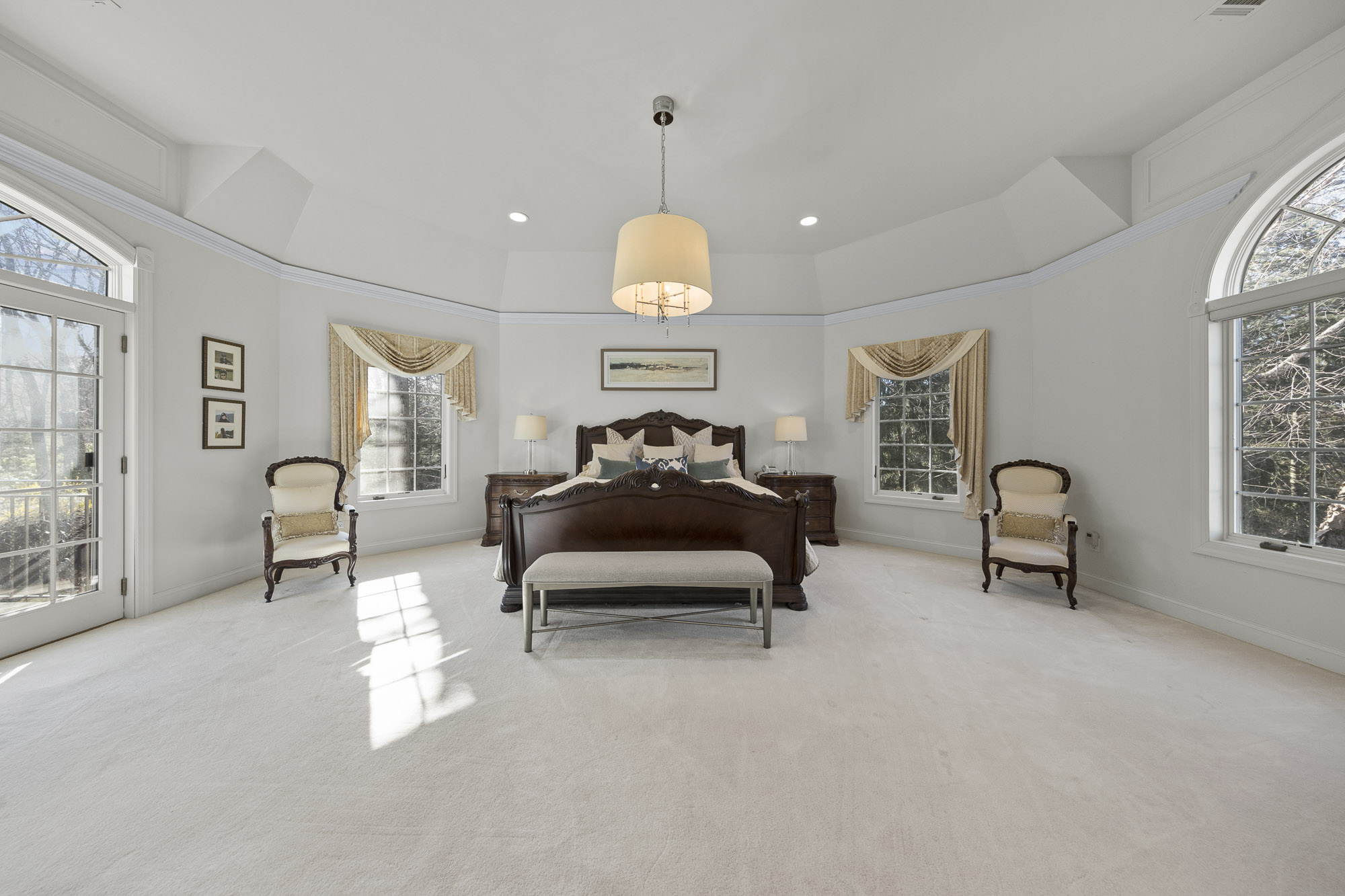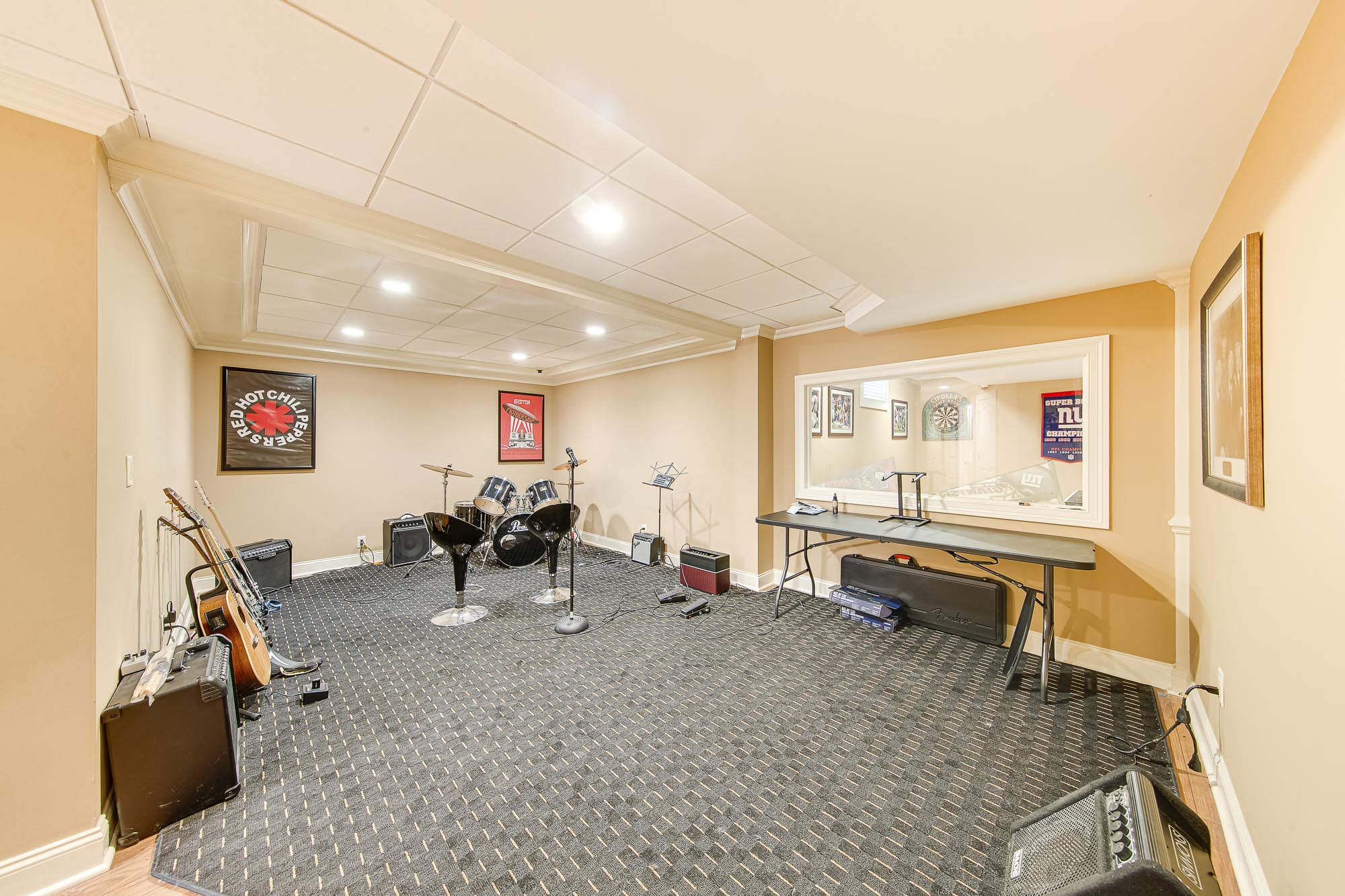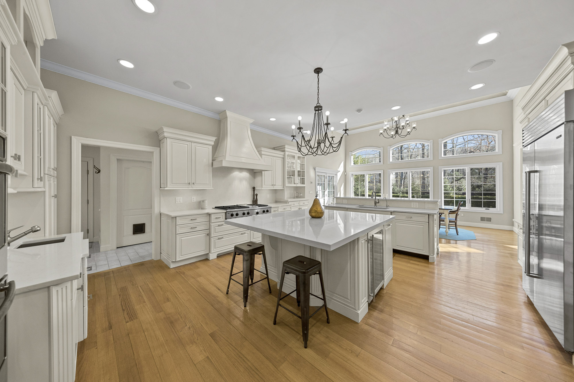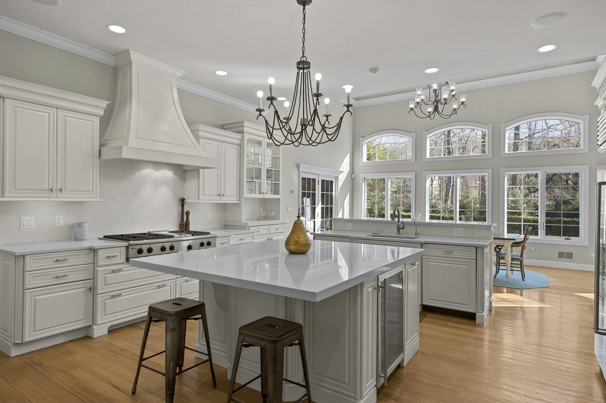 This 7,500 sq ft home features 5–6 bedrooms, 6 baths, two home offices, a remodeled chef’s kitchen, a dramatic great room, banquet-size dining room, and a full lower level with theater, gym, sauna bath, game room, and music studio.