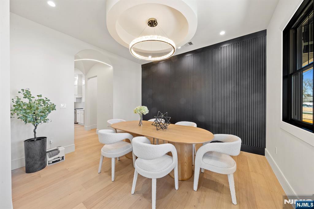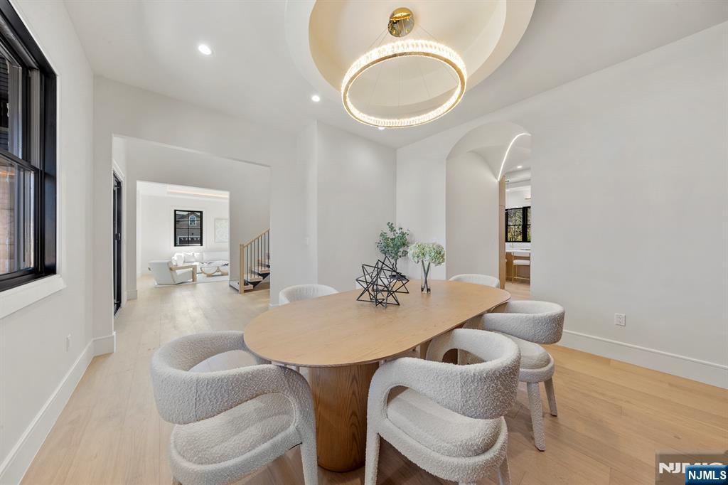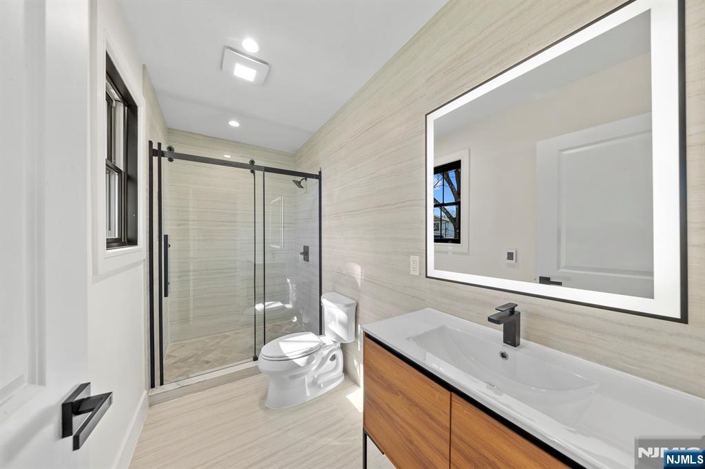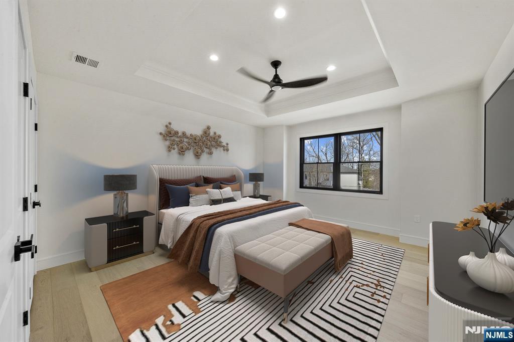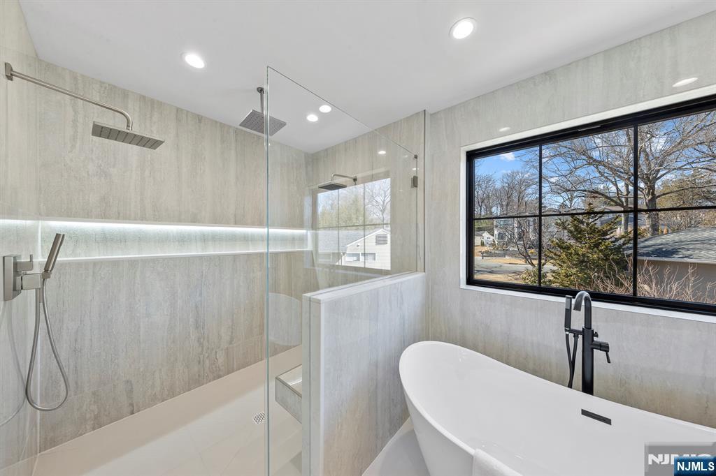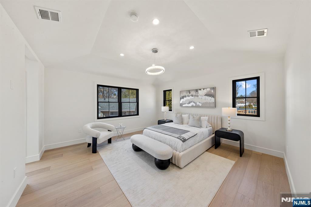 Located on the highly sought East side of Paramus, is charming new construction, w/ European inspired front porch & European white stone & black accents throughout . This local builder has an established keen eye for detail throughout the home. Modern refinement throughout w/ oversized front entry glass pivot door, soaring 20aEUR(tm) entry ceiling, floating steel & wood slab stairs, & double sided modern linear fireplace. The wide plank white oak floors carried create a feel of opulence. Custom White oak cabinetry kitchen w/ a soft stone countertop. 1st floor en suite guest bedroom . Ceiling details are carried throughout the massive bedrooms upstairs, all full w/ extra closet spaces . A grand upstairs hallway carries you to the Master Suite w/ oversized walk in closets w/ custom finishes, Juliet balcony, & the full en-suite w/ double vanity, a soaking tub, & custom shower. The VIRTUAL TOUR link contains a comprehensive video tour, floor plans, & complete interactive 3D model of the home.